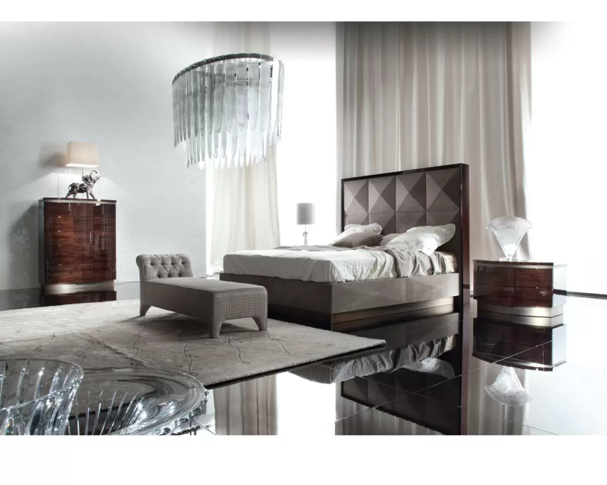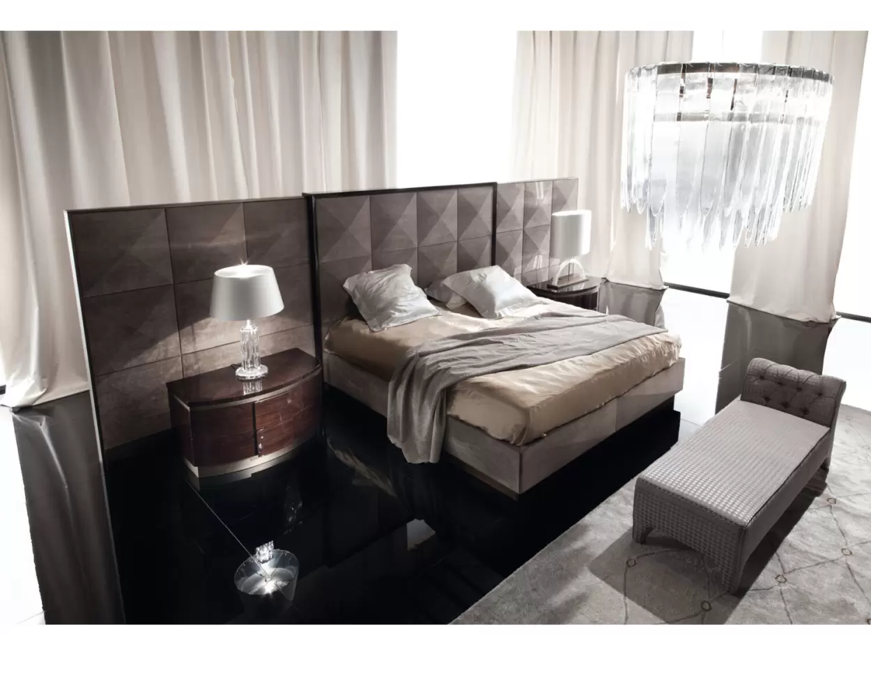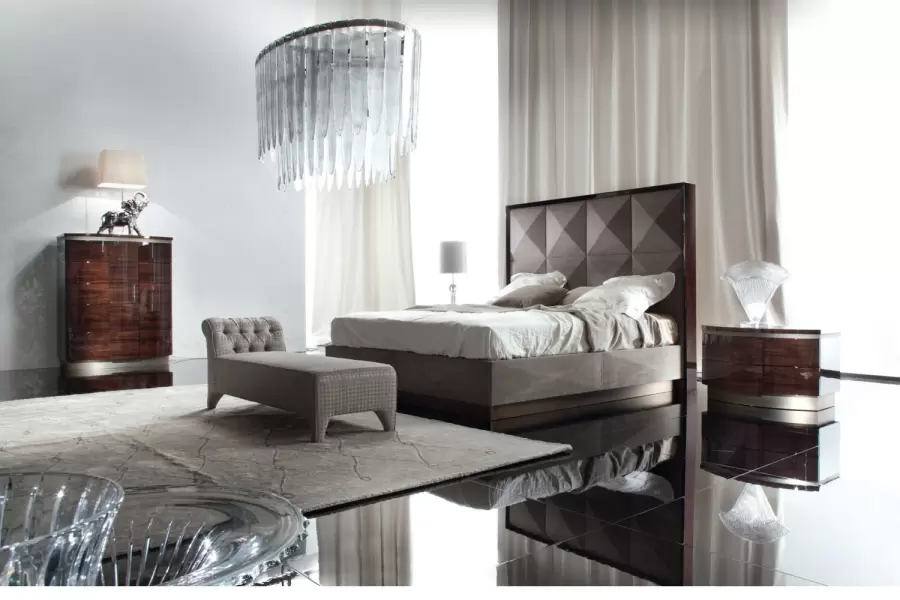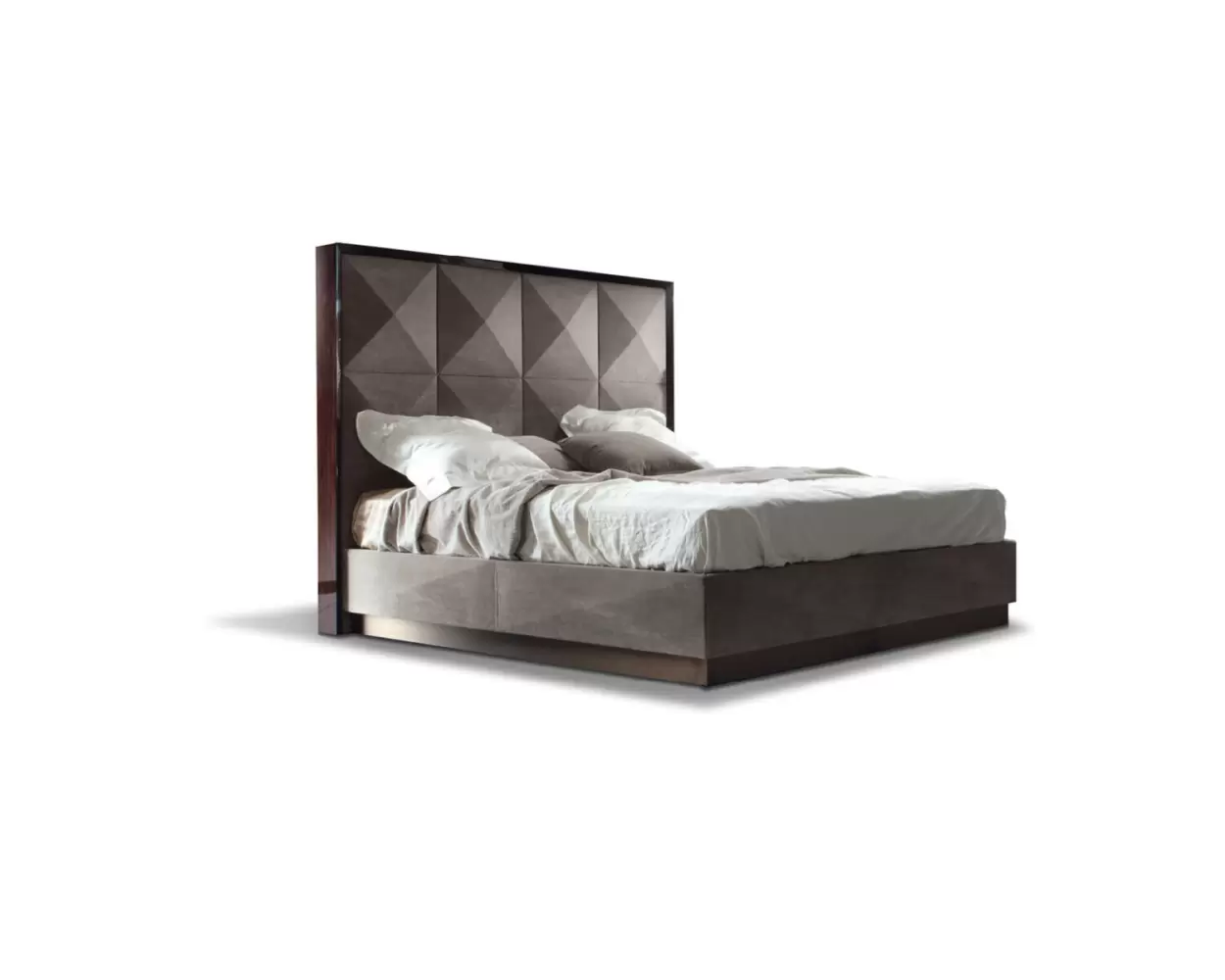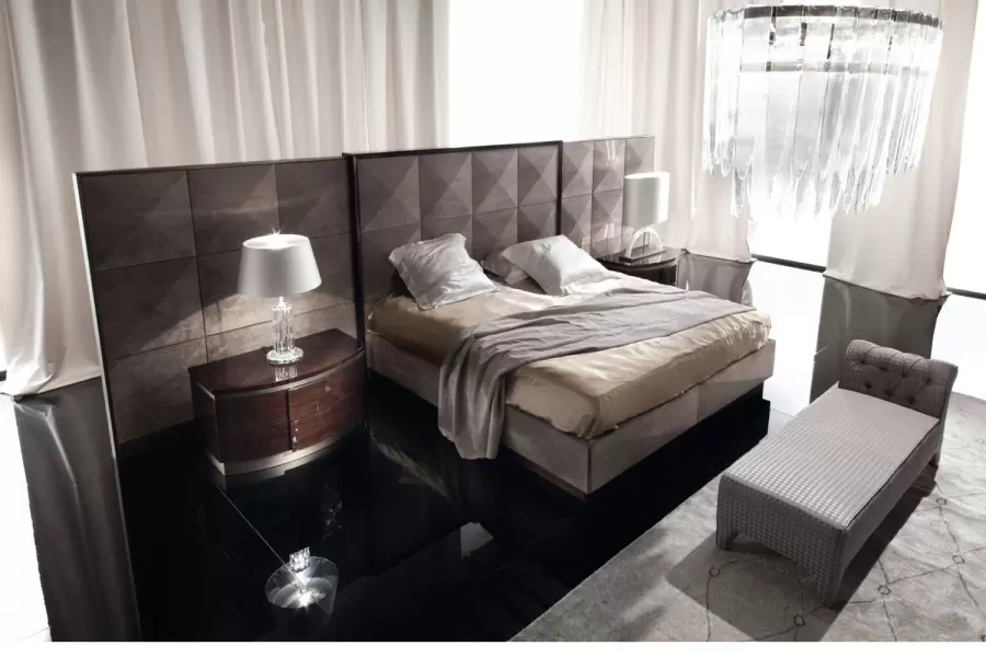 Upholstered bed with frames in Brazilian rosewood veneer with high gloss