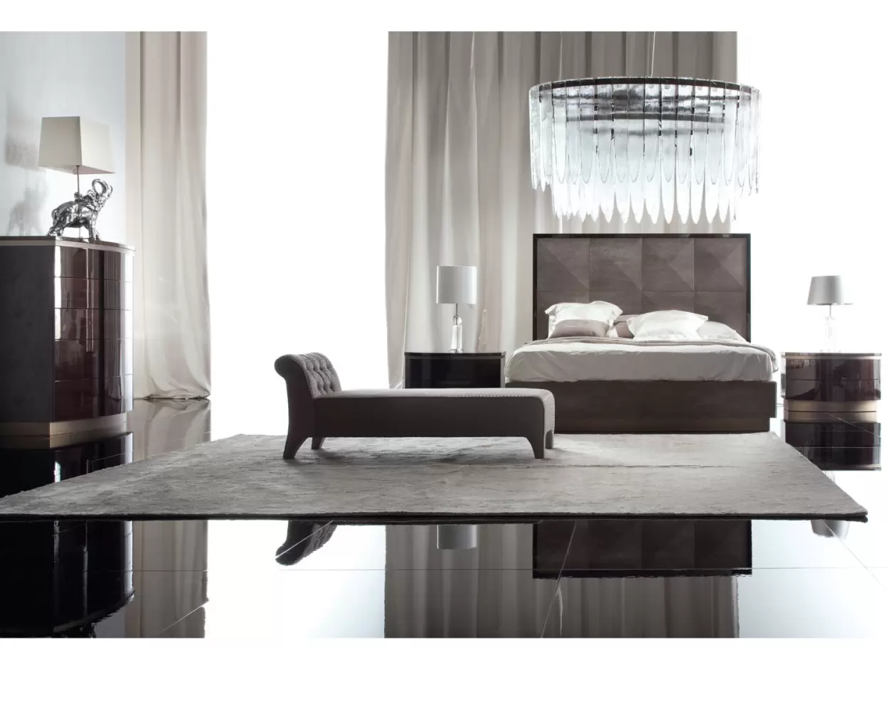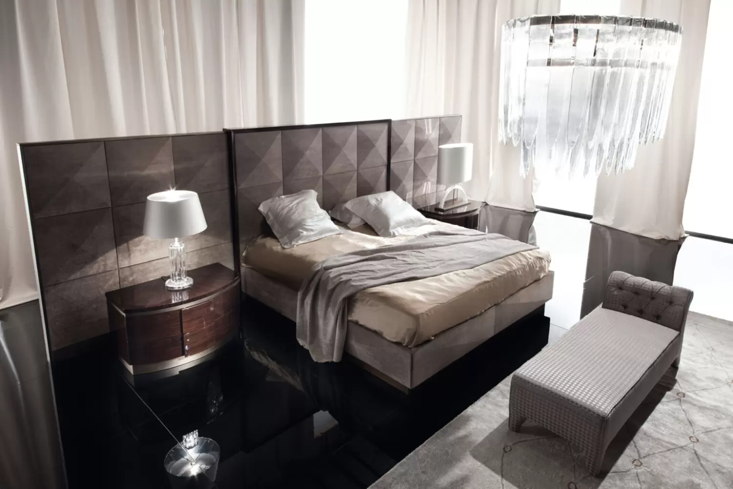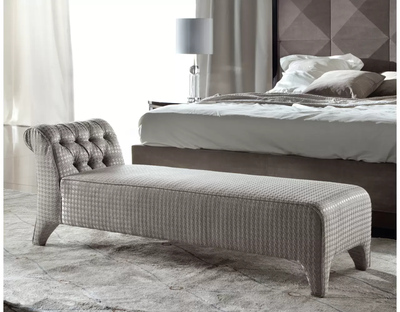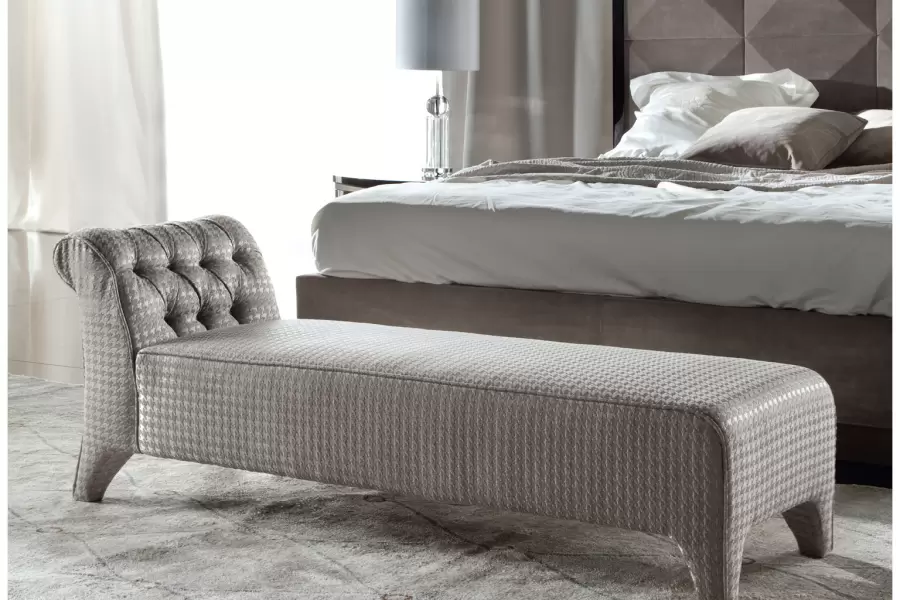 Coliseum Bench Upholstered bench with buttoned back, available in first grade leather, nabuk leather, velvet, velour or suede fabric. Measurements Art. 1835 Size: cm 164W x 52D x 62H Size: 64″½ W x 20″ ½D x 24’’ ½H