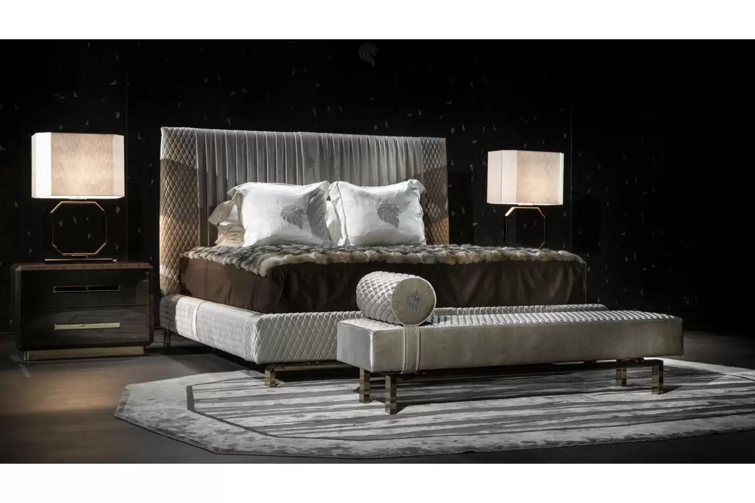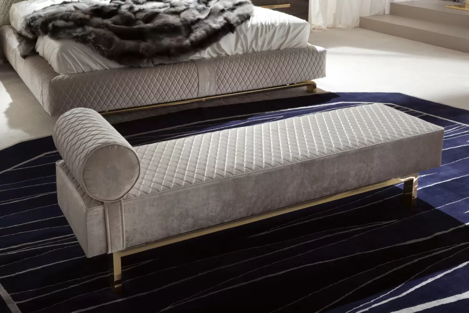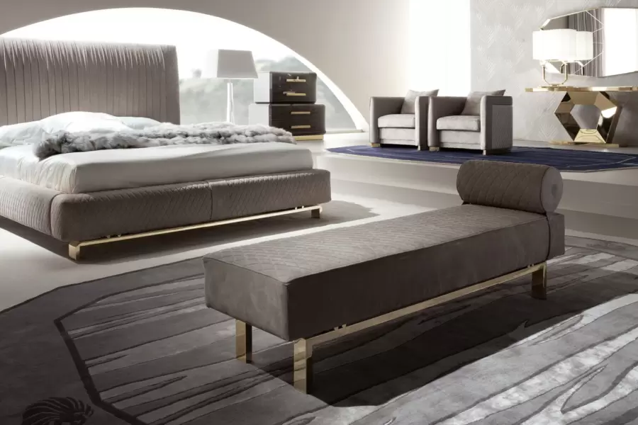 Upholstered bench with Giorgio Collection logo available in first grade leather, nubuk leather, lizard printed leather, velvet or suede fabric.