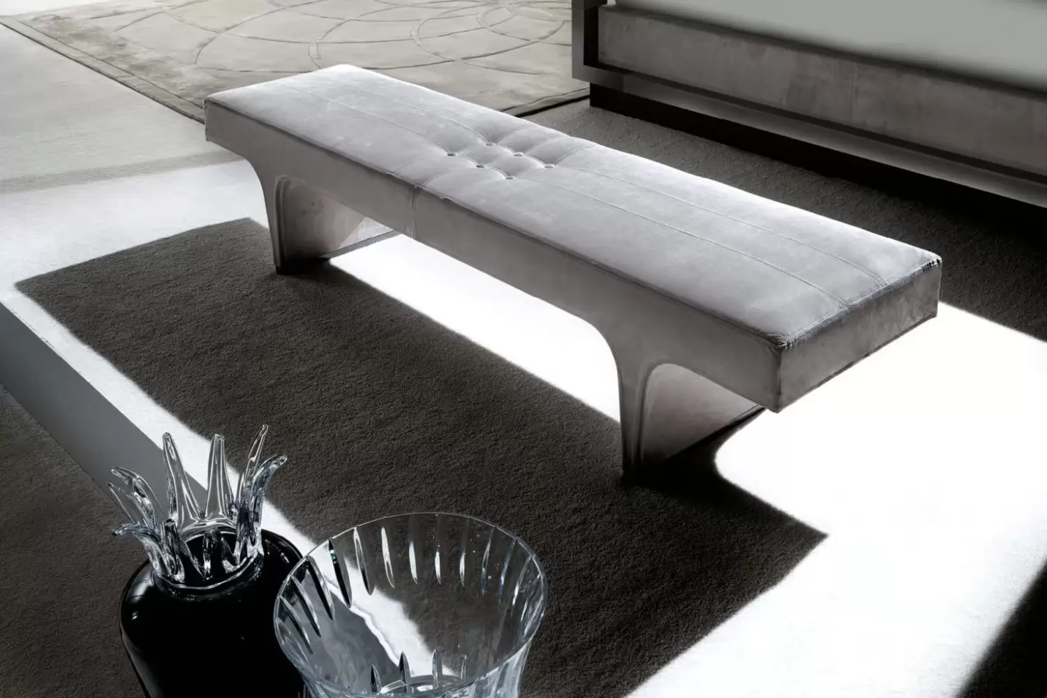Add a touch of elegance to your space with our upholstered Vision Bench, available in a variety of luxurious materials including lizard-printed leather, first-grade leather, nubuck leather, velvet, velour, or suede fabrics.