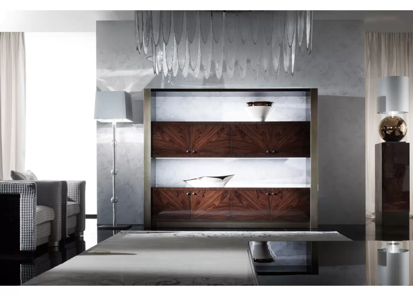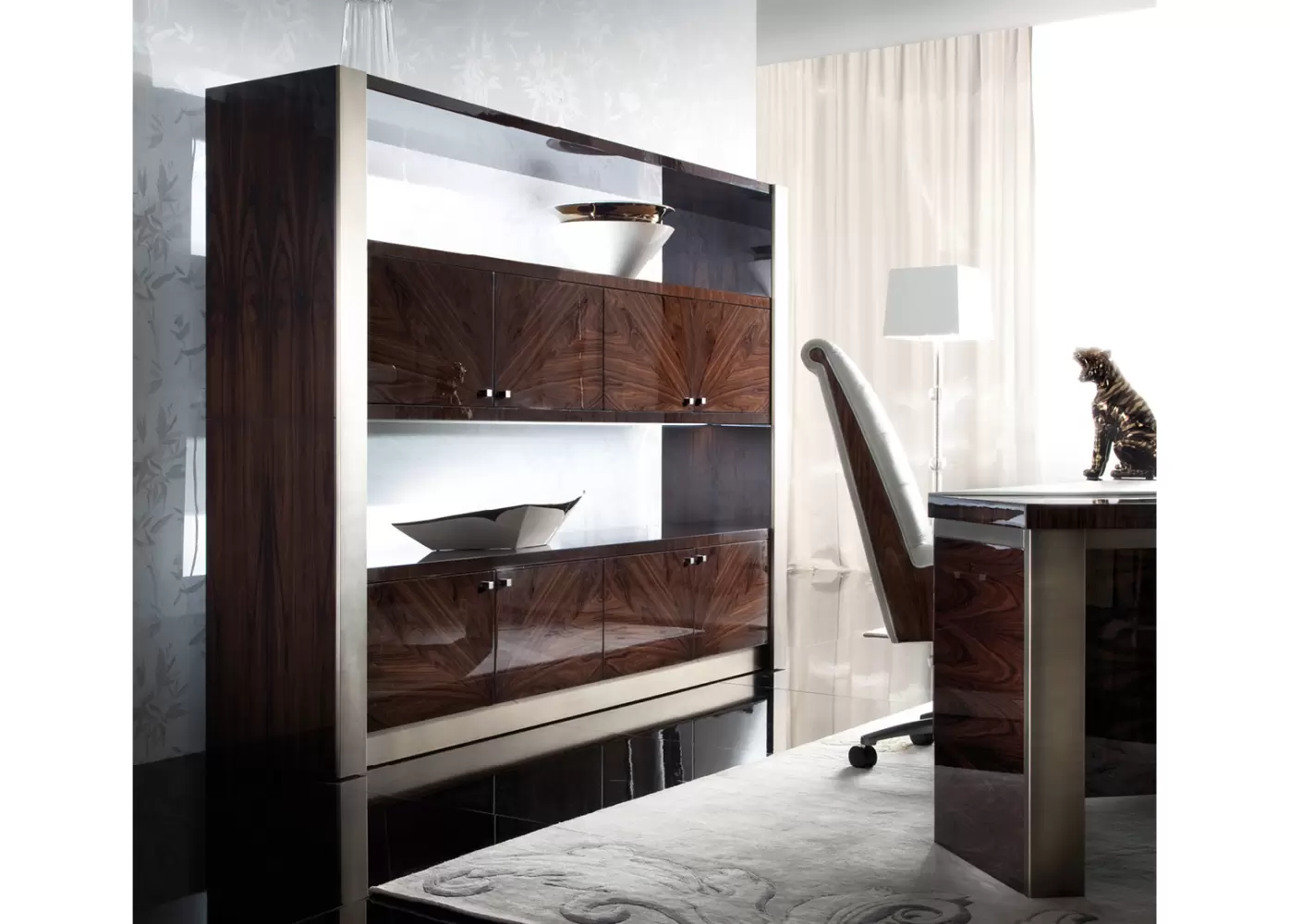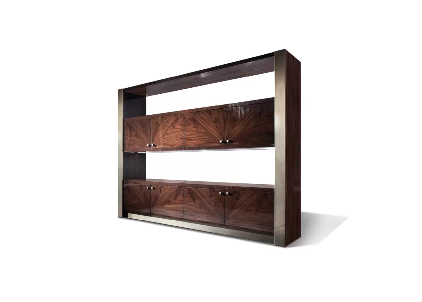 Eight seamless wooden doors offer generous concealed storage, while bronzed stainless steel accents add a refined, sculptural contrast. A custom integrated LED lighting system—activated with a touch switch—casts a soft, ambient glow, accentuating the bookcase’s dramatic verticality and polished surfaces.