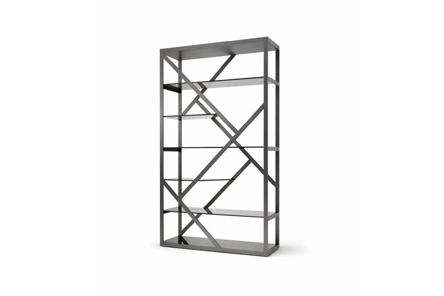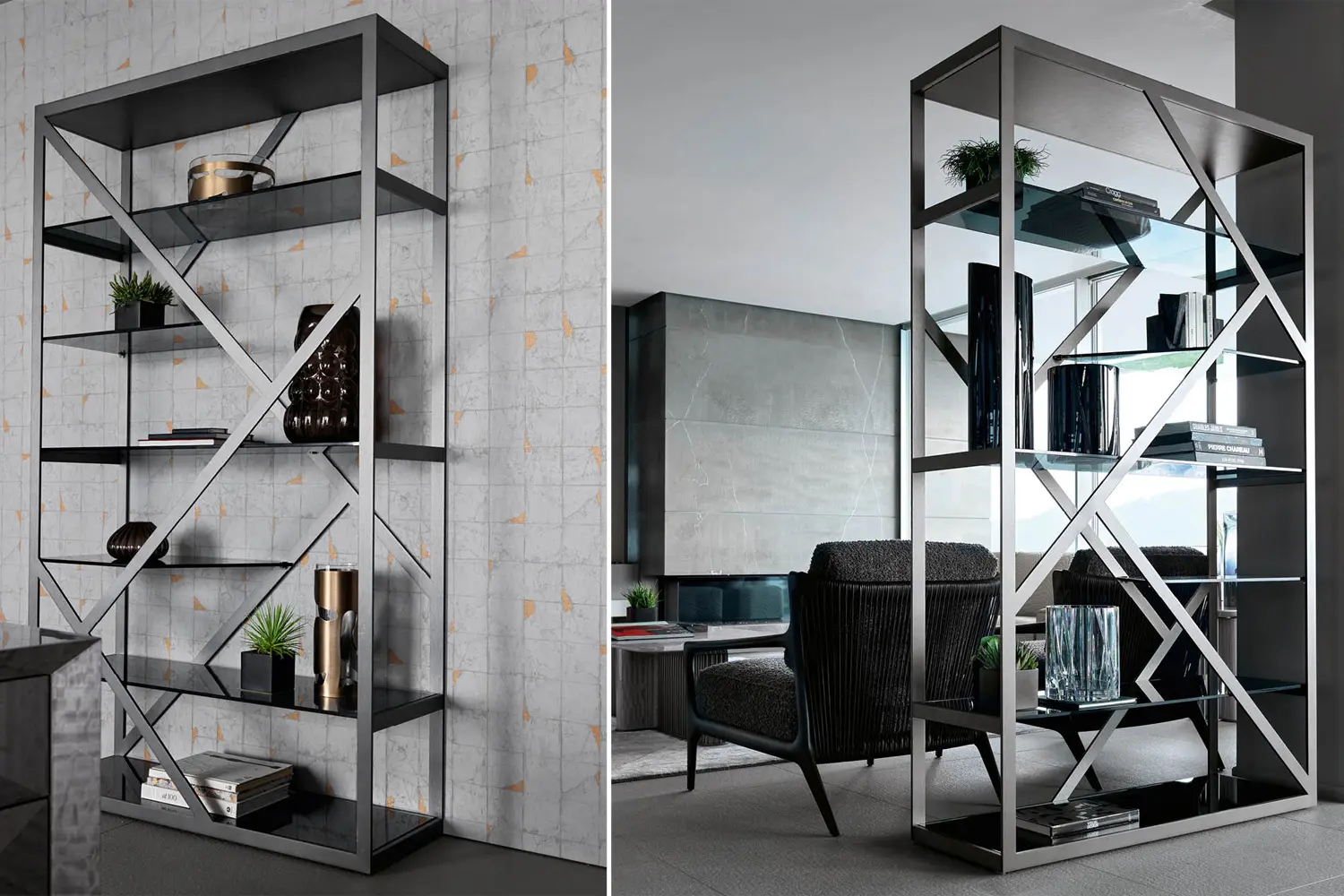 Moonlight Showcase Display your treasures in style with our bi-facial showcase. Crafted from satin grey nickel stainless steel, this showcase features five tempered fixed smoked glass shelves, providing a sleek and modern display solution for your home or office. Measurements Art. 4894: 47½w x 16d x 83h inches
