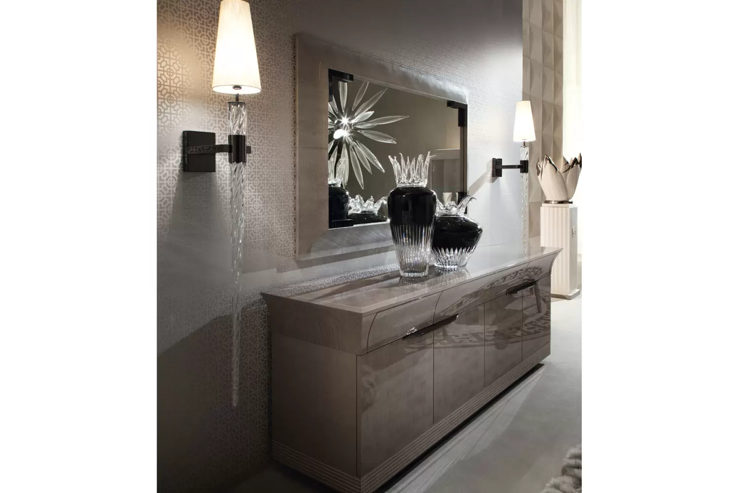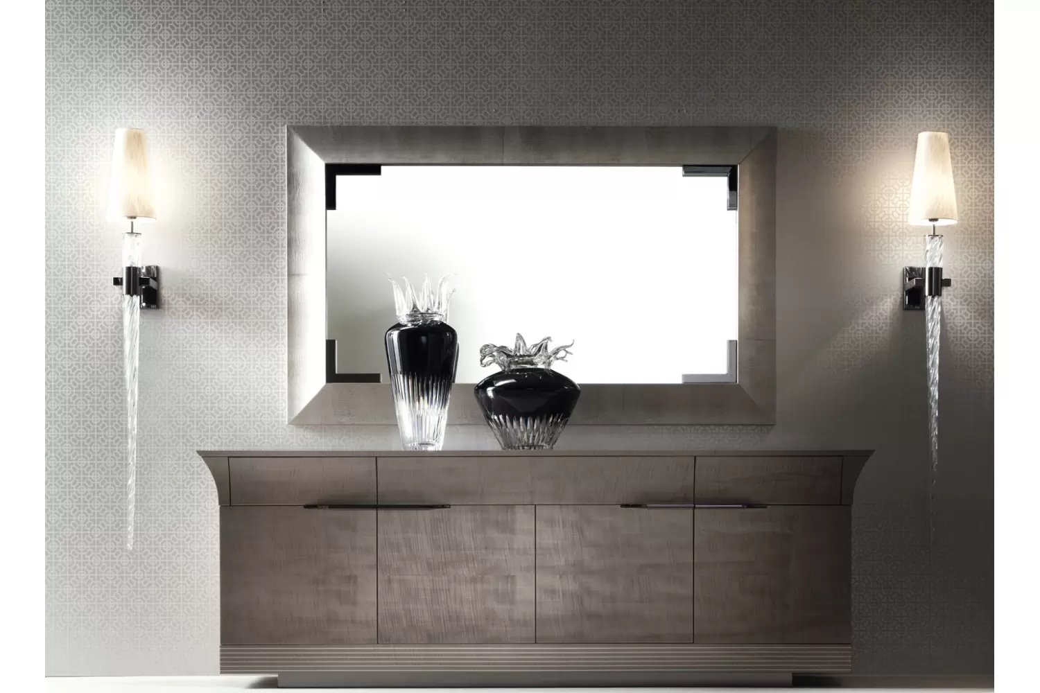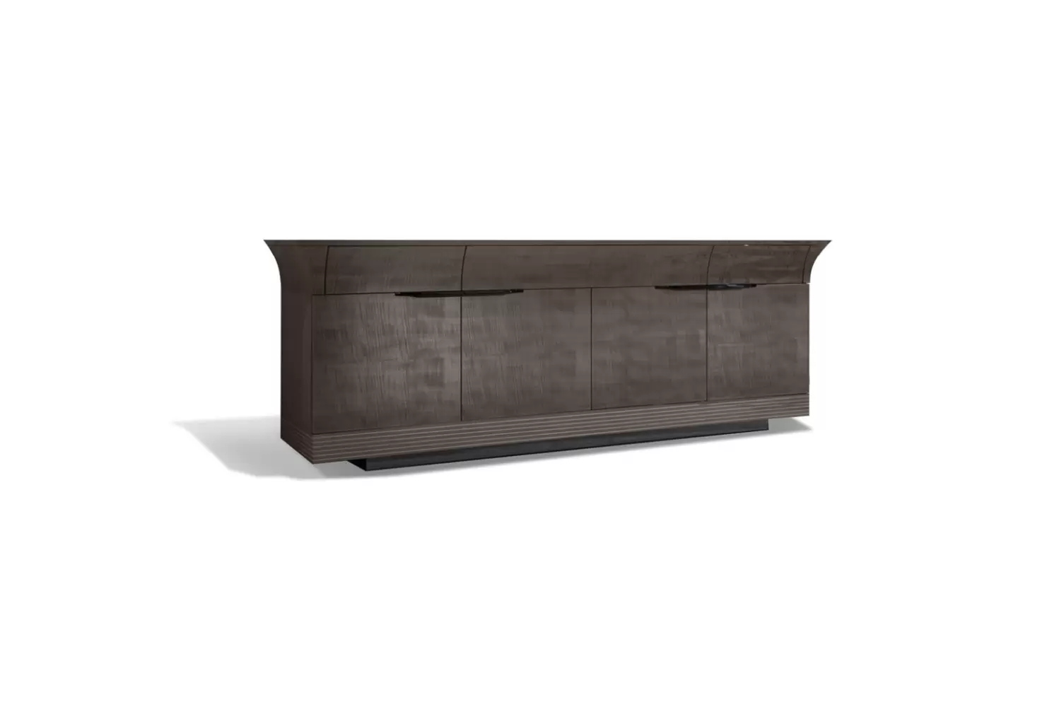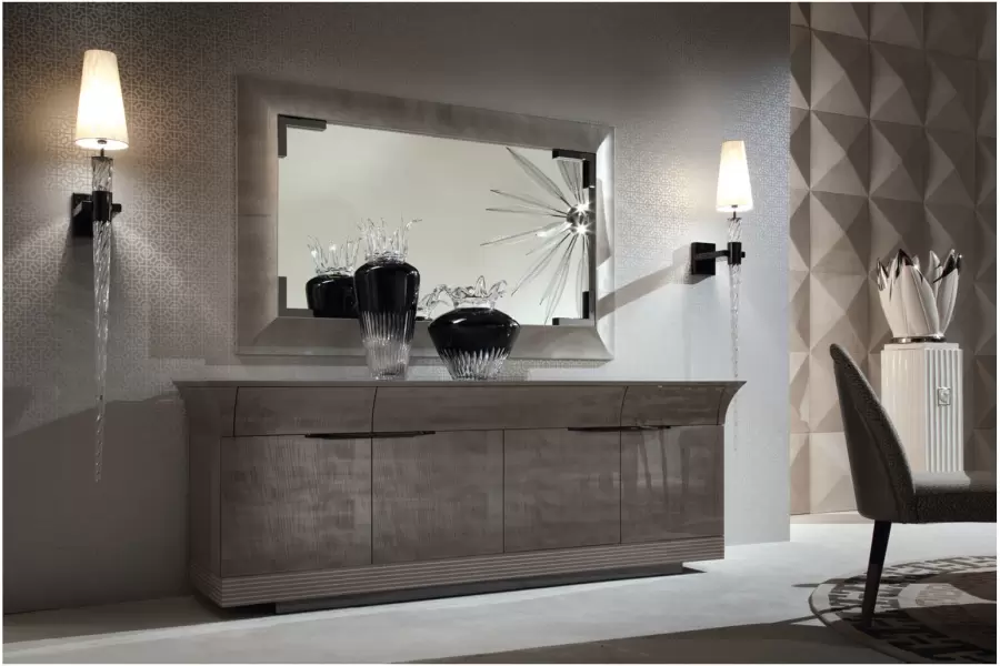 Buffet with 4 doors + 3 full extension drawers w/bottom in silver lizard printed leather in tiger African sycomore veneer with high gloss polyester finish and storm dark grey finish stainless steel handles and base.
