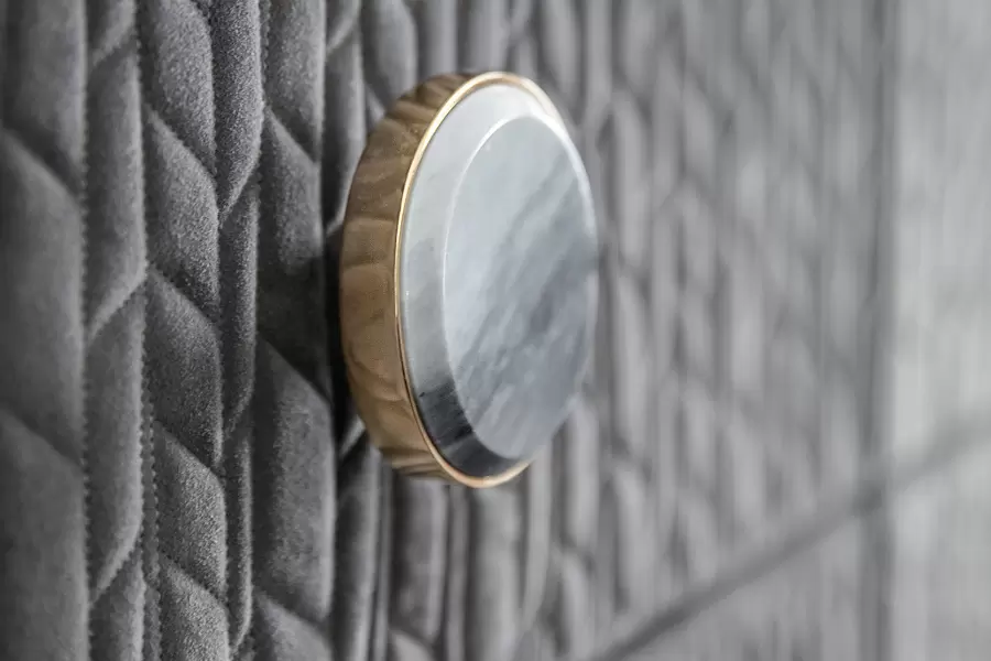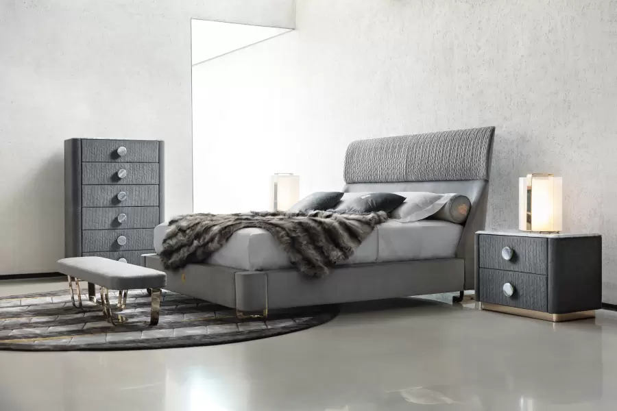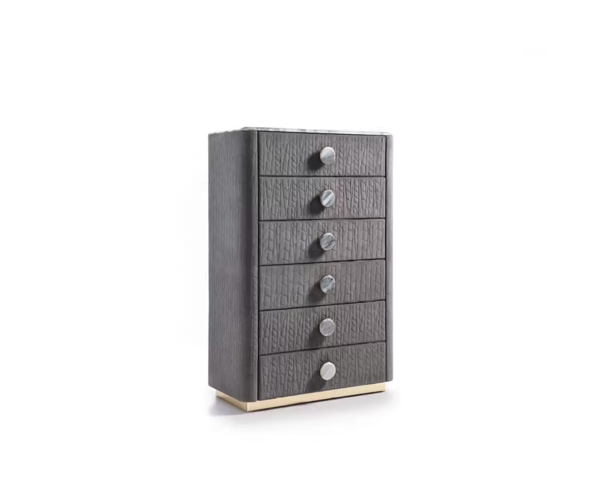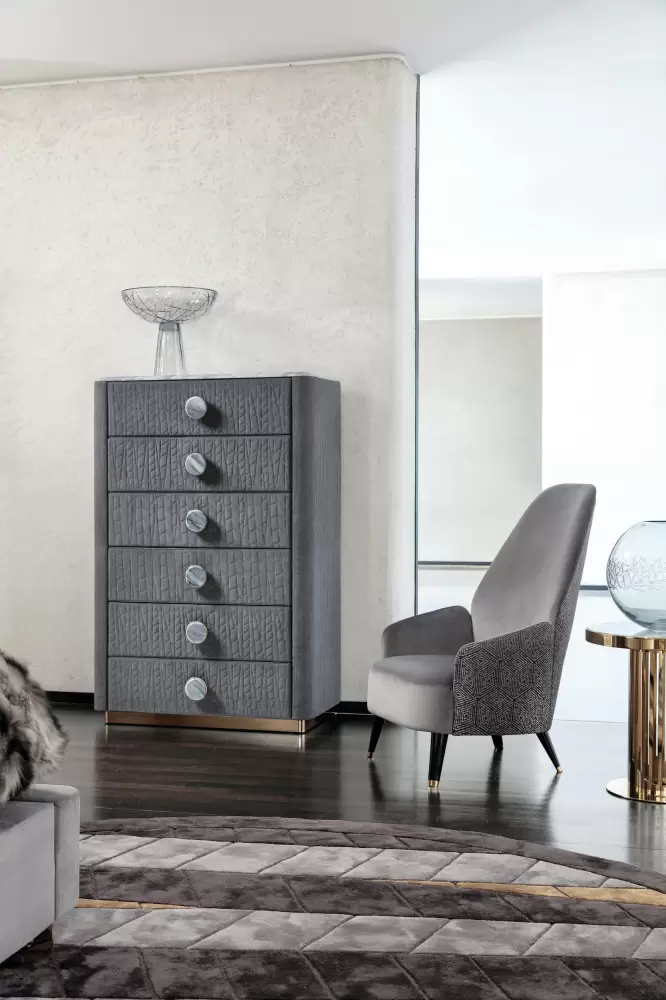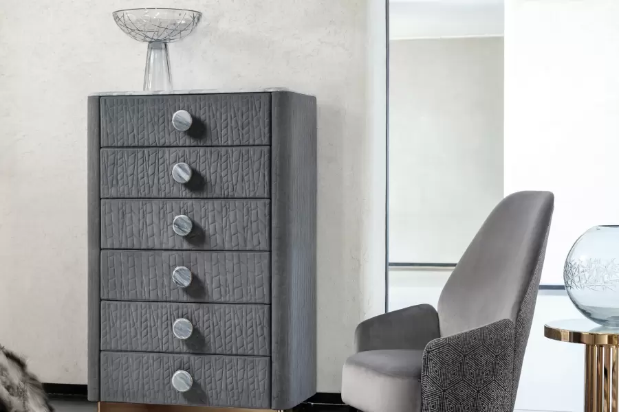 Charisma Chest, upholstered in quilted grey nubuck (color nr 6) and topped with beveled marble. The base, made of light gold chrome stainless steel, exudes elegance and durability.