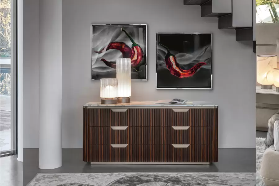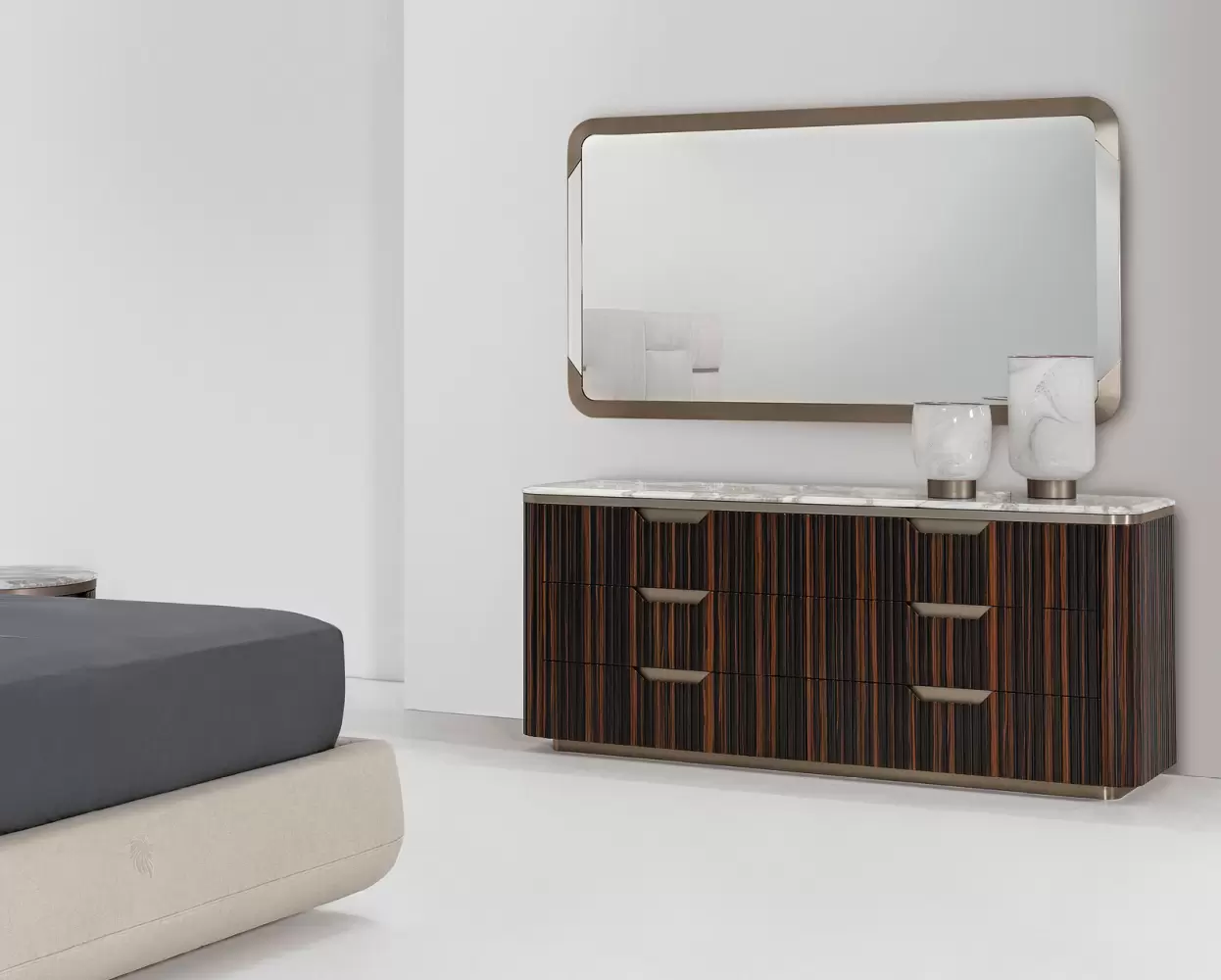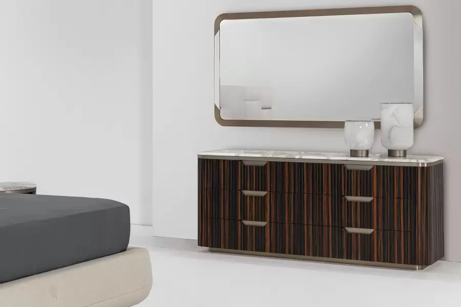 The Luxor Dresser is a luxurious centerpiece crafted in ribbed satined Makassar Ebony veneer, exuding depth and refined character. Its beveled high-gloss Namibian Oyster marble top radiates timeless elegance, while the satined galvanized titanium-finish stainless steel base and accents introduce a contemporary edge.