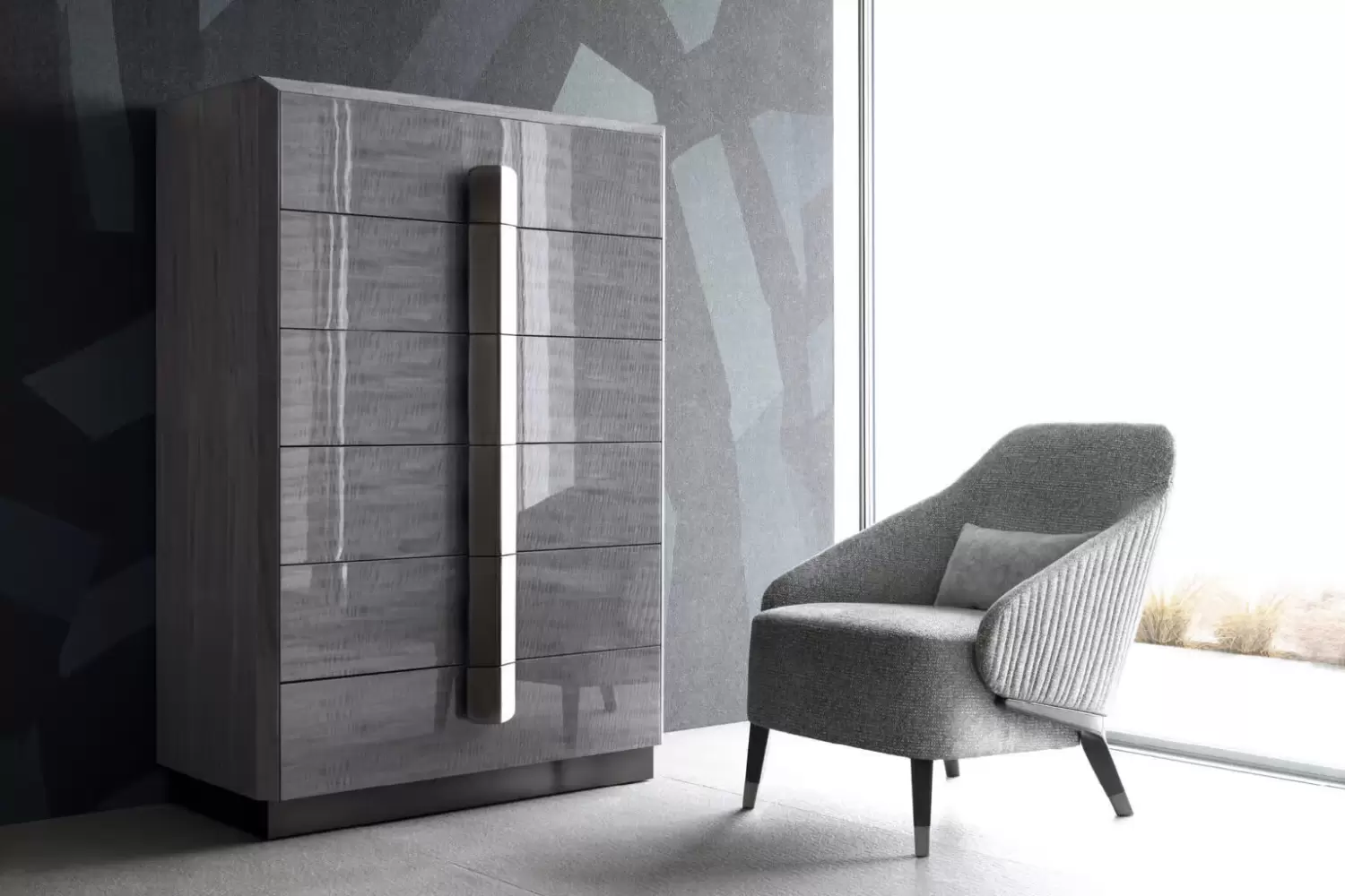 Chest in Madagascar figured Mowinghi veneer in high gloss polyester finish.