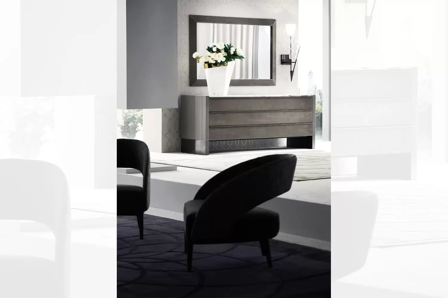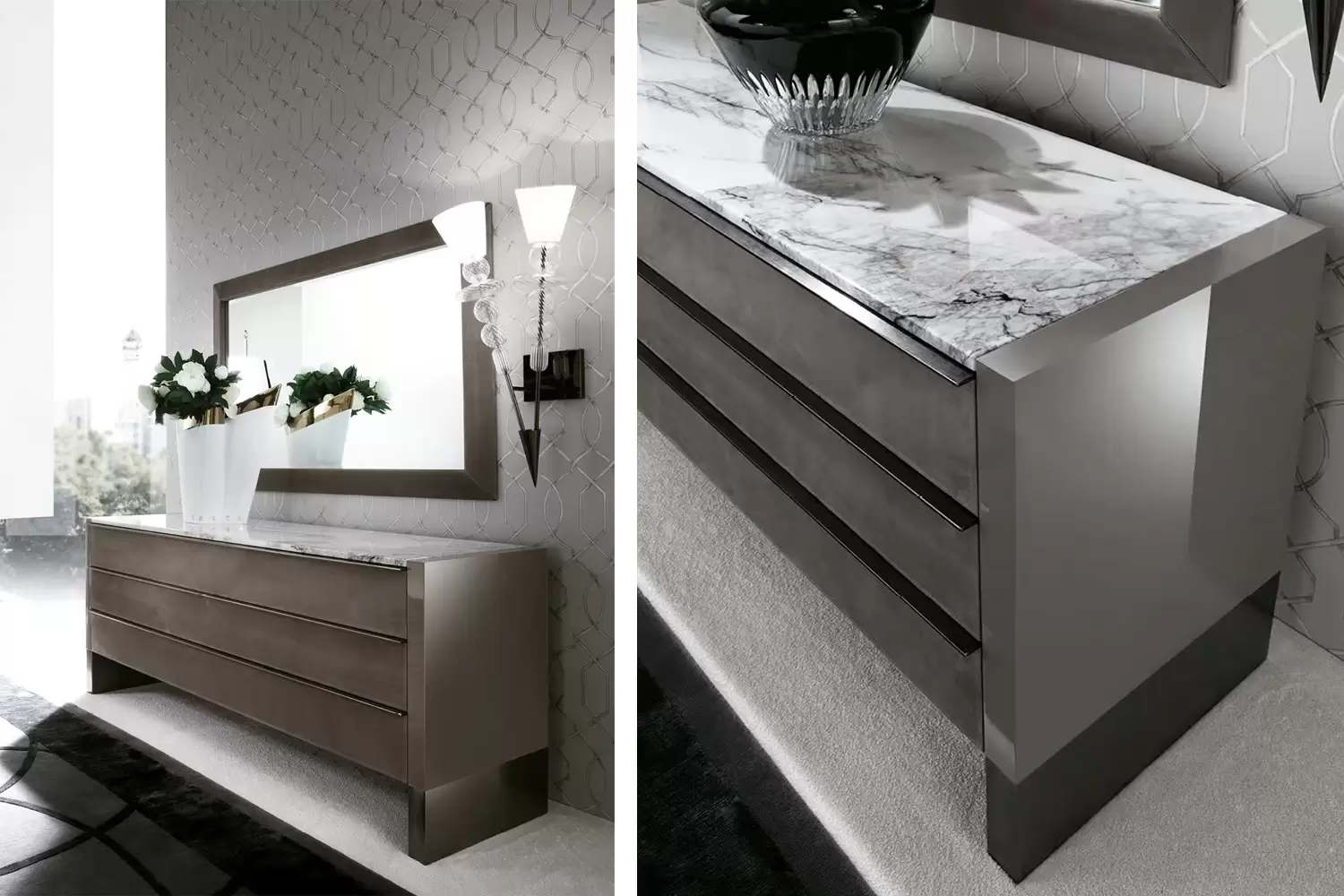 This elegant Vision Dresser features a high gloss polyester grey lacquer finish that adds a modern touch to any room. The dresser boasts a marble top for a luxurious look and feel.