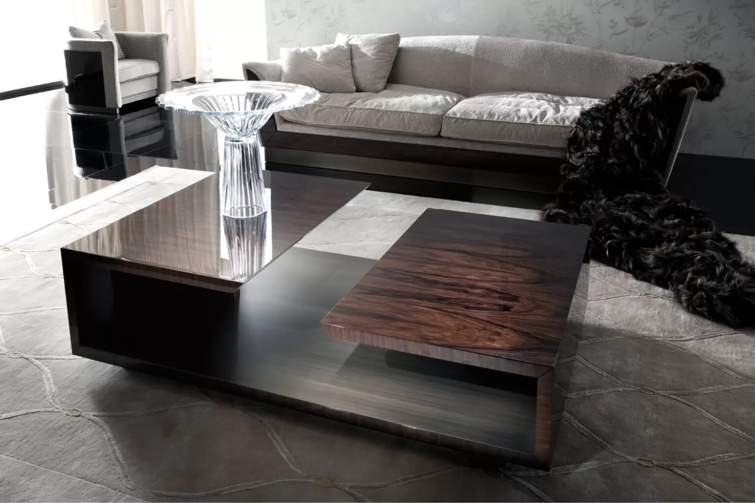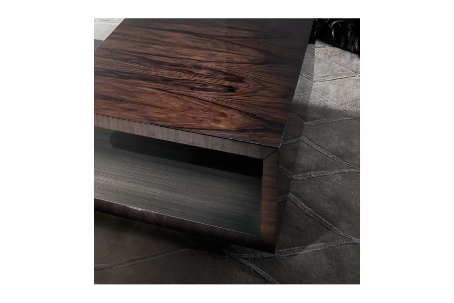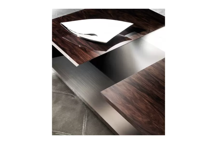 Coliseum Rectangular Cocktail Table Rectangular cocktail table in brazilian rosewood veneer with high gloss polyester finish. Inside part in gold leaf finish. Measurements Art. 180/46 Size: cm 160W x 100D x 43H Size: 63″W x 39″½D x 17’’H