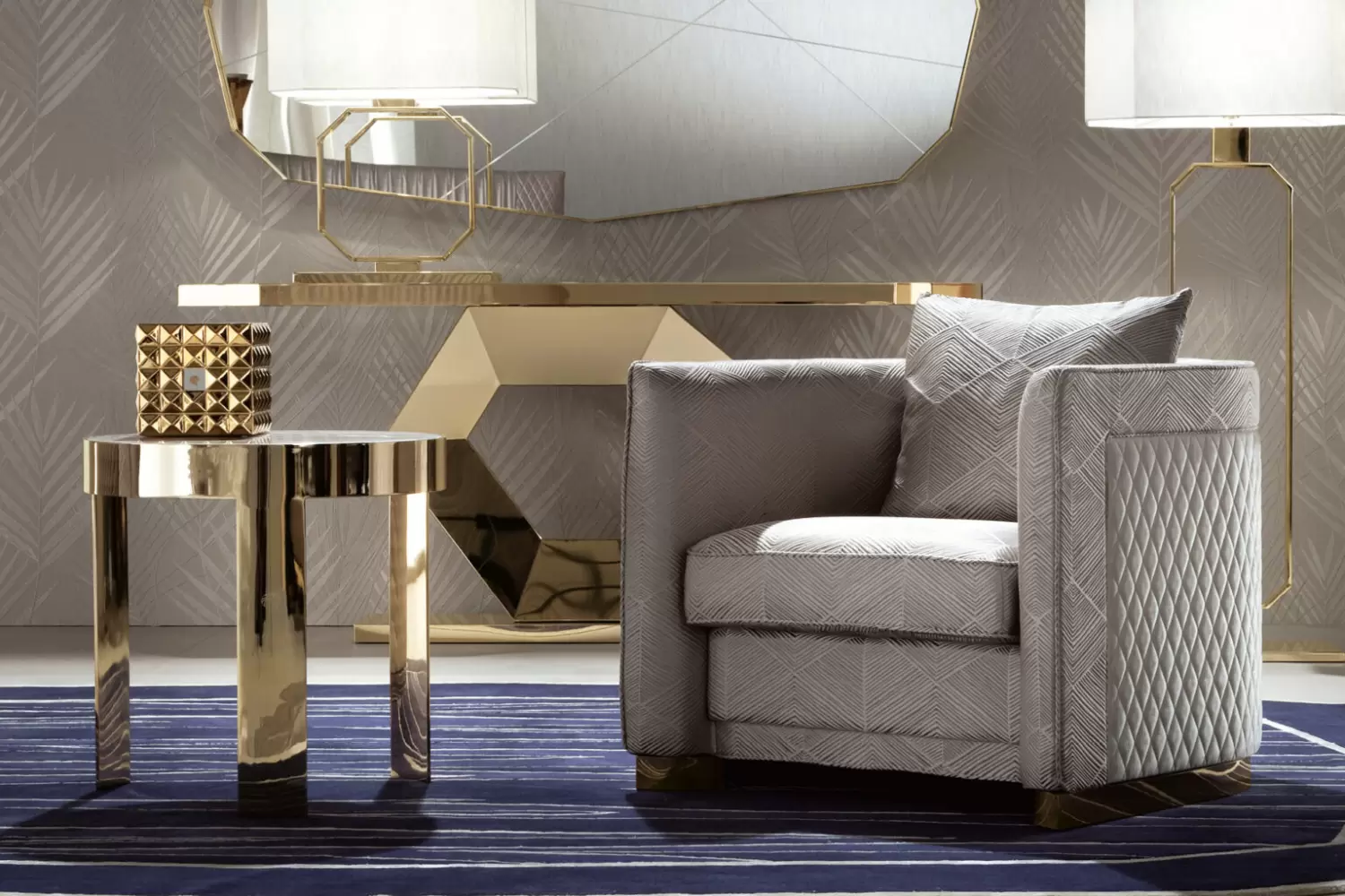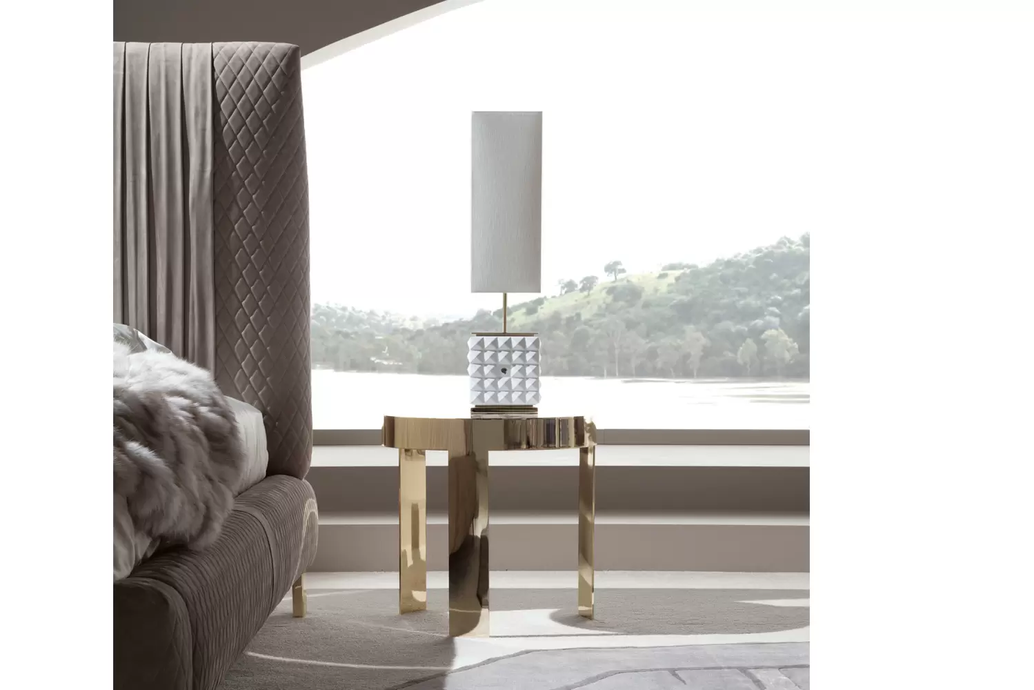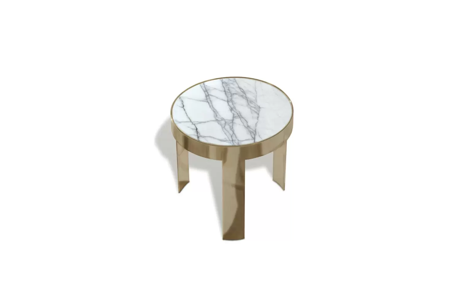 Infinity Round Metal End Table Round metal end table with structure in light gold chrome stainless steel with Giorgio Collection logo. High gloss polyester finish marble top. Measurements Art. 590/44 Size: diam. cm 60W x 55H Size: diam. 23’’½ x 21’’½H