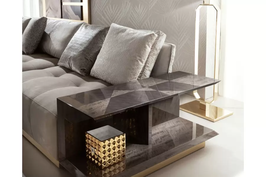 Infinity Sofa End Table Sofa big end table in makorè mahogany veneer with high gloss polyester finish. Measurements Art. 590/54 Size: cm 40W x 110D x 50H Size: 16”W x 43”½D x 20”H Art. 590/53 Size: cm 40W x 82D x 50H Size: 16”W x 32”D x 20”H