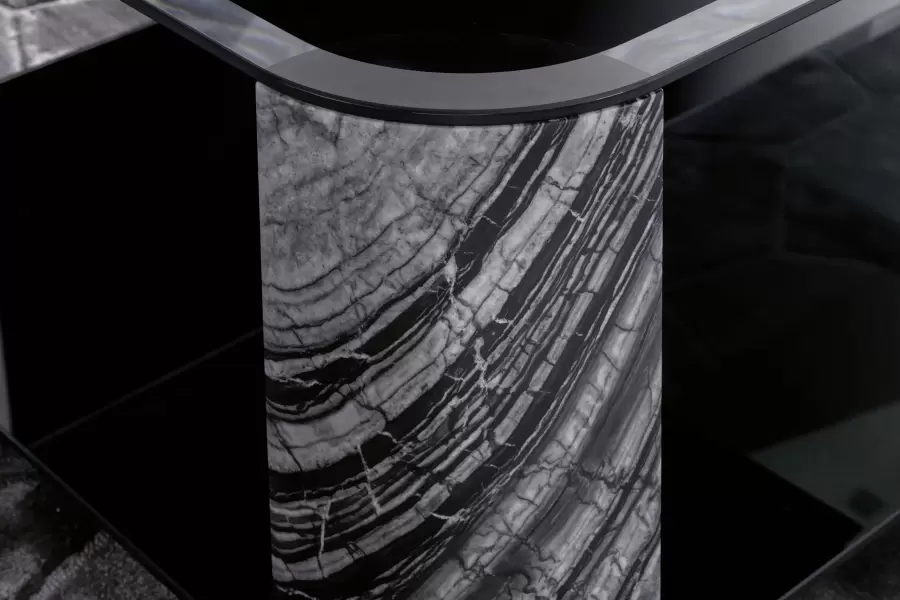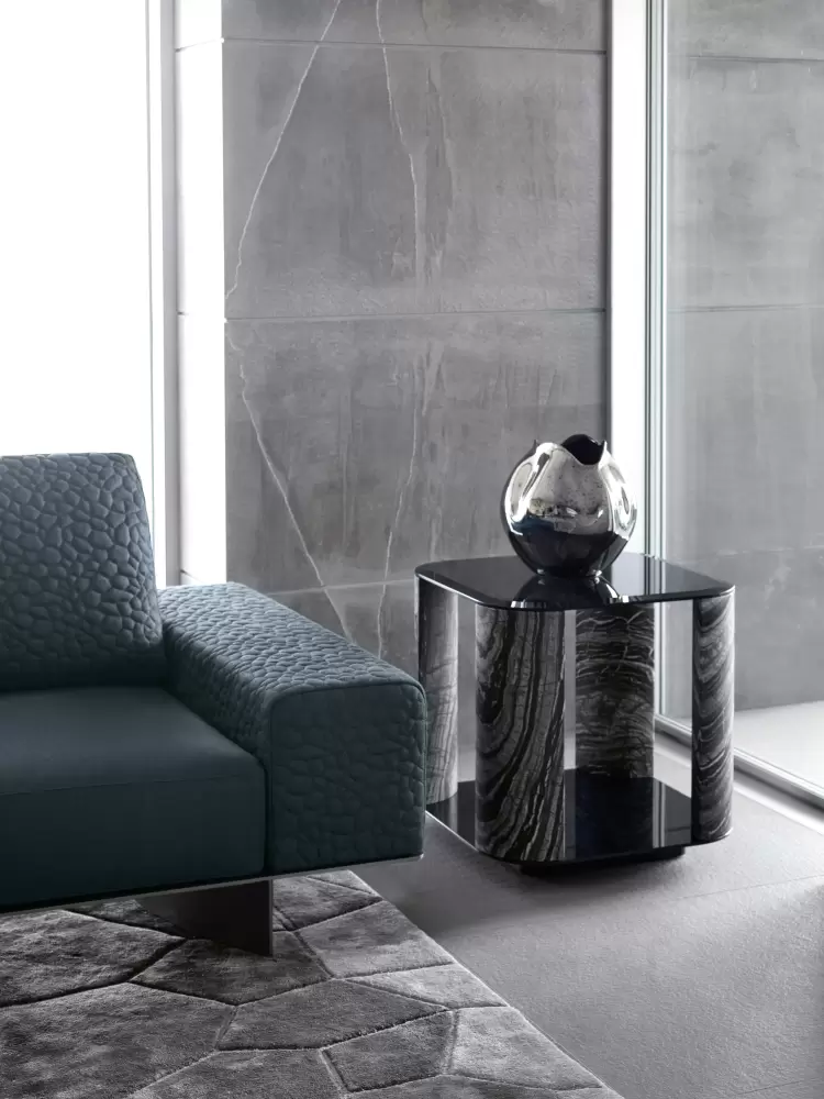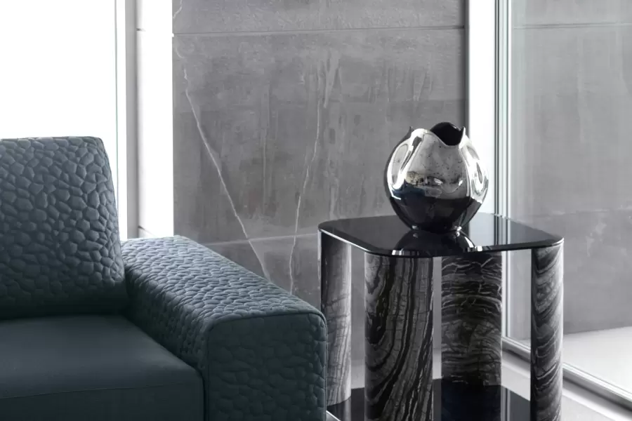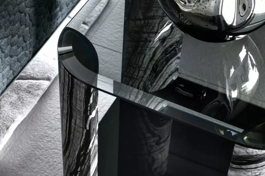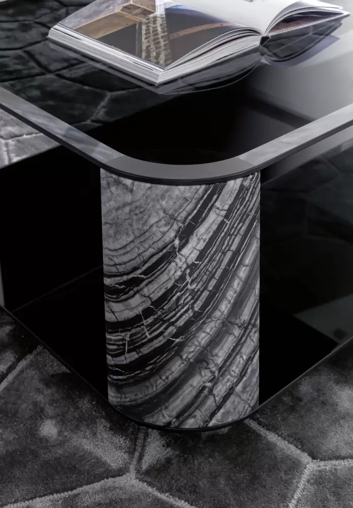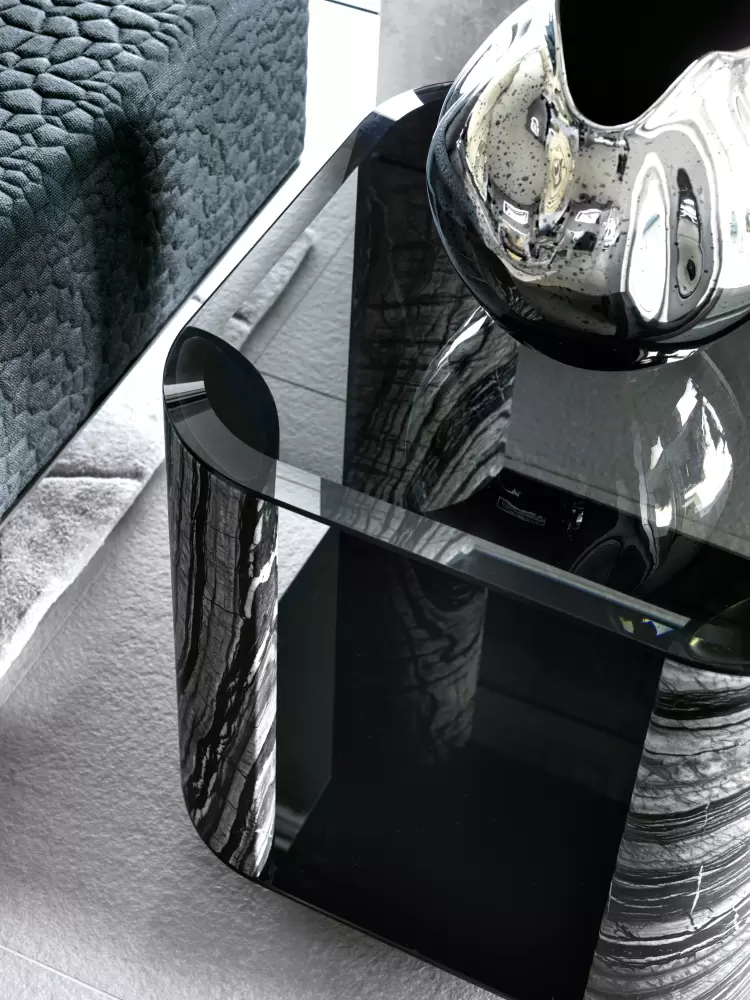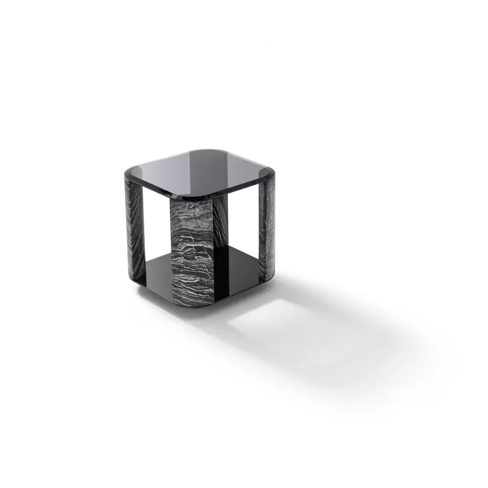 Mirage Square Small Side Table Square small side table with top and base in smoked tempered beveled glass. 4 legs in solid matt Kenya Blackmarble. Measurements Art. 380/64 Size: cm. 60W x 60D x 60H Size: 23″½W x 23″½D x 23”½H