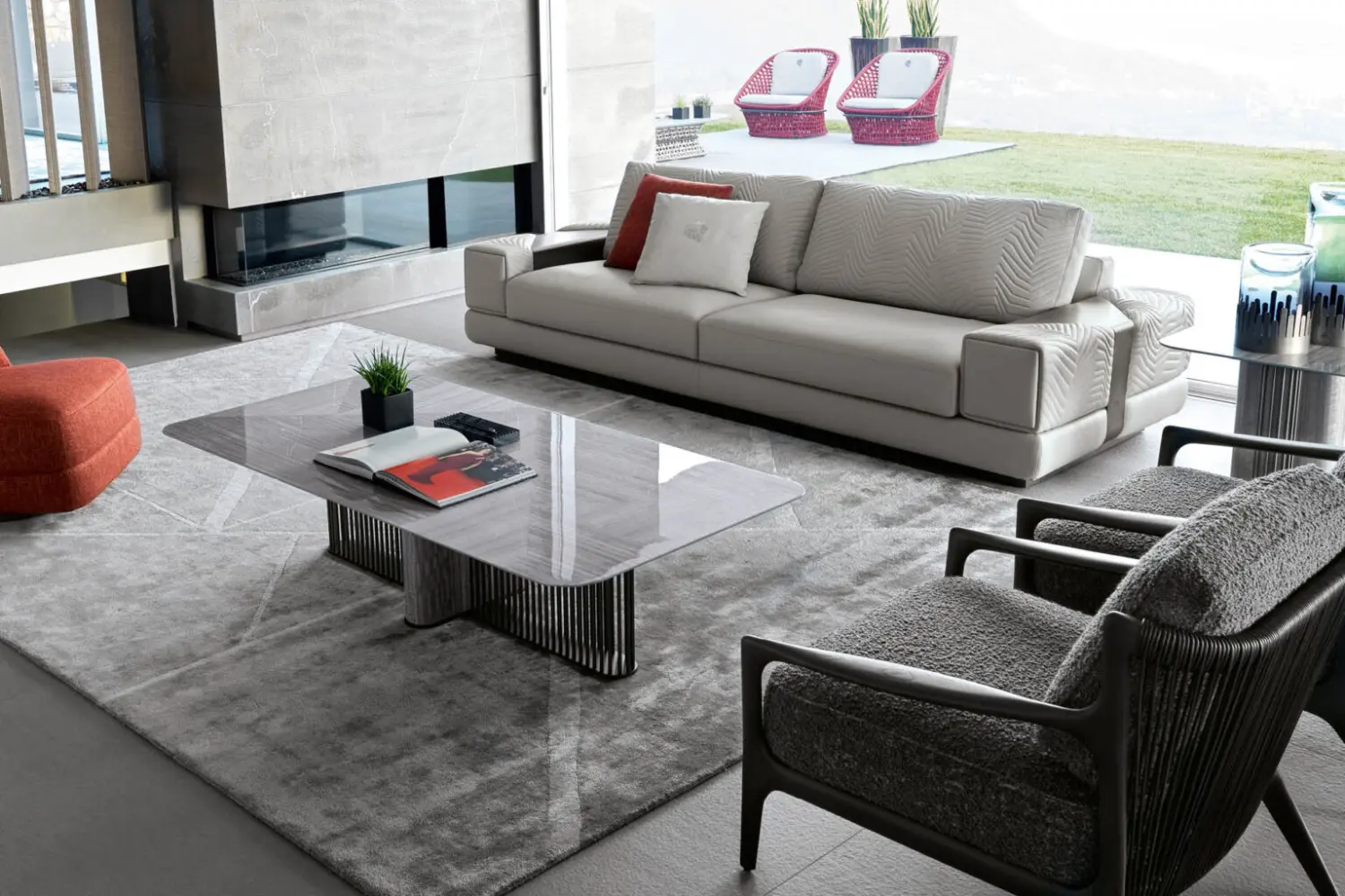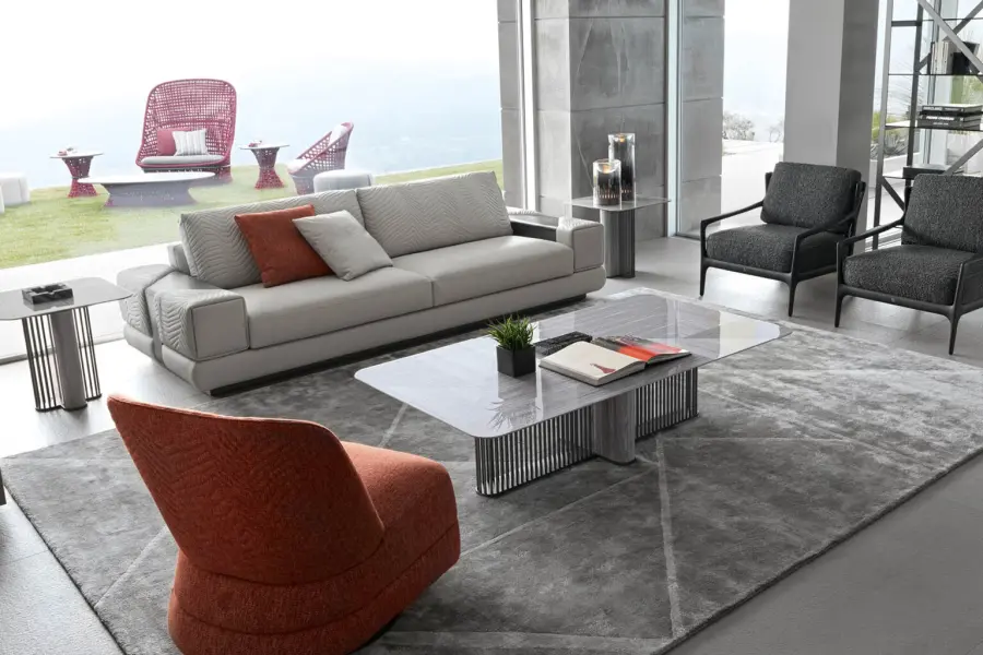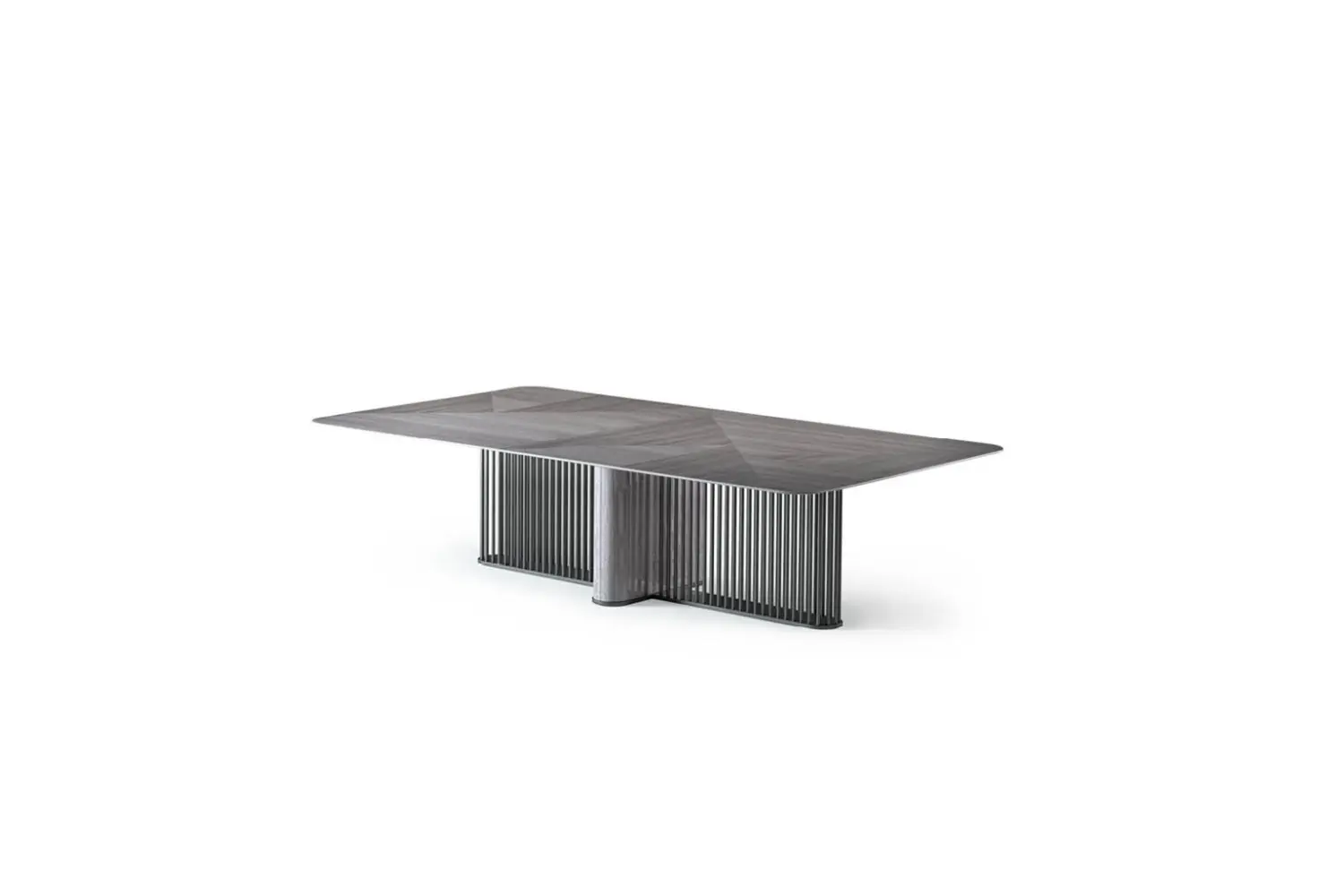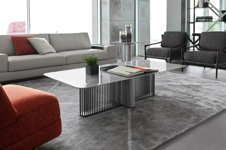 Elevate your living space with our stunning rectangular cocktail table, featuring a top inlaid with Tasmanian curly Eucalyptus veneer and a high gloss polyester finish. The base, a combination of satin grey nickel stainless steel and Tasmanian curly Eucalyptus veneer, also boasts a high gloss polyester finish.