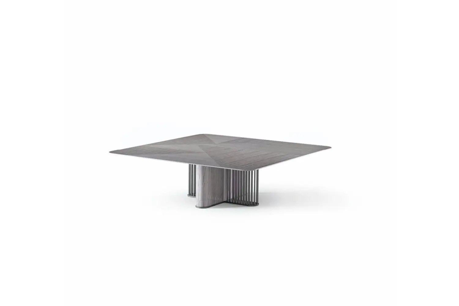 Enhance your living space with our elegant square cocktail table, featuring a top inlaid with Tasmanian curly Eucalyptus veneer and a high gloss polyester finish. The base, crafted from a combination of satin grey nickel stainless steel and Tasmanian curly Eucalyptus veneer, also boasts a high gloss polyester finish.