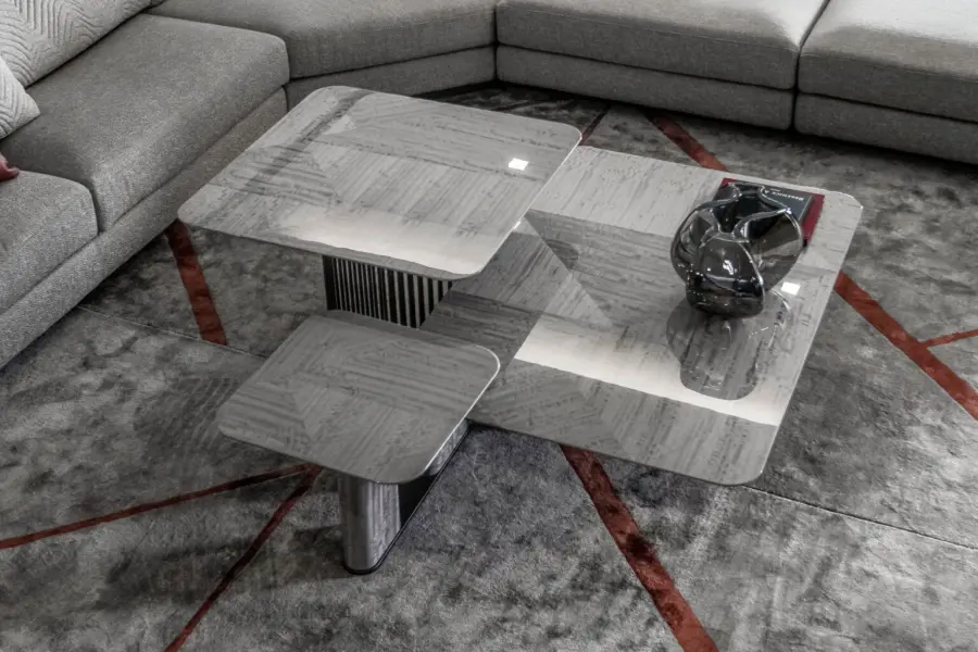 Introducing our three-level cocktail table, a masterpiece of architectural design. Each level features a top inlaid with Tasmanian curly Eucalyptus veneer and finished with a high gloss polyester finish. The base, a striking combination of satin grey nickel stainless steel and Tasmanian curly Eucalyptus veneer, also boasts a high gloss polyester finish.