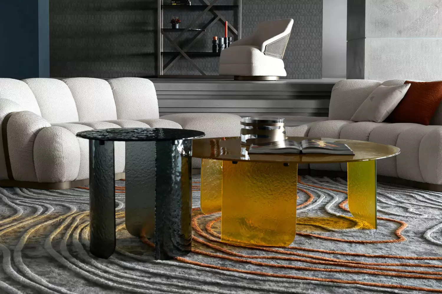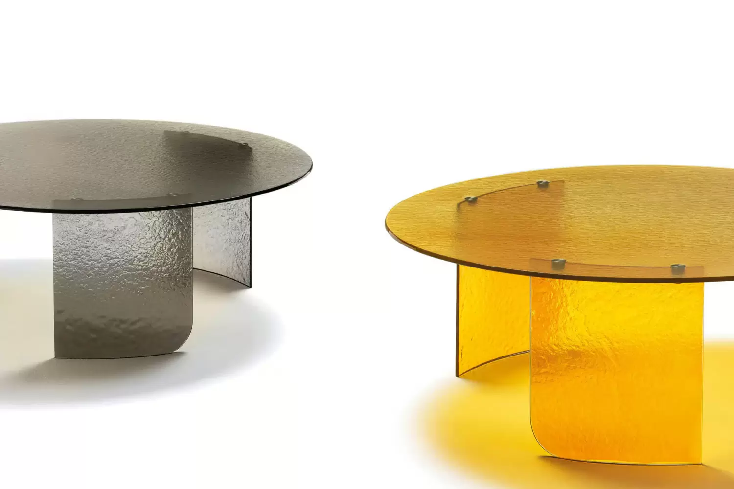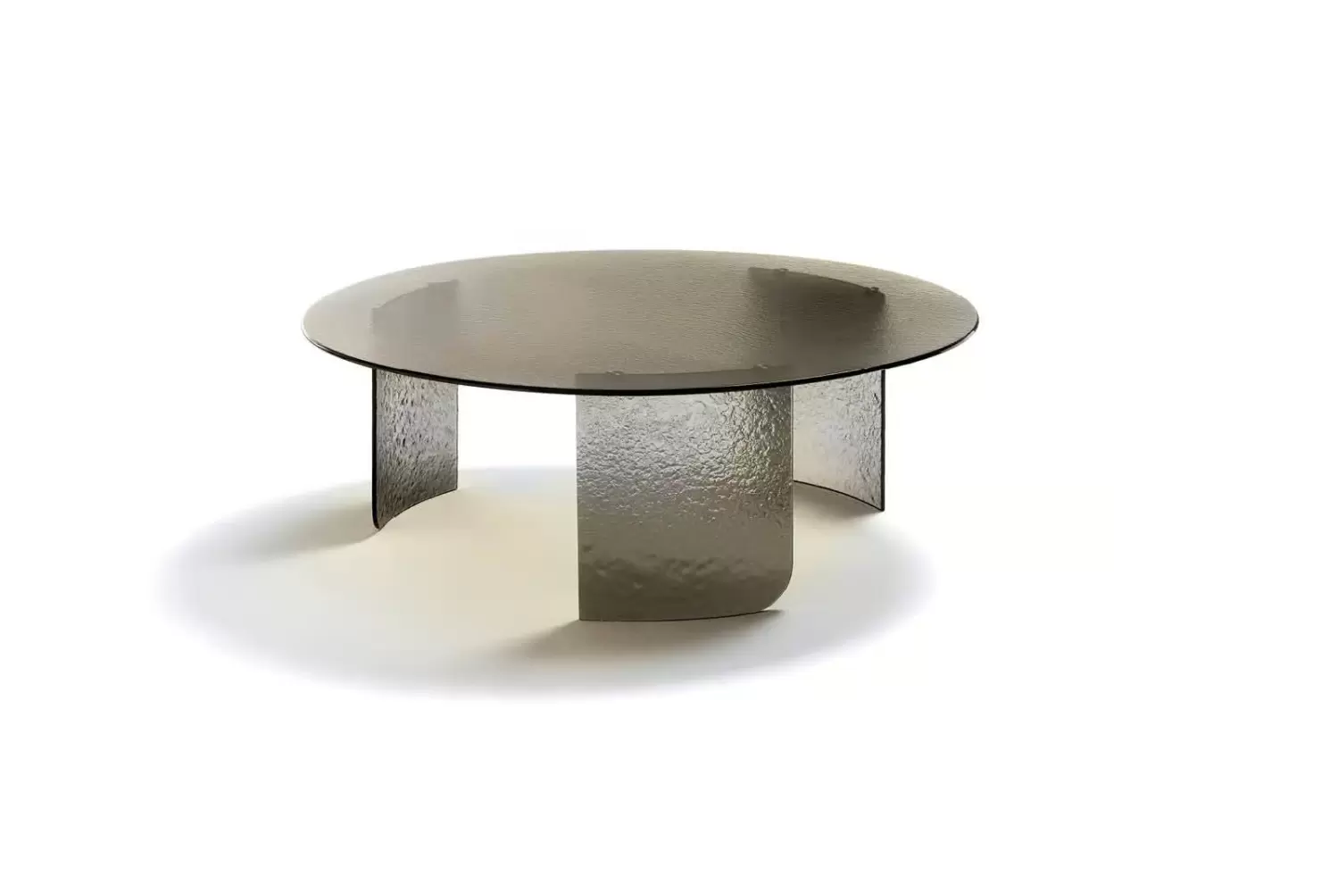 Elevate your space with our Trésor Round Cocktail Table, showcasing a minimalist design with a top and base in brown, smoke, or amber hand-hammered fused glass. Experience its welcoming shapes in your home.