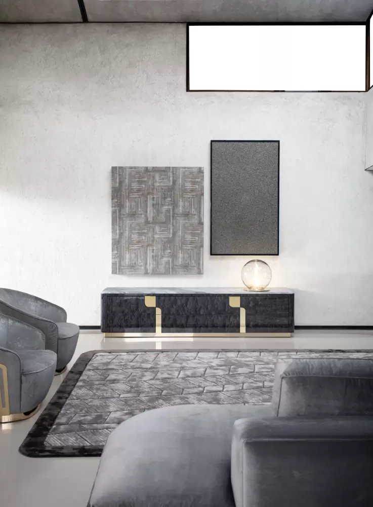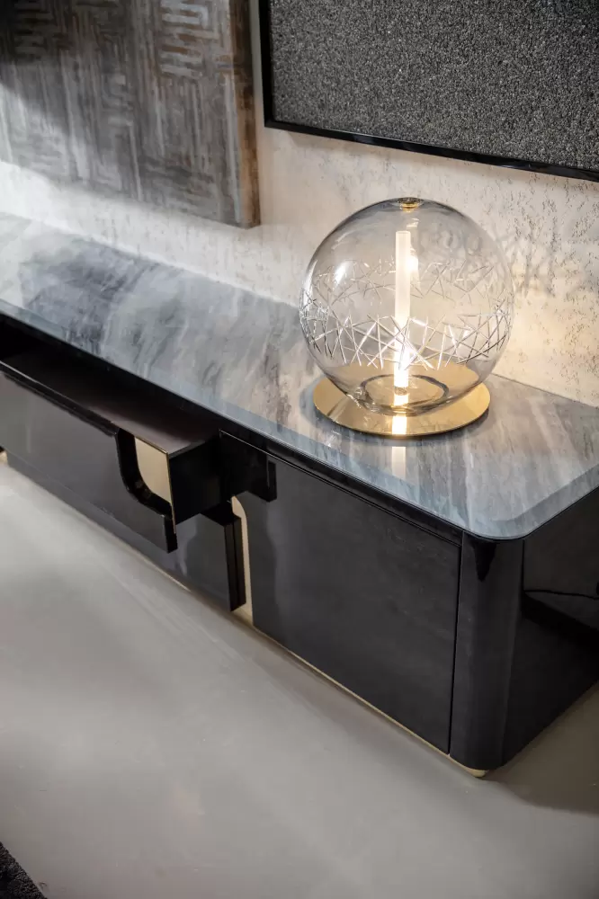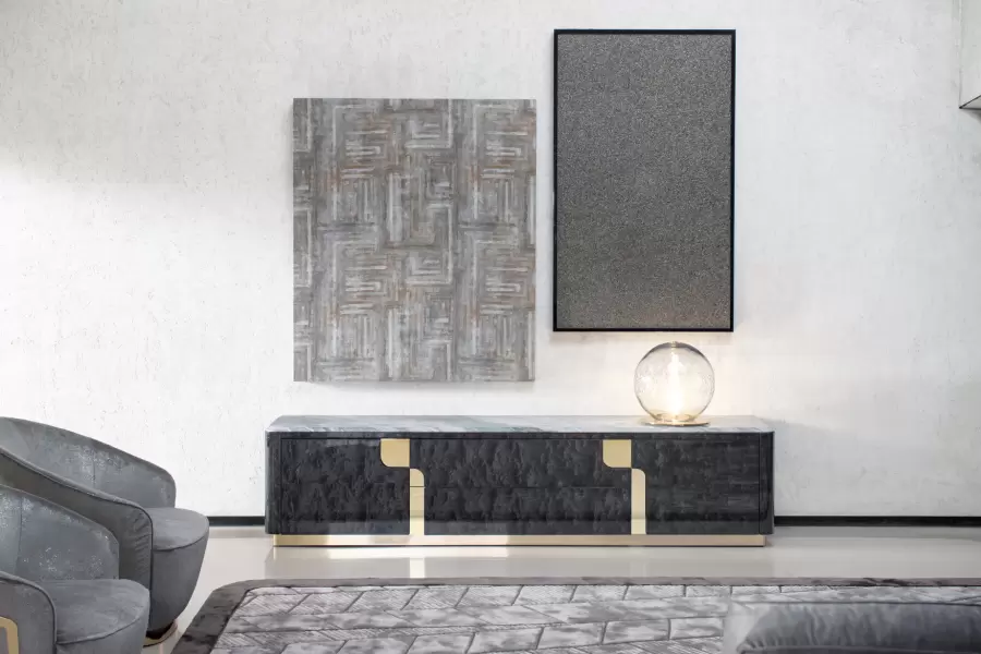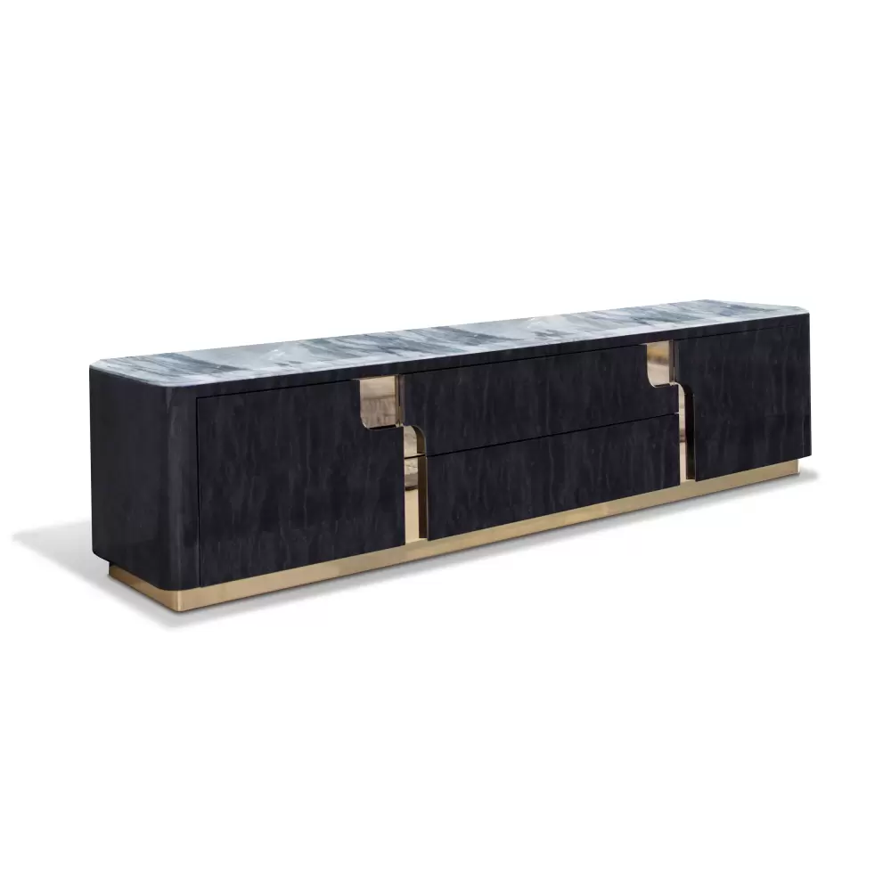 Charisma Tv Unit Marble Top Base for TV unit in Black Bubinga burl veneer with high gloss polyester finish. 2 handles and details in light gold chrome stainless steel. Measurements Art. 280/40 Size: cm 240W x 50D x 55H Size: 94″½W x 20″D x 21″½H