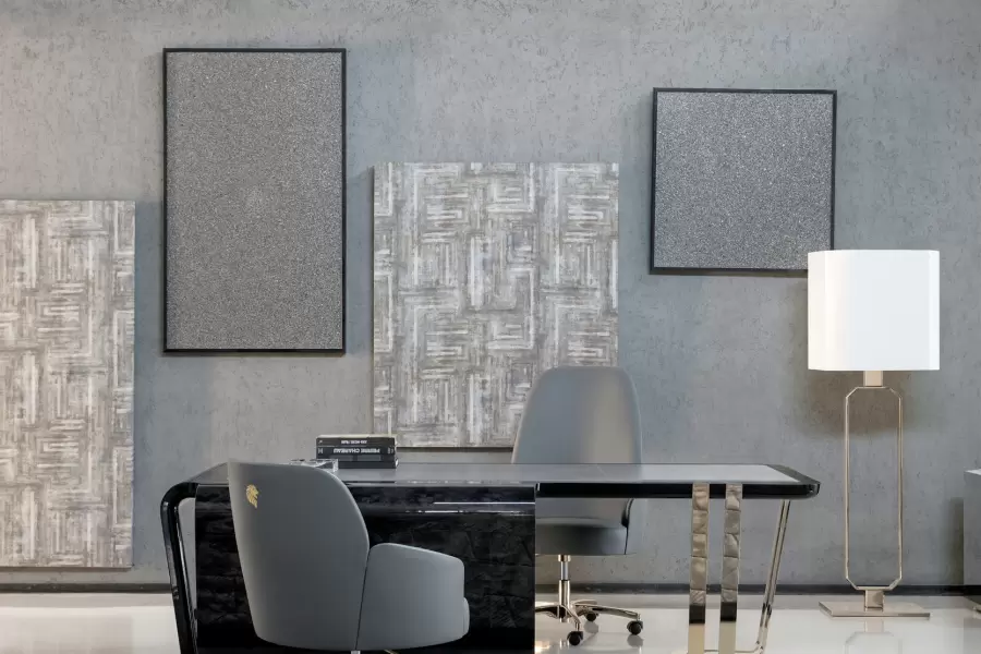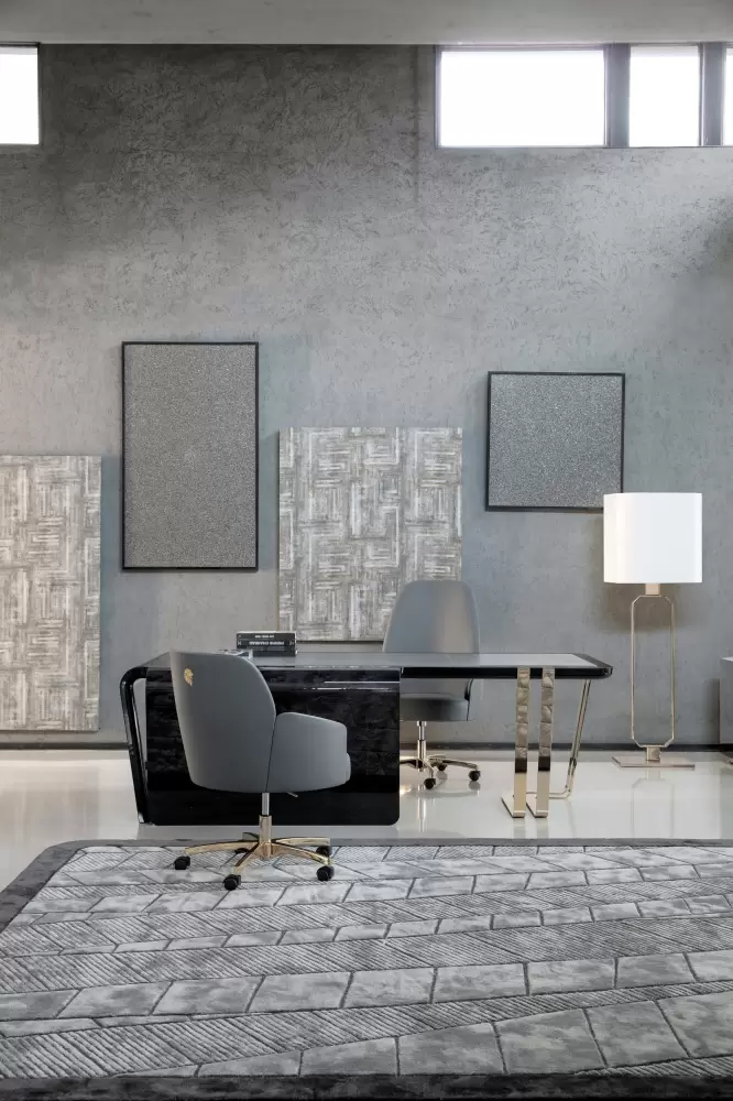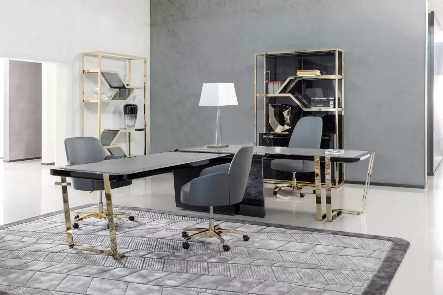 Top insert in grey leather. Legs and details in light gold chrome stainless steel with Giorgio Collection logo.