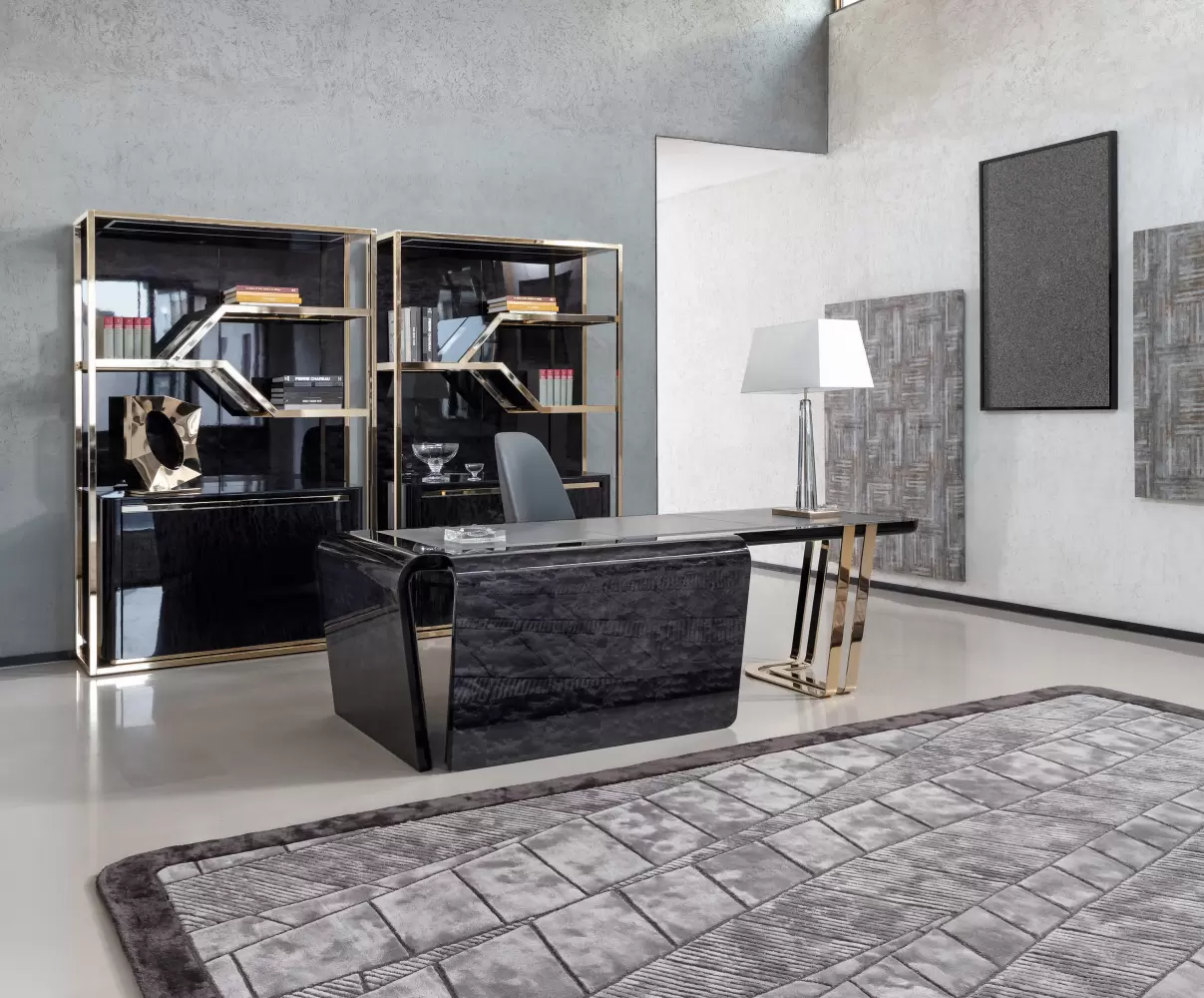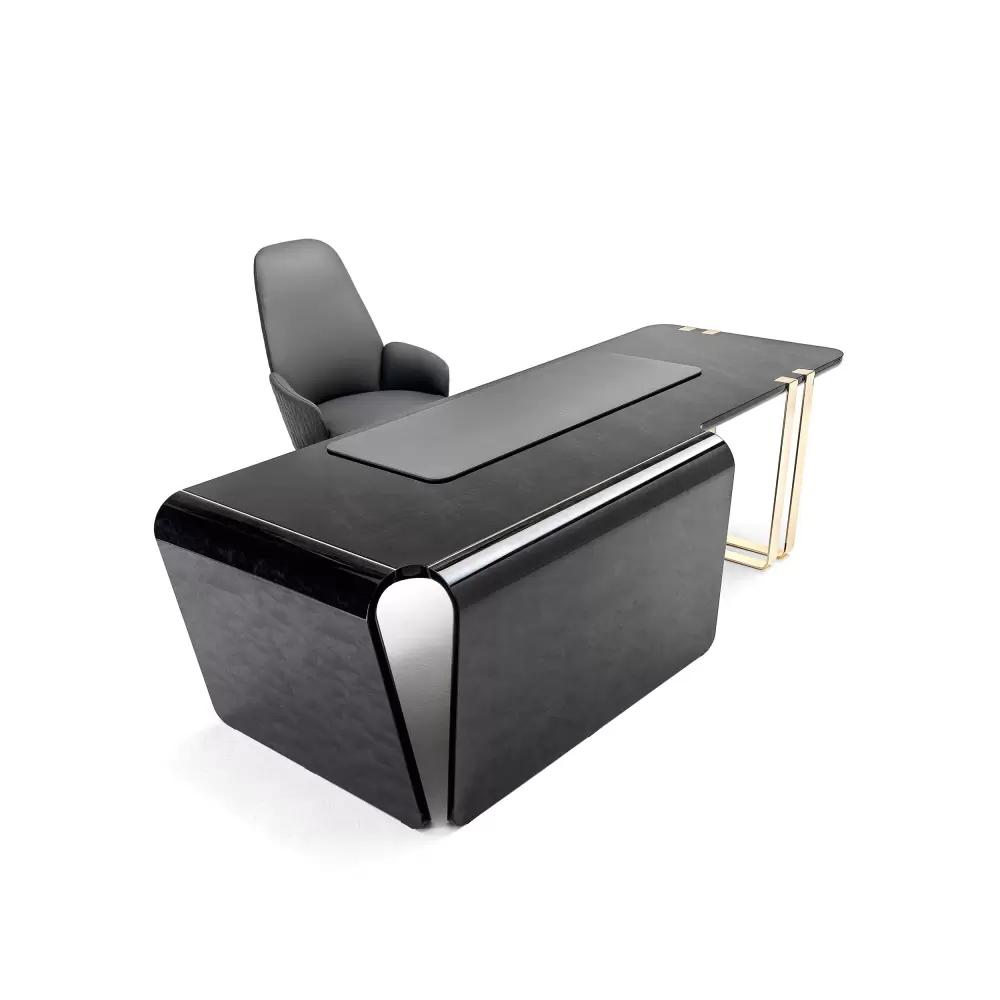 Desk in Black Bubinga burl veneer with high gloss polyester finish.
