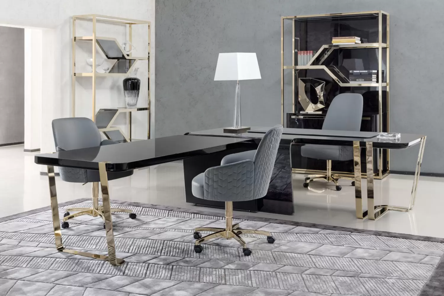Frontal desk in Black Bubinga burl veneer with high gloss polyester finish.