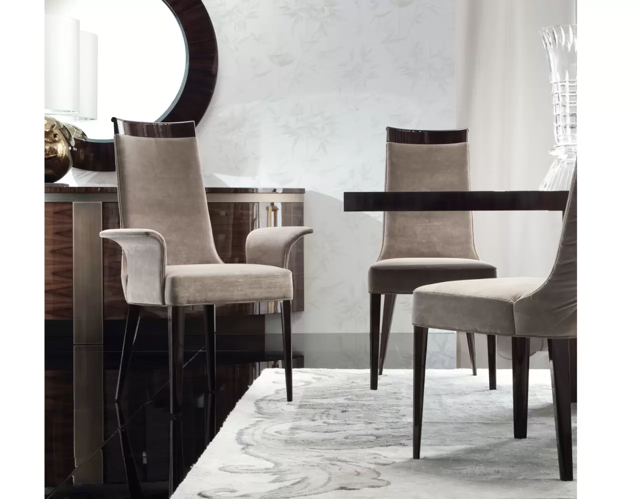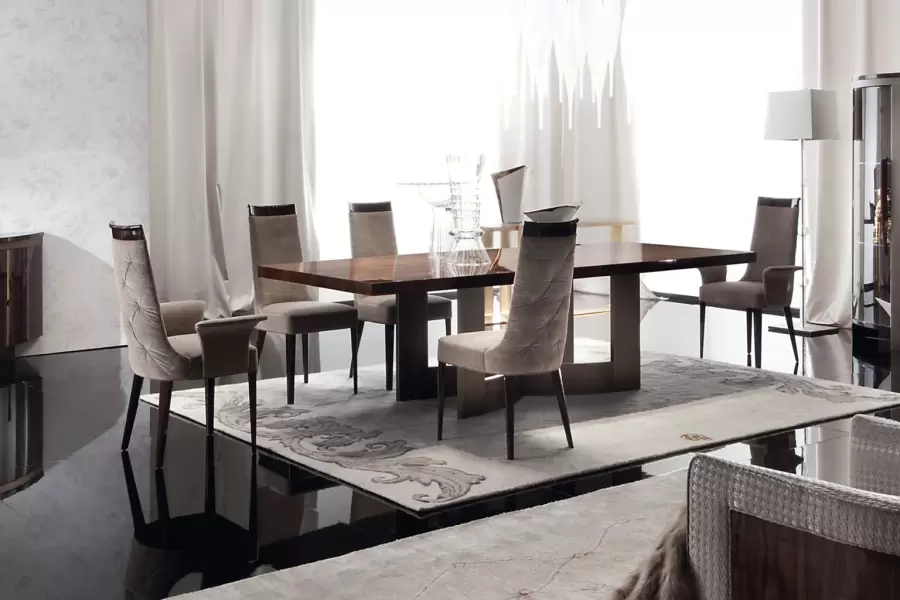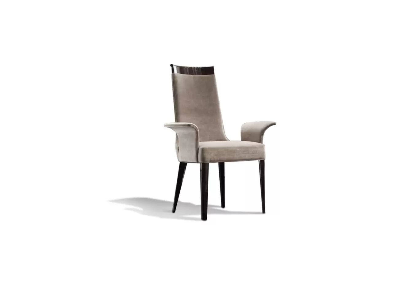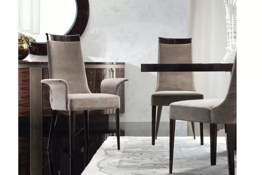 Arm chair in solid beech wood in high gloss polyester, in Brazilian rosewood colour w/buttoned back in first grade leather or lizard printed leather / in velvet, velour or suede fabric / in nabuk leather.