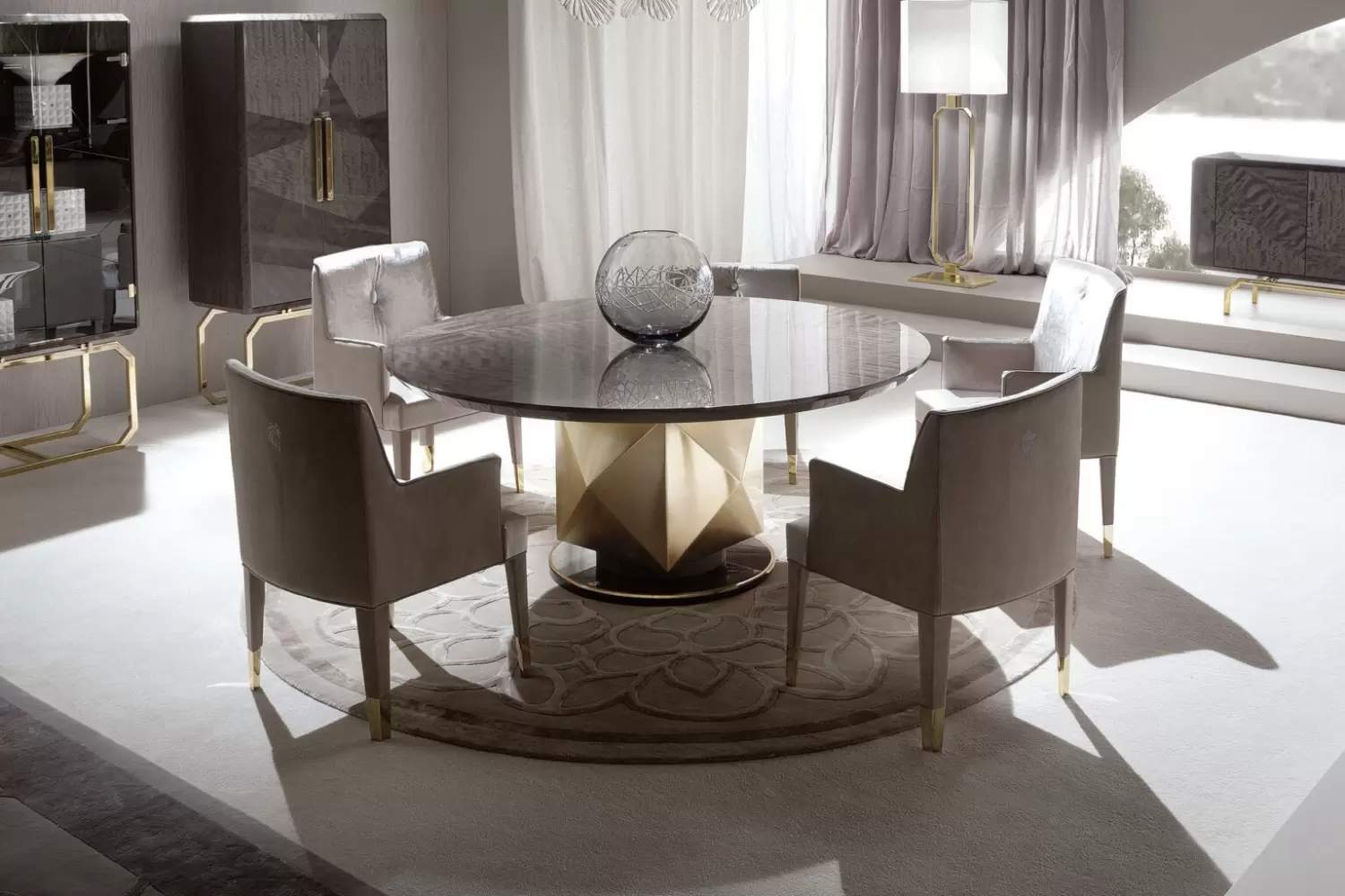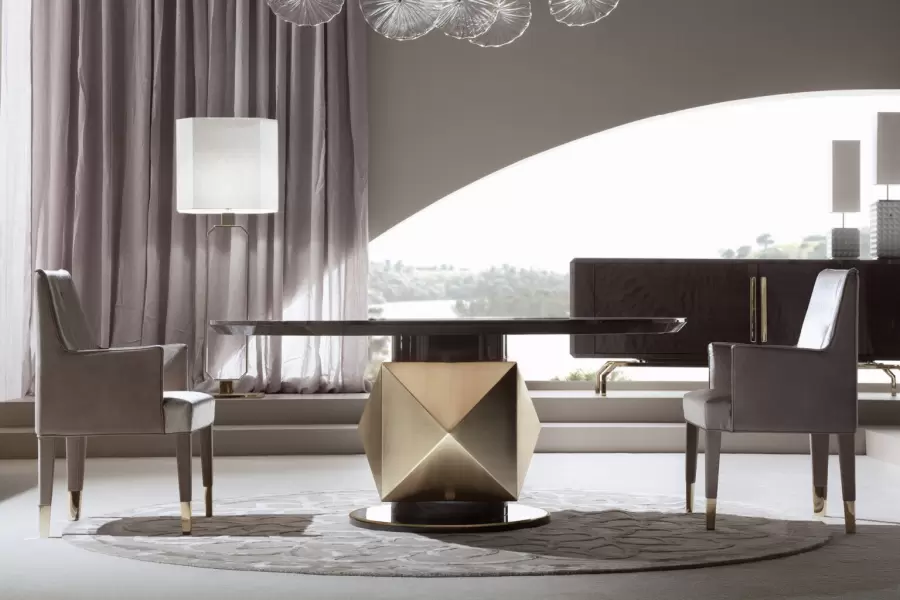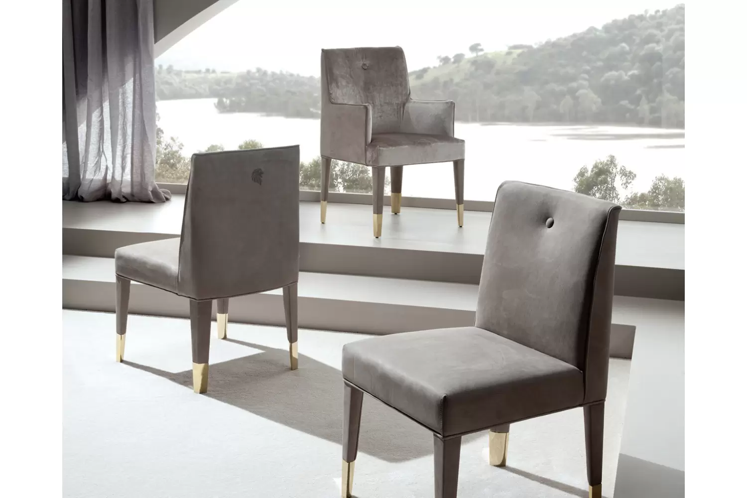 Infinity Armchair Fully upholstered arm chair. Back with Giorgio Collection logo. 4 legs in light gold chrome stainless steel. Measurements Art. 590/20 Size: cm 62W x 61D x 100H Size: 24’’½W x 24″’D x 39’’½H