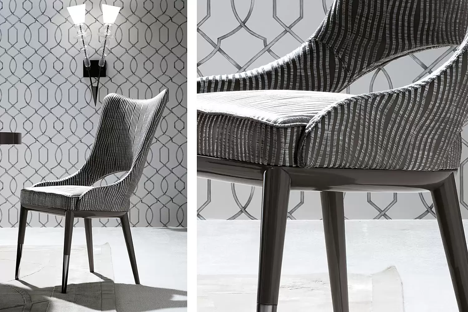 The two front legs feature a sleeve in black nickel steel, adding a contemporary flair to this elegant chair.