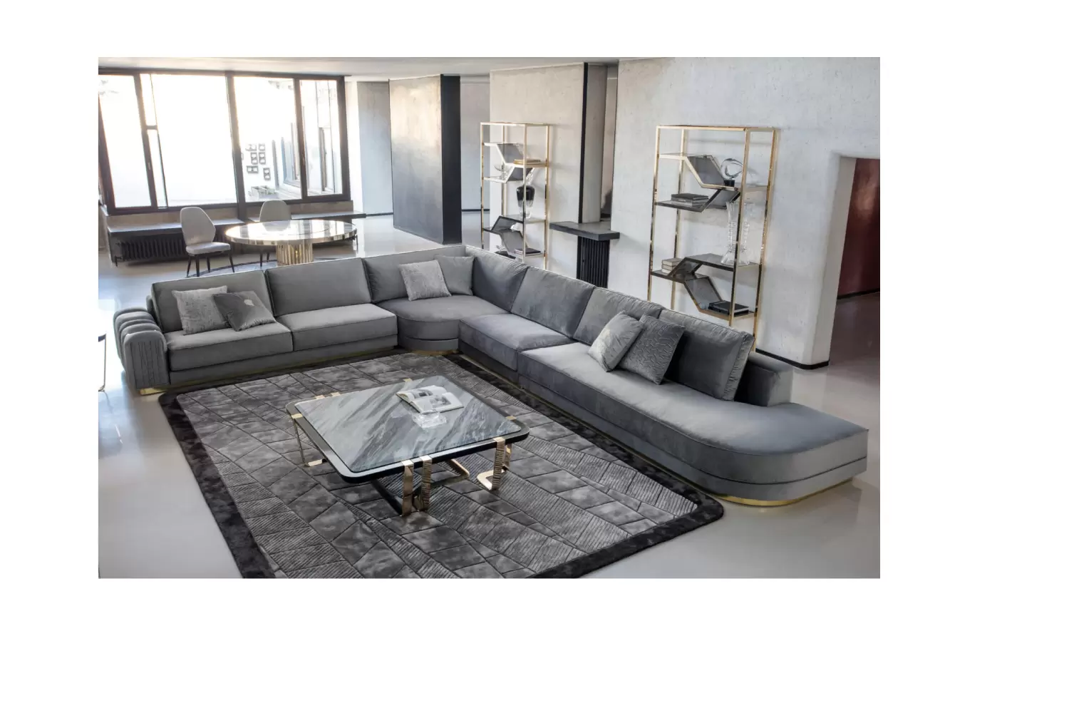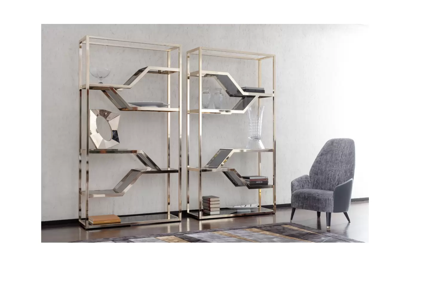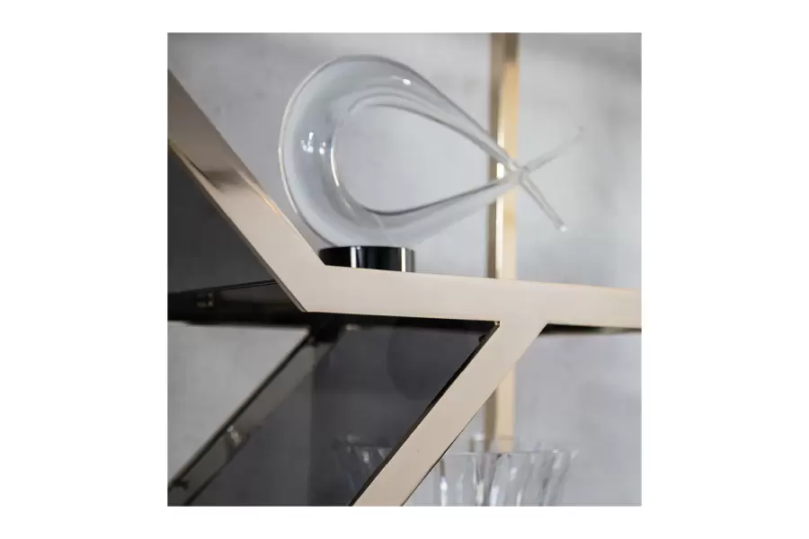 Charisma Bifacial Display Showcase Bifacial showcase in light gold chrome stainless steel frame. 9 tempered fixed smoked glass shelves. Measurements Art. 2894 Size: cm 120W x 40D x 210H Size: 47″W x 16″D x 82″½H