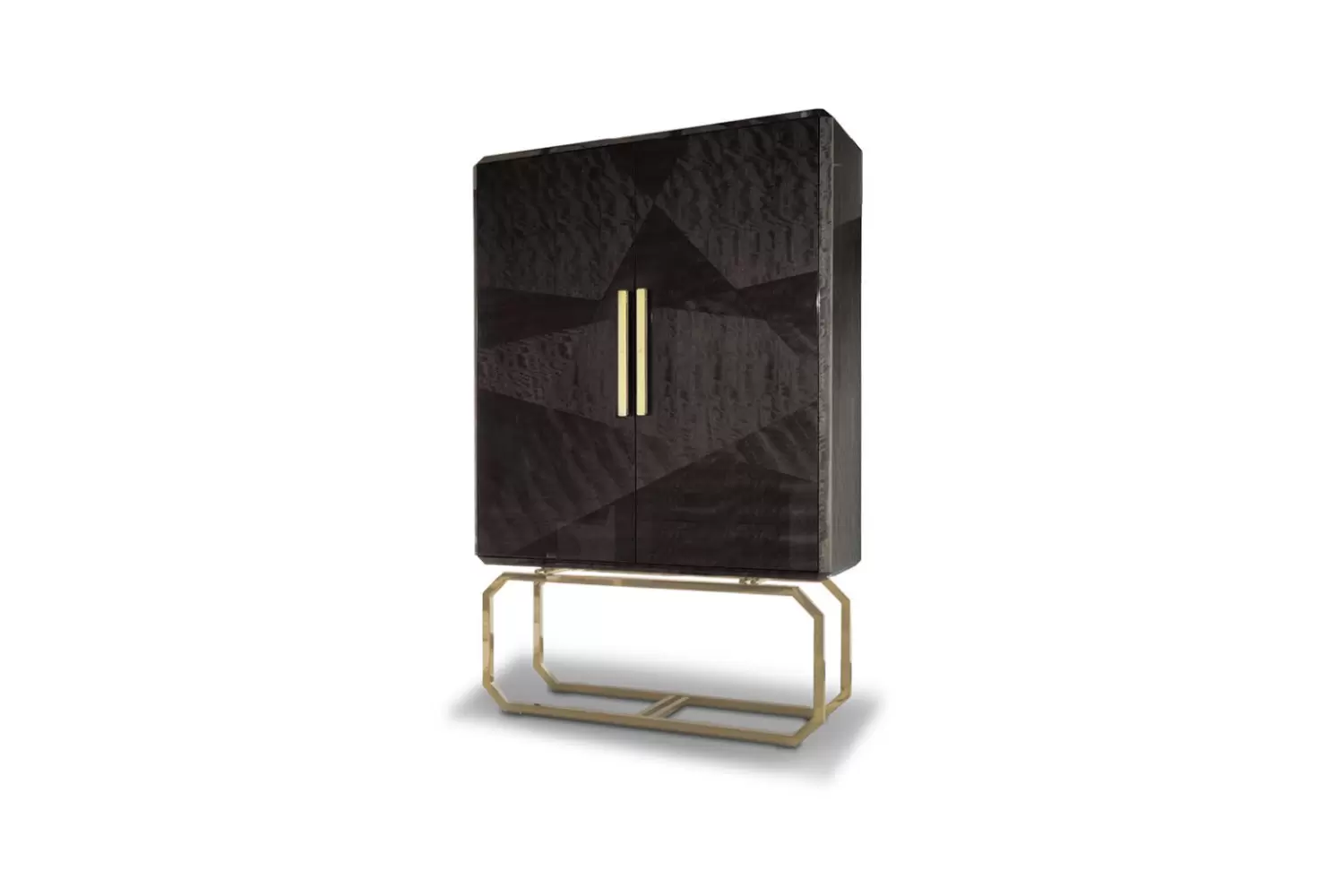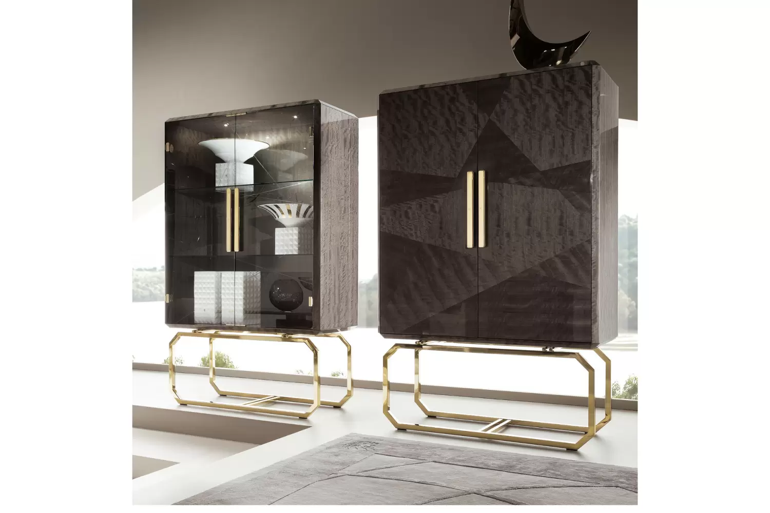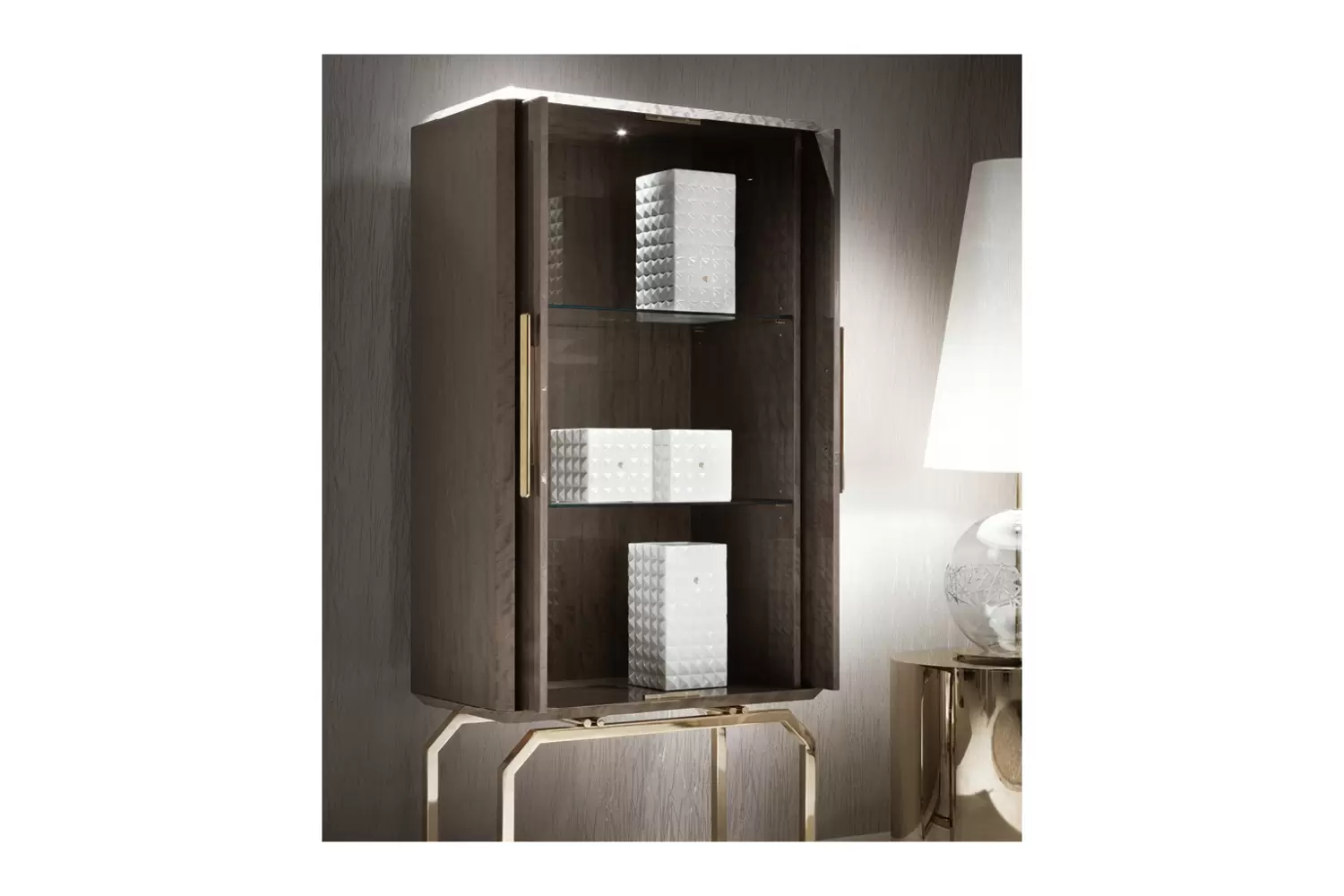 Vetrine with 2 inlaid wooden doors in makorè mahogany veneer with high gloss polyester finish.