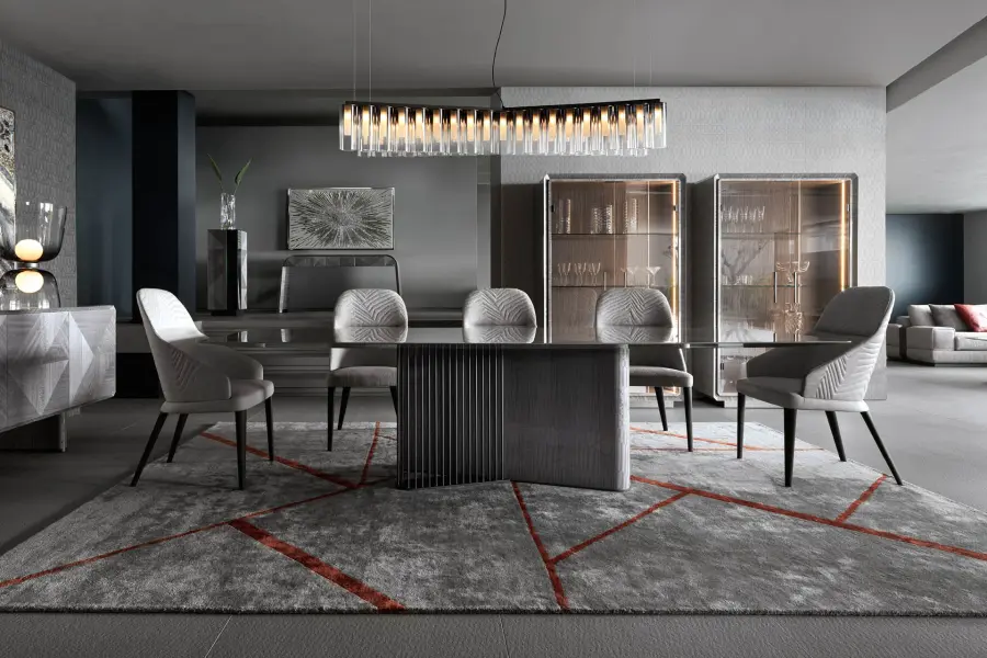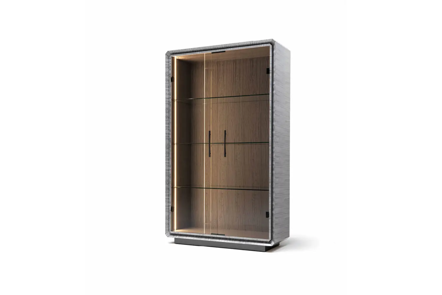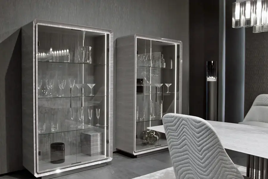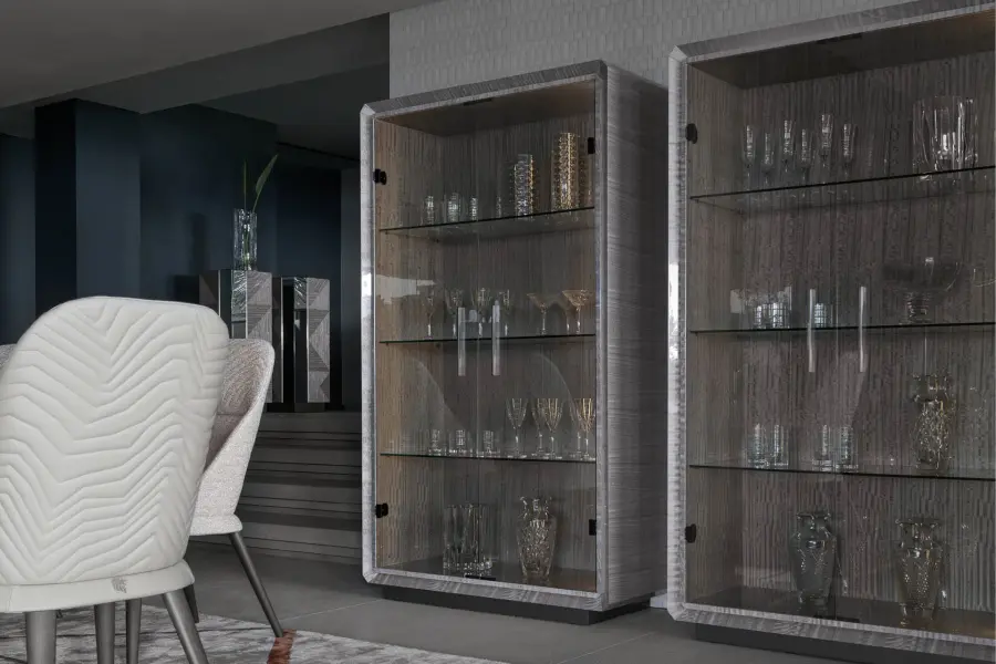 The Moonlight Vetrine epitomizes contemporary style and polished elegance. It features two glass doors and a structure in Tasmanian curly Eucalyptus veneer with a high gloss polyester finish. The base and handles are crafted from satin grey nickel stainless steel, adding a touch of sophistication.