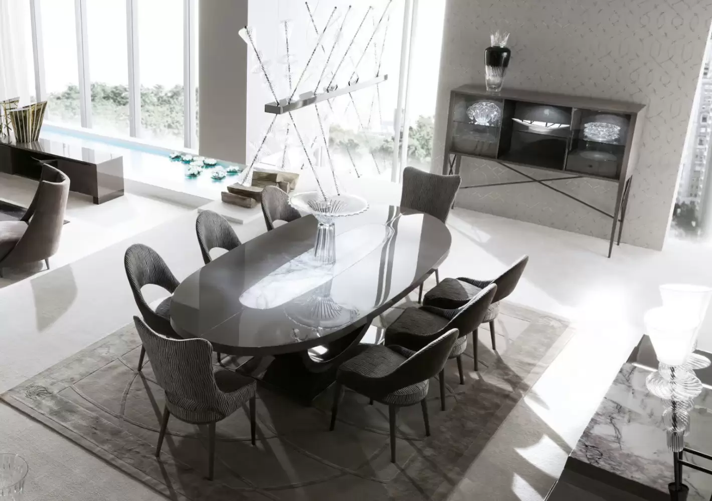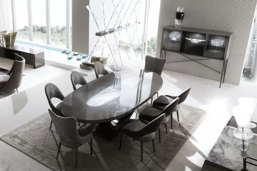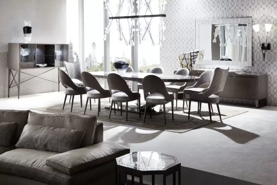 This bar unit includes two full extension drawers with fronts in nubuck leather and bottoms in velvet fabric, offering both style and functionality. With three adjustable interior shelves, details, legs, and handles in black nickel steel, this cabinet is a statement piece for any room.