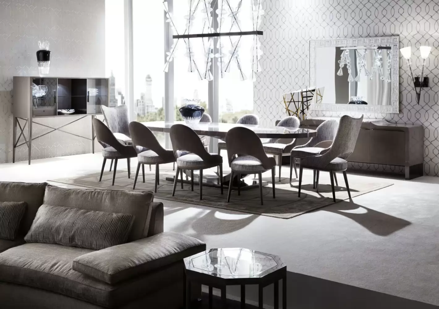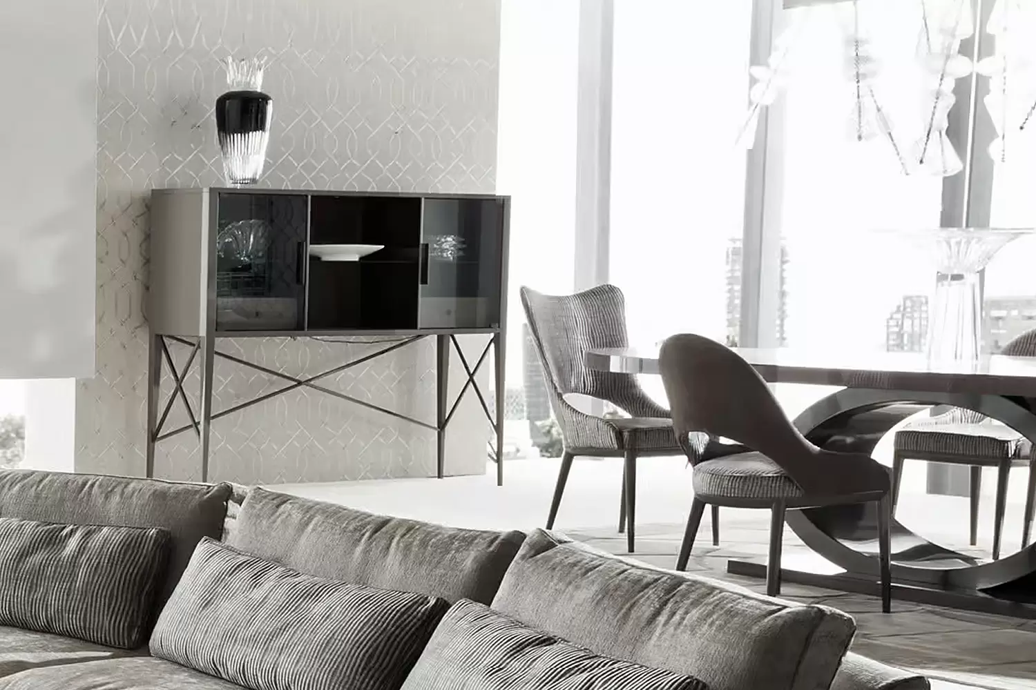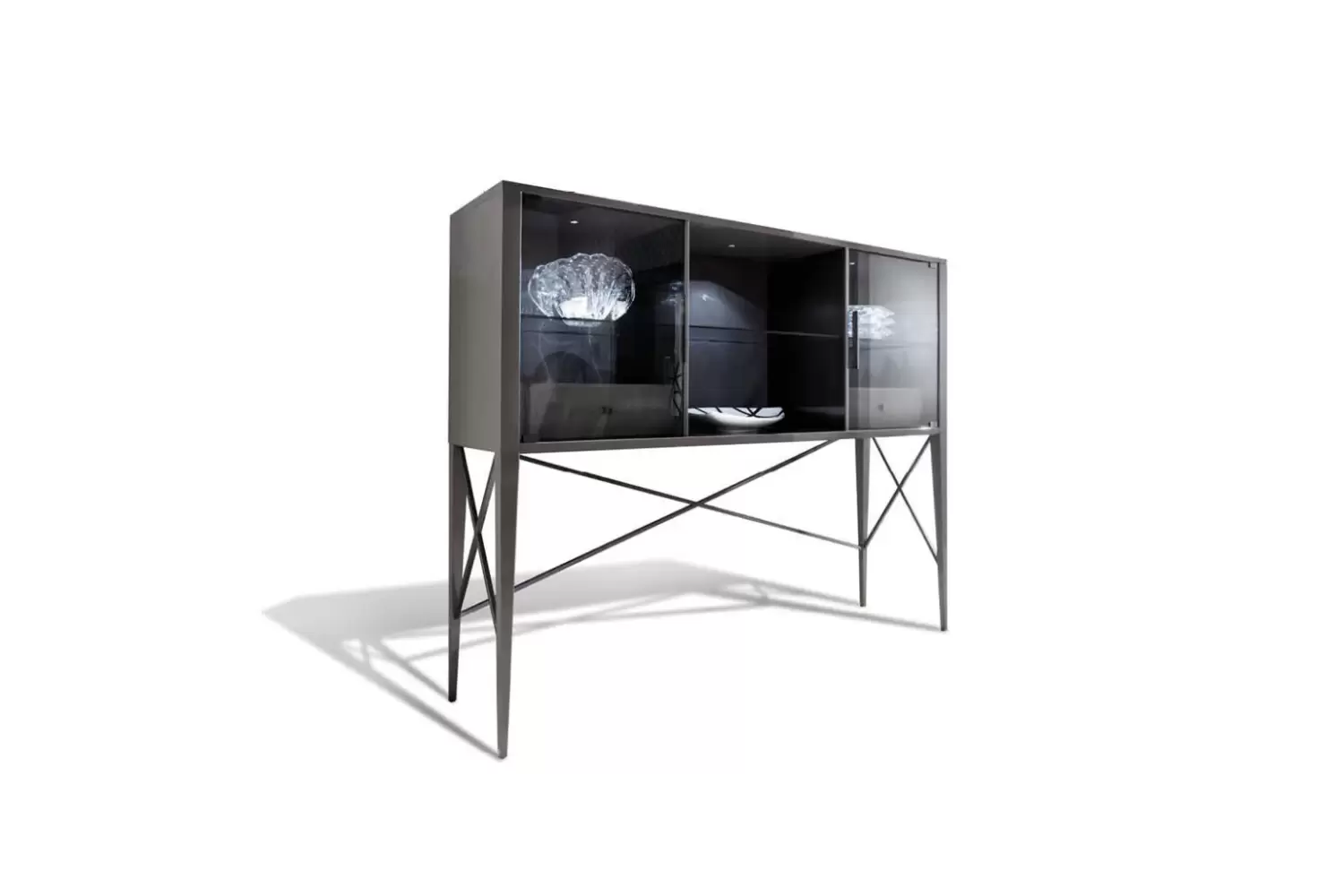 Introducing our elegant cabinet with two glass doors, featuring a center part upholstered in natural protected nubuck leather for a luxurious touch. The back central panel is also upholstered in nubuck leather.