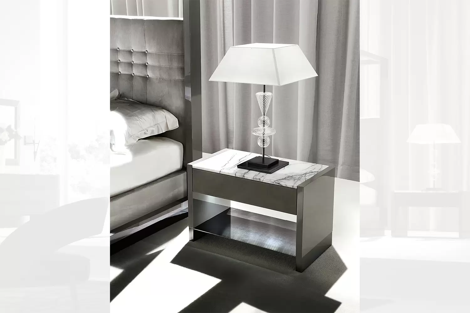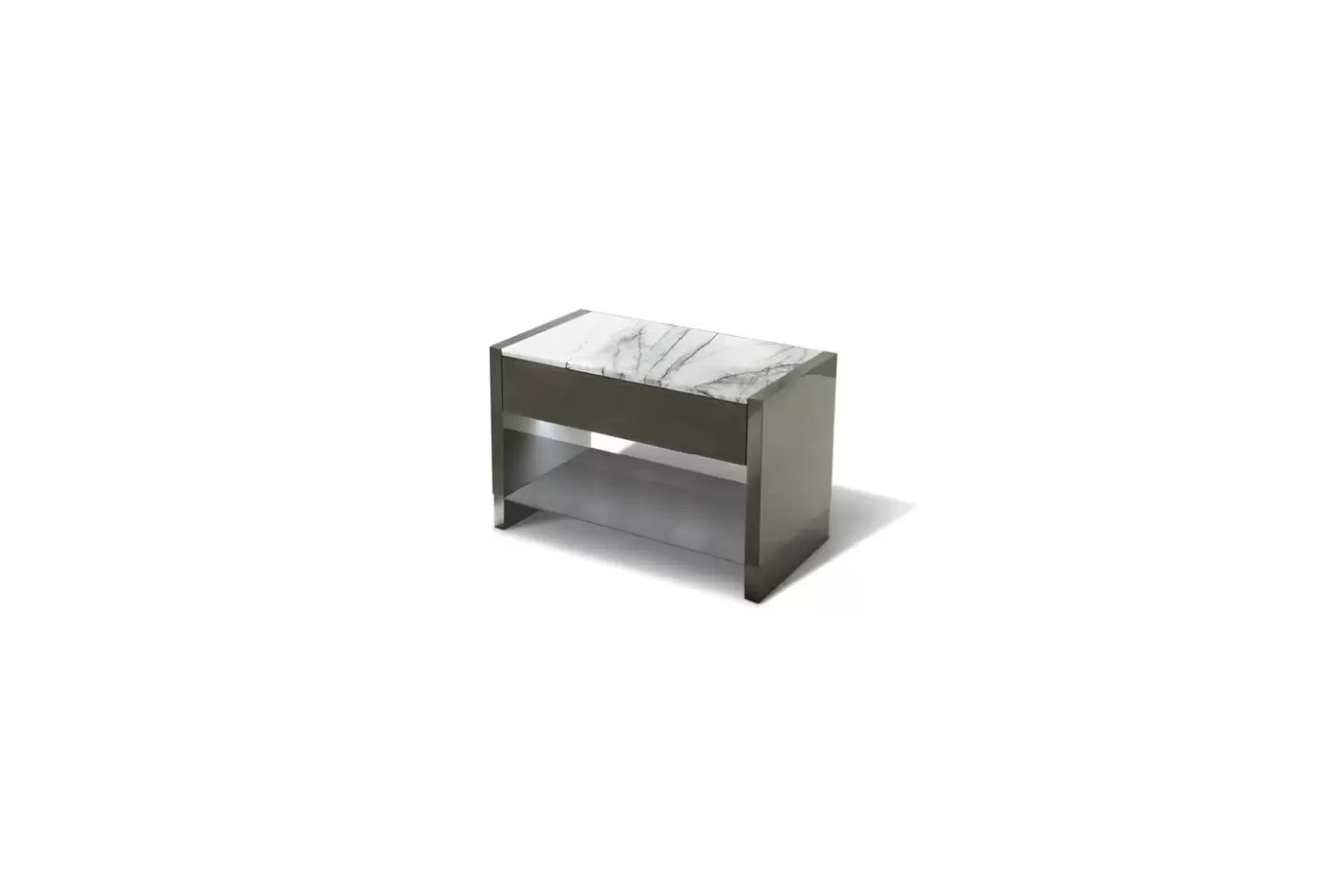 Enhance your bedroom with our Vision Night Table, featuring a high gloss polyester grey lacquer finish that exudes geometric balance and functional style.