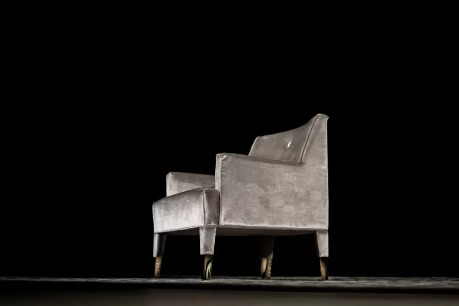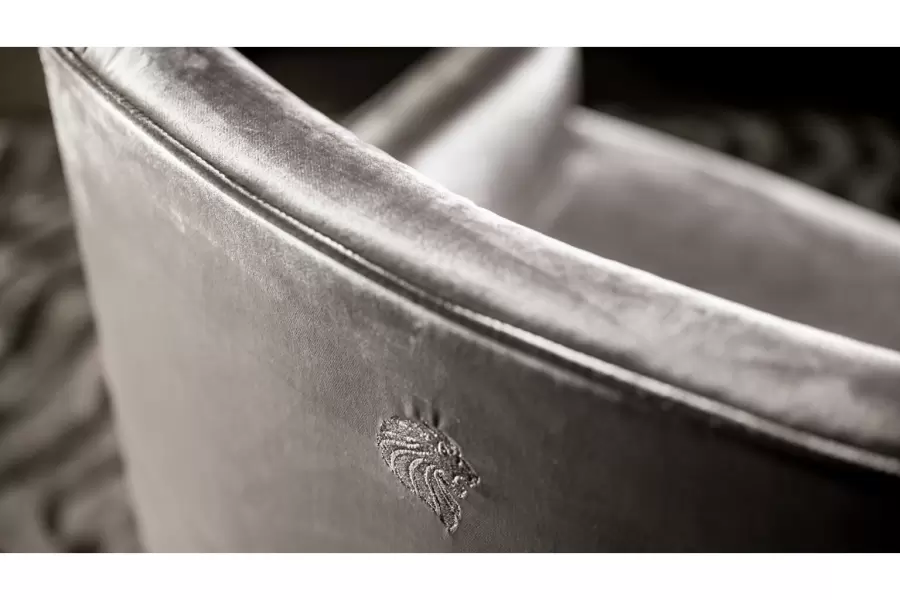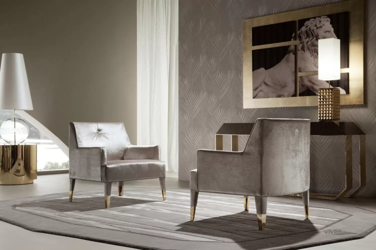 Infinity Occasional Arm Chair Fully upholstered occasional chair. Back with Giorgio Collection logo. 4 legs in light gold chrome stainless steel with Giorgio Collection logo. Measurements Art. 590/50 Size: cm 78W x 76D x 82H Size: 31″W x 30″D x 32″H
