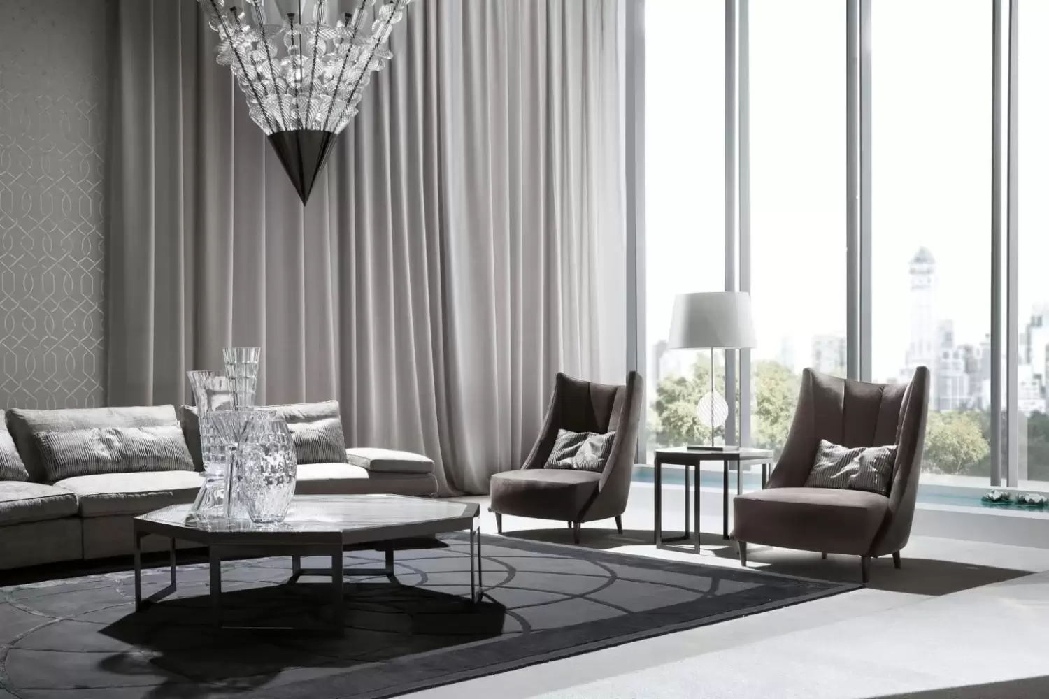 Elevate your space with our exquisite occasional armchair, featuring one back pillow filled with 100% down for ultimate comfort. The chair stands on four feet finished in high gloss polyester grey lacquer, adding a touch of sophistication to any room.