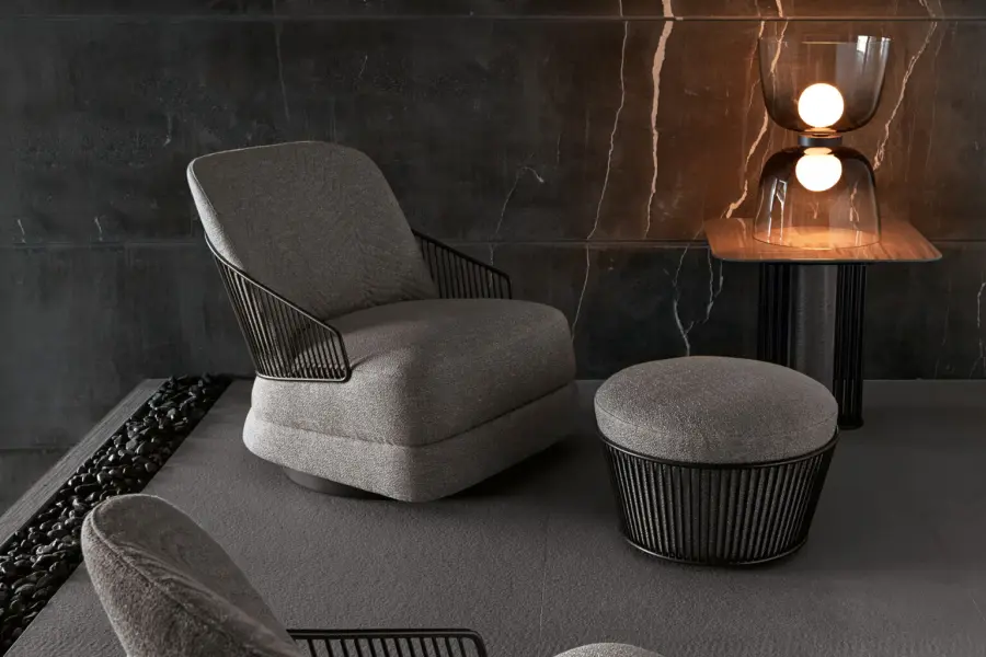 Add a touch of luxury to your living space with our round ottoman, perfect to use with our occasional swivel armchair. Crafted with precision and available in first-grade leather, nubuck leather, lizard-printed leather, velvet, or suede fabric, this ottoman is a statement of elegance.