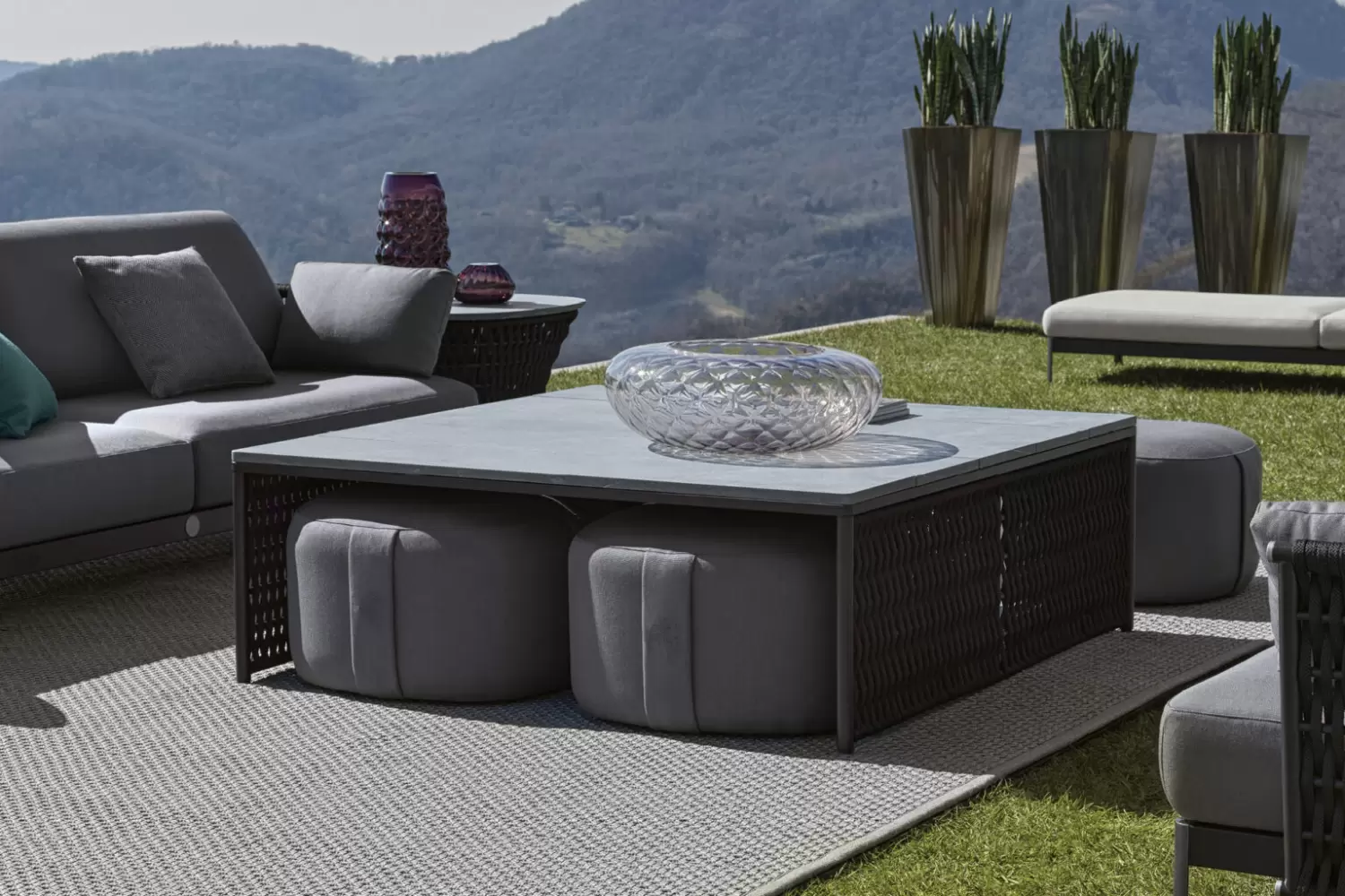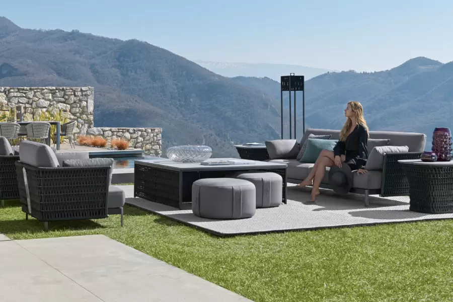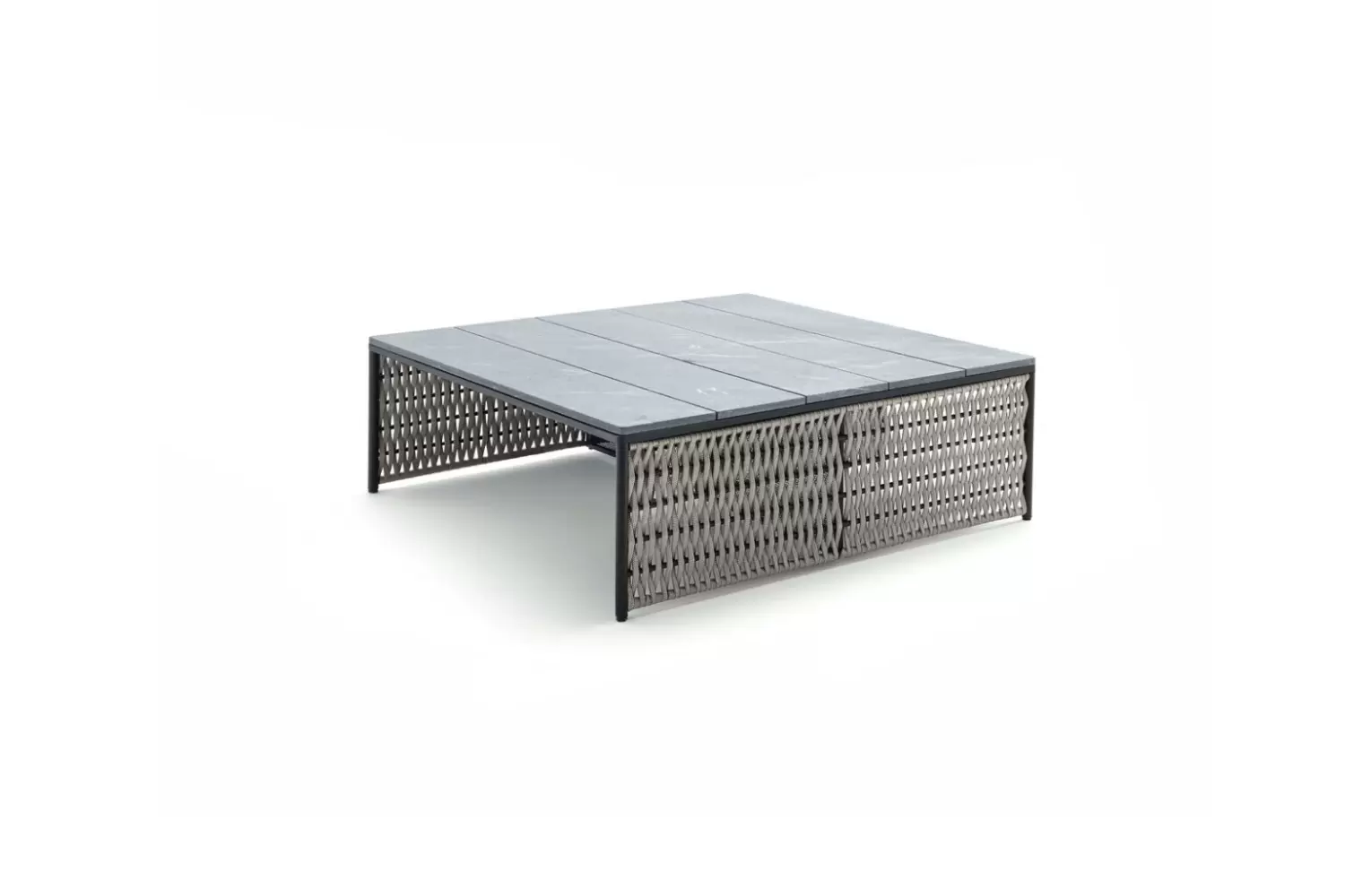 Outdoor square cocktail table in combination of satined black metal and black or light grey woven cordage.