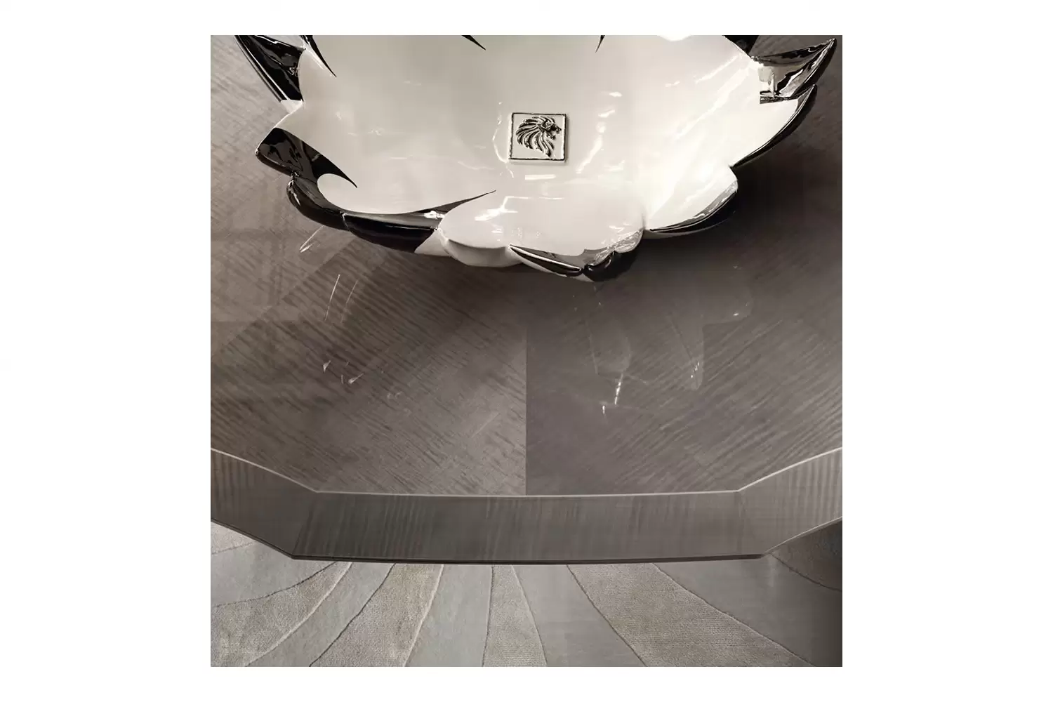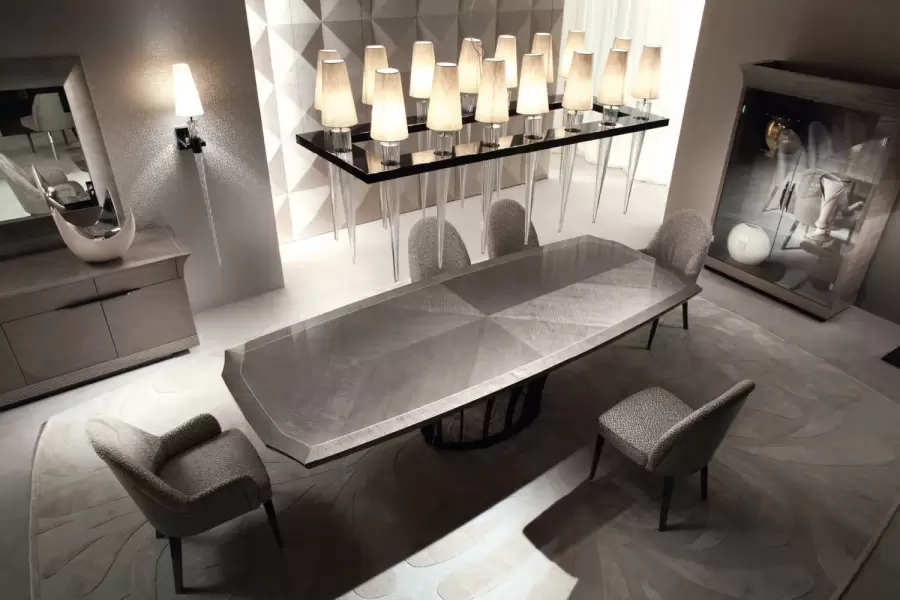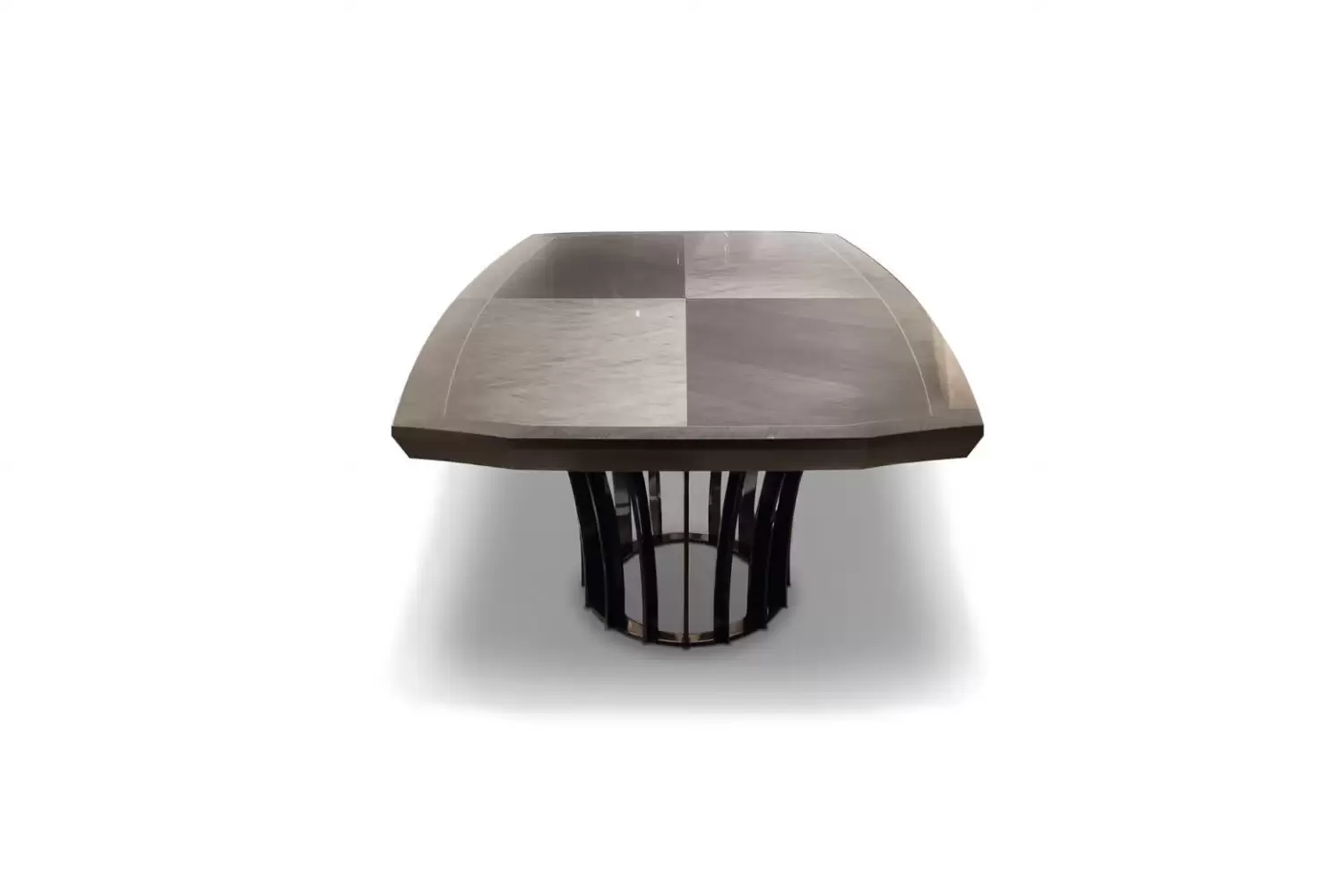 Alchemy table our exquisite boat-shaped oval table. Crafted from tiger African sycomore veneer with a high-gloss polyester finish, it exudes sophistication. The fixed top features a stunning white maple fine line inlay, while the stainless steel base in storm dark grey finish adds a modern touch.