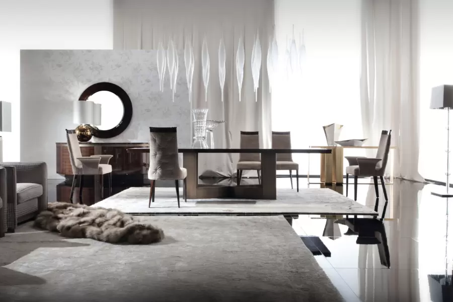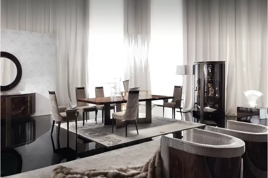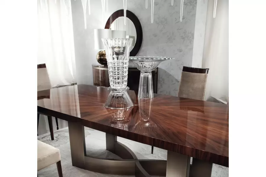 Elevate your dining experience with our exquisite Brazilian rosewood table. Crafted with a high-gloss finish and bronzed stainless steel base, it exudes timeless sophistication, perfect for refined home dining.