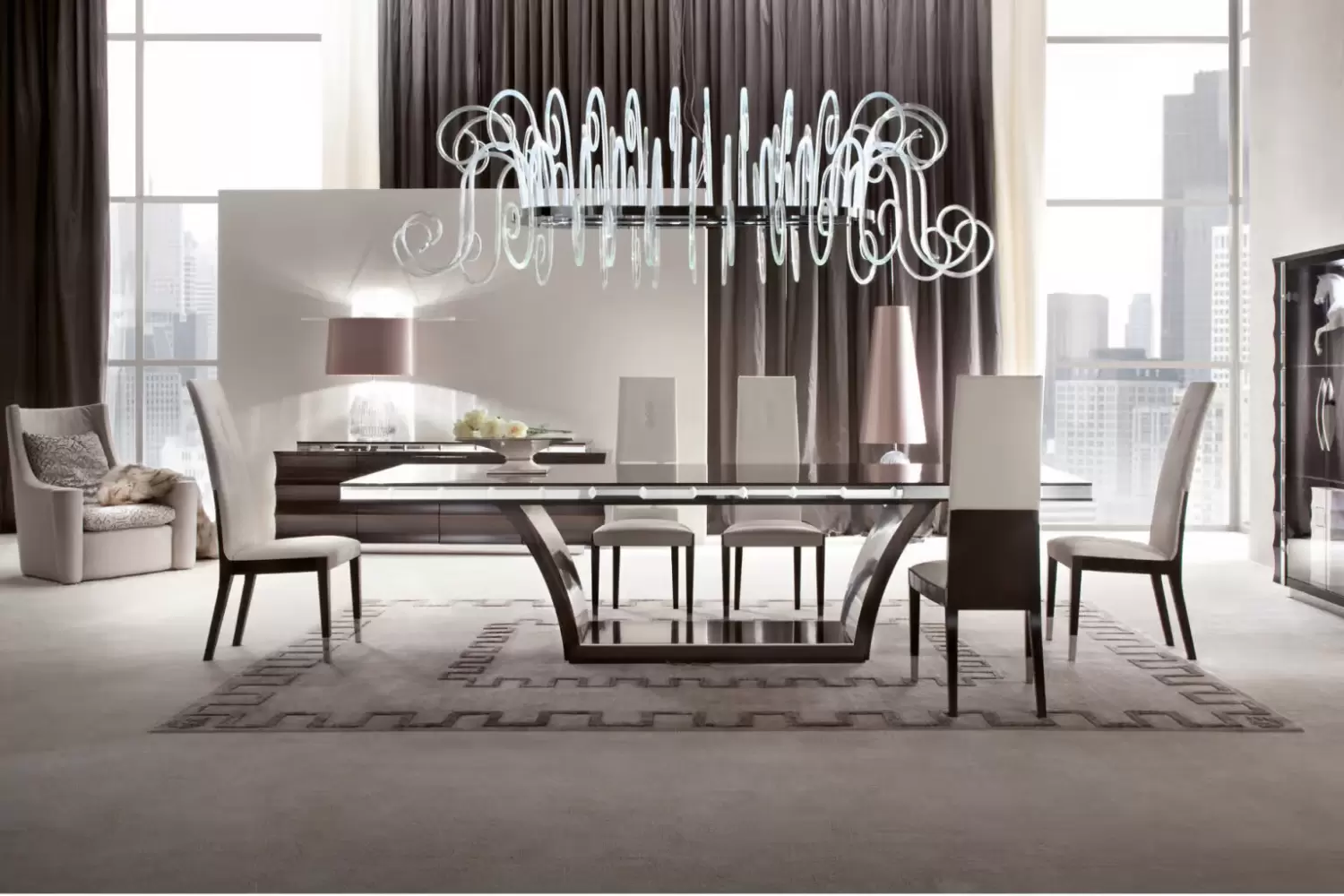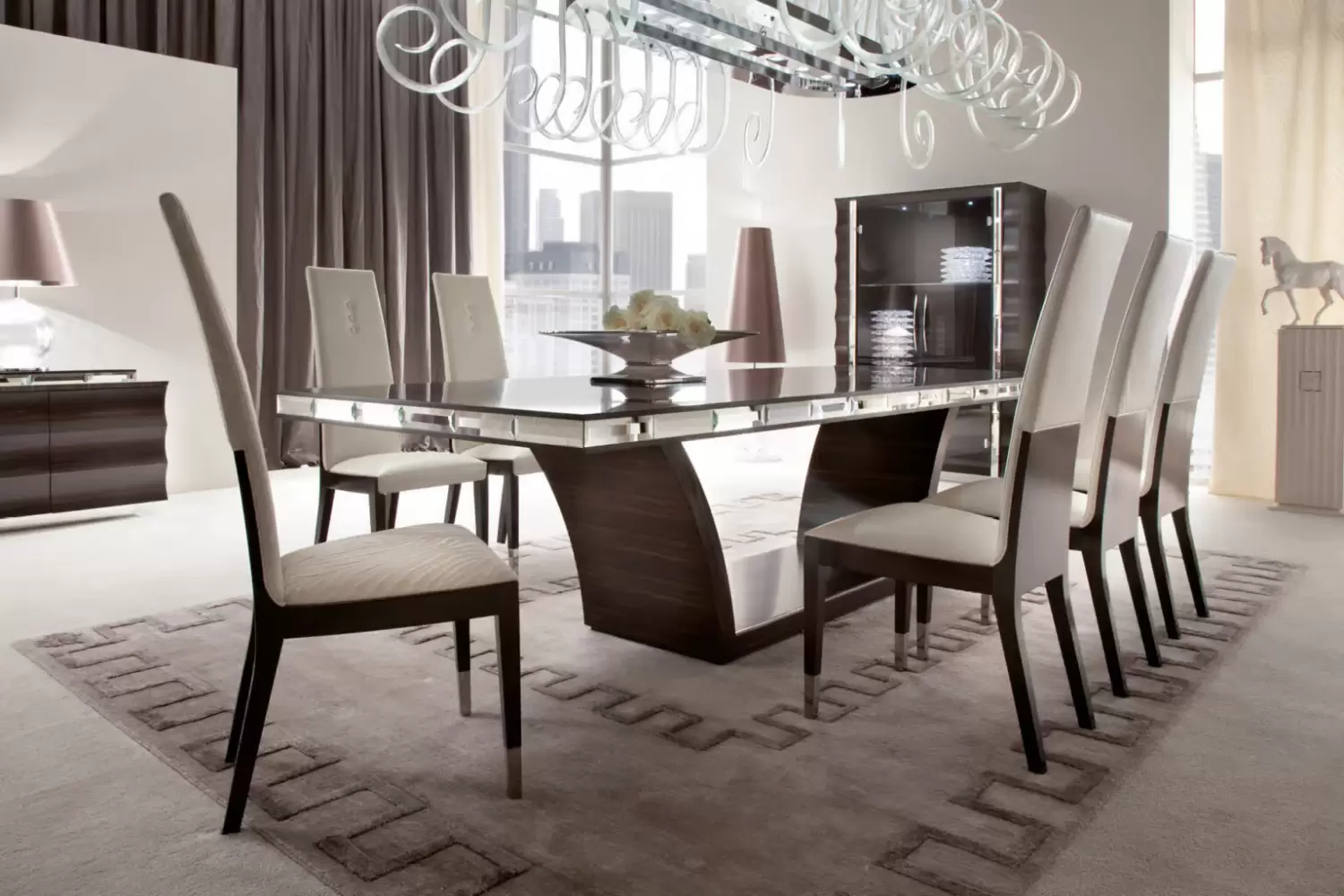 Crafted from luxurious Makassar ebony veneer, Daydream rectangular table features a sleek satin finish and stunning beveled mirrors along the edges for a touch of glamour and sophistication.