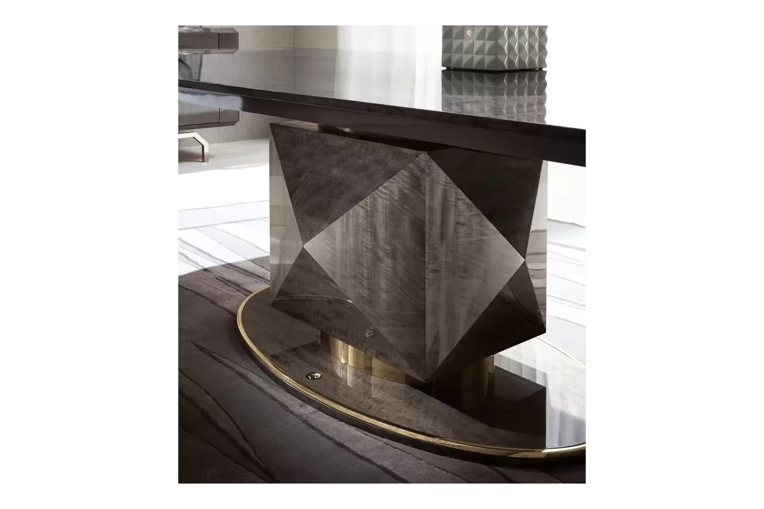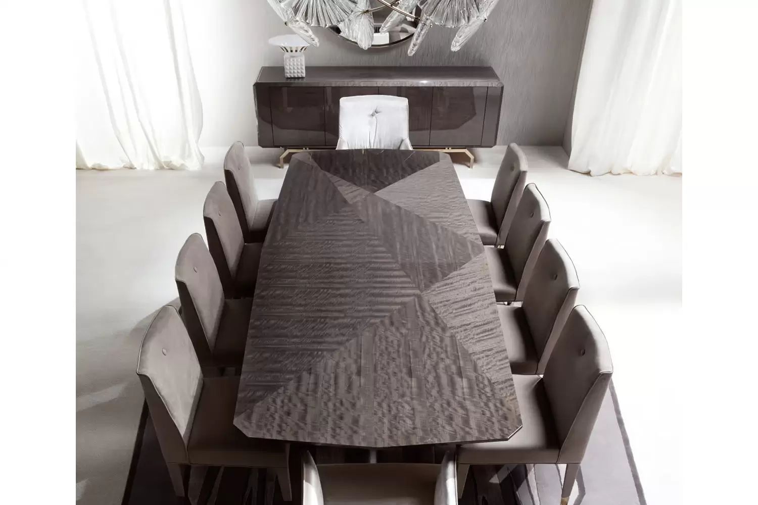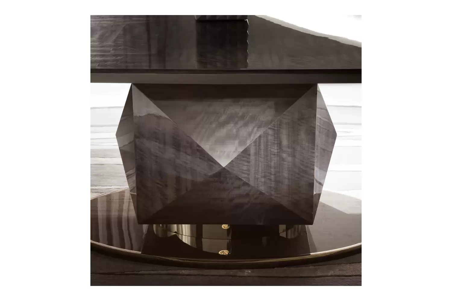 Experience luxury dining with the "Giorgio Collection" rectangular table. Crafted from makorè mahogany veneer with a high-gloss finish, adorned with inlaid details, and supported by a sturdy wooden base with light gold chrome stainless steel accents.