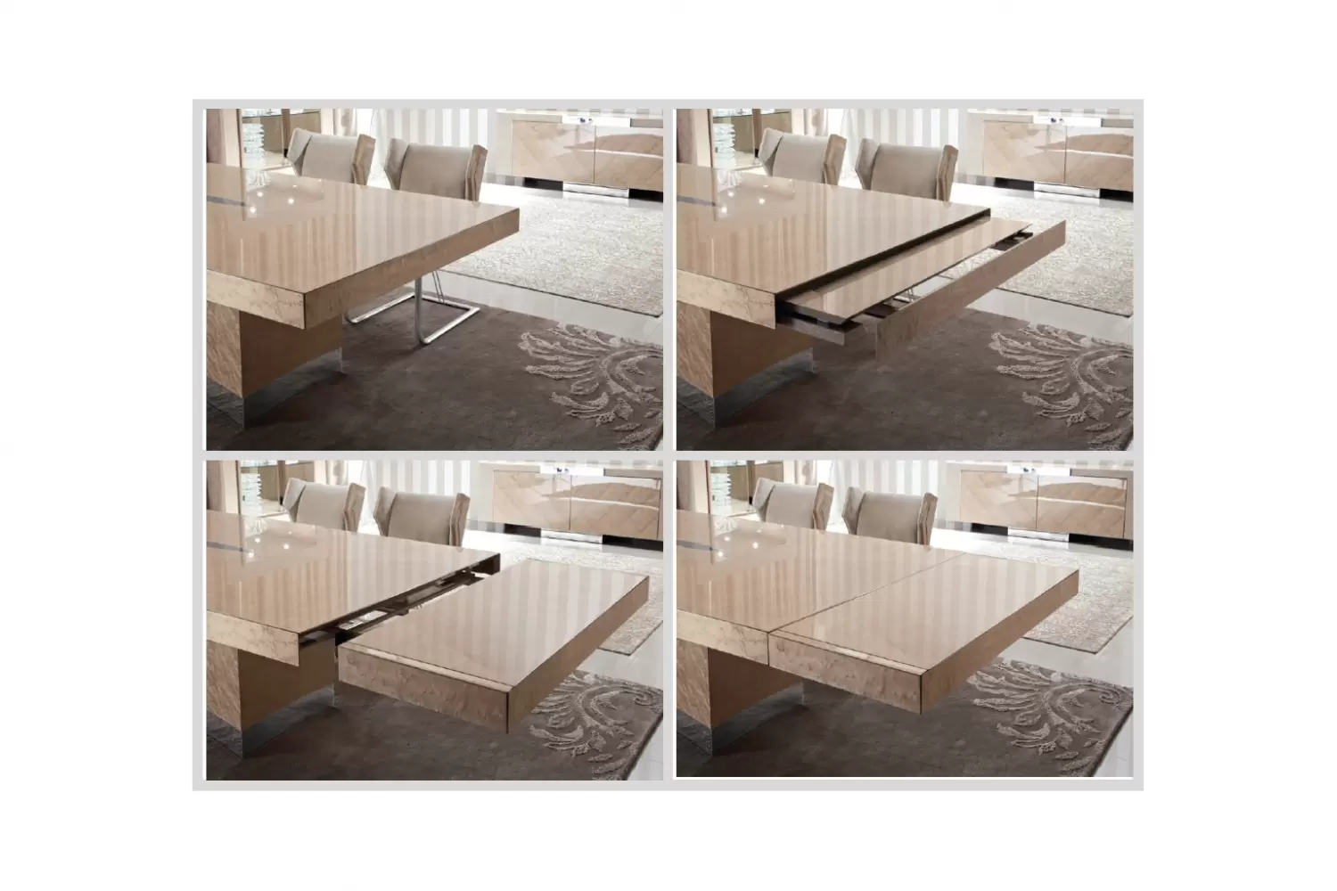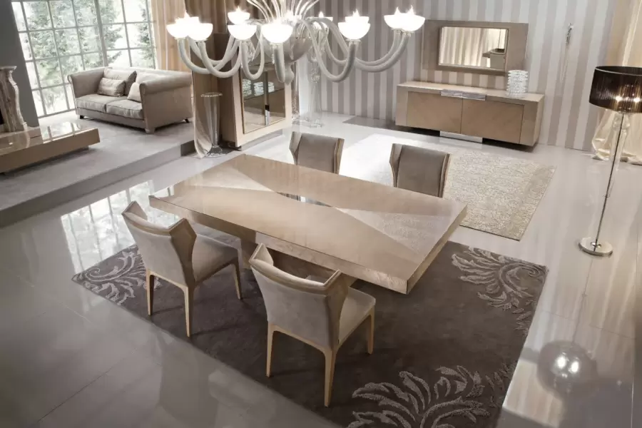 Our exquisite Rectangular Table crafted from Champagne Bird’s Eye Maple Veneer, adorned with a high gloss polyester finish for a luxurious sheen.