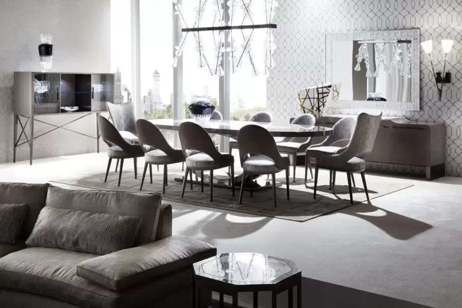 The table boasts a luxurious marble top insert, exuding elegance and sophistication. With details and base in black nickel steel, this dining table is both stylish and durable, perfect for entertaining guests or everyday meals.
