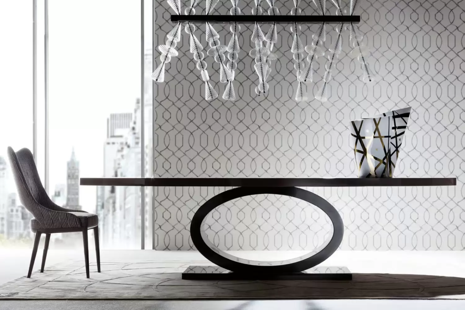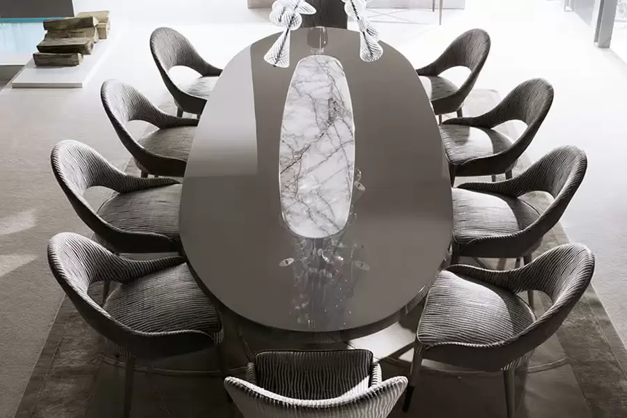 Upgrade your dining experience with our Vision oval dining table, featuring a high gloss polyester grey lacquer finish that adds a modern touch to any dining room.