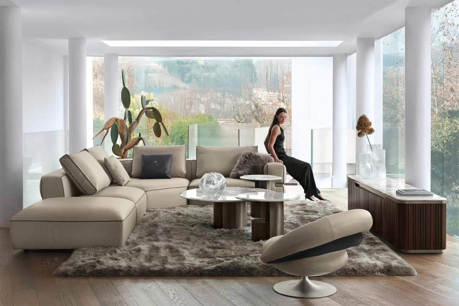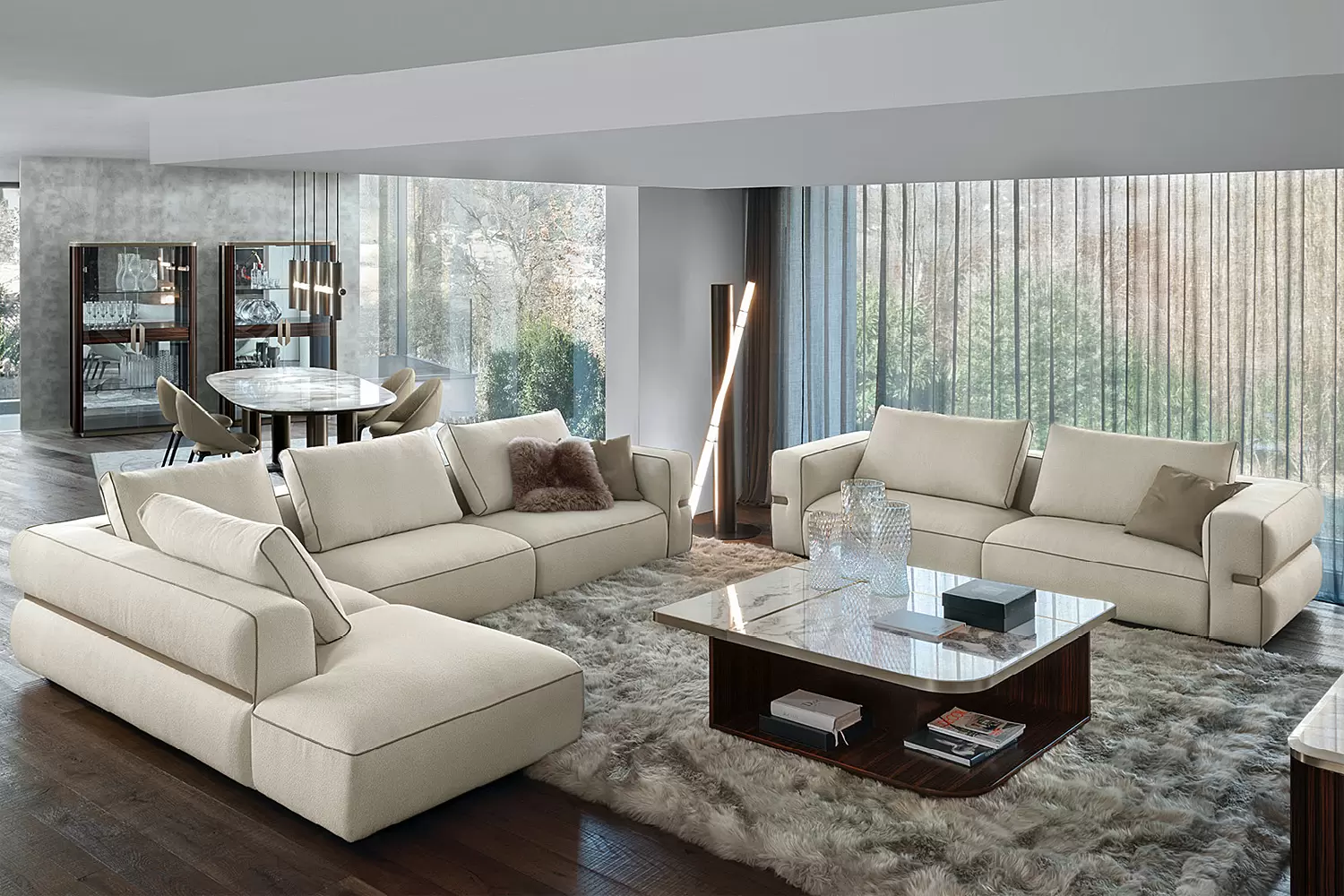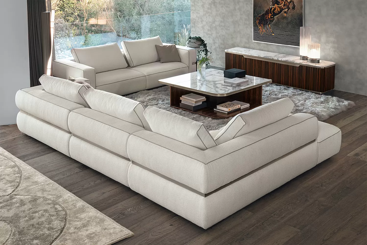 Choose from 2-, 3-, or 4-seater layouts, with optional integrated marble side shelves, for a fully customizable Made in Italy modular sofa.