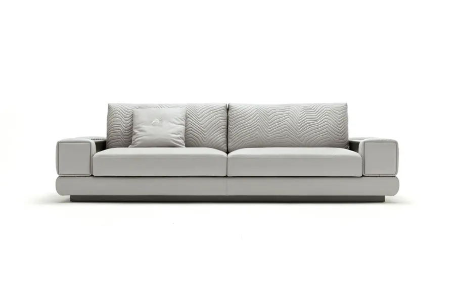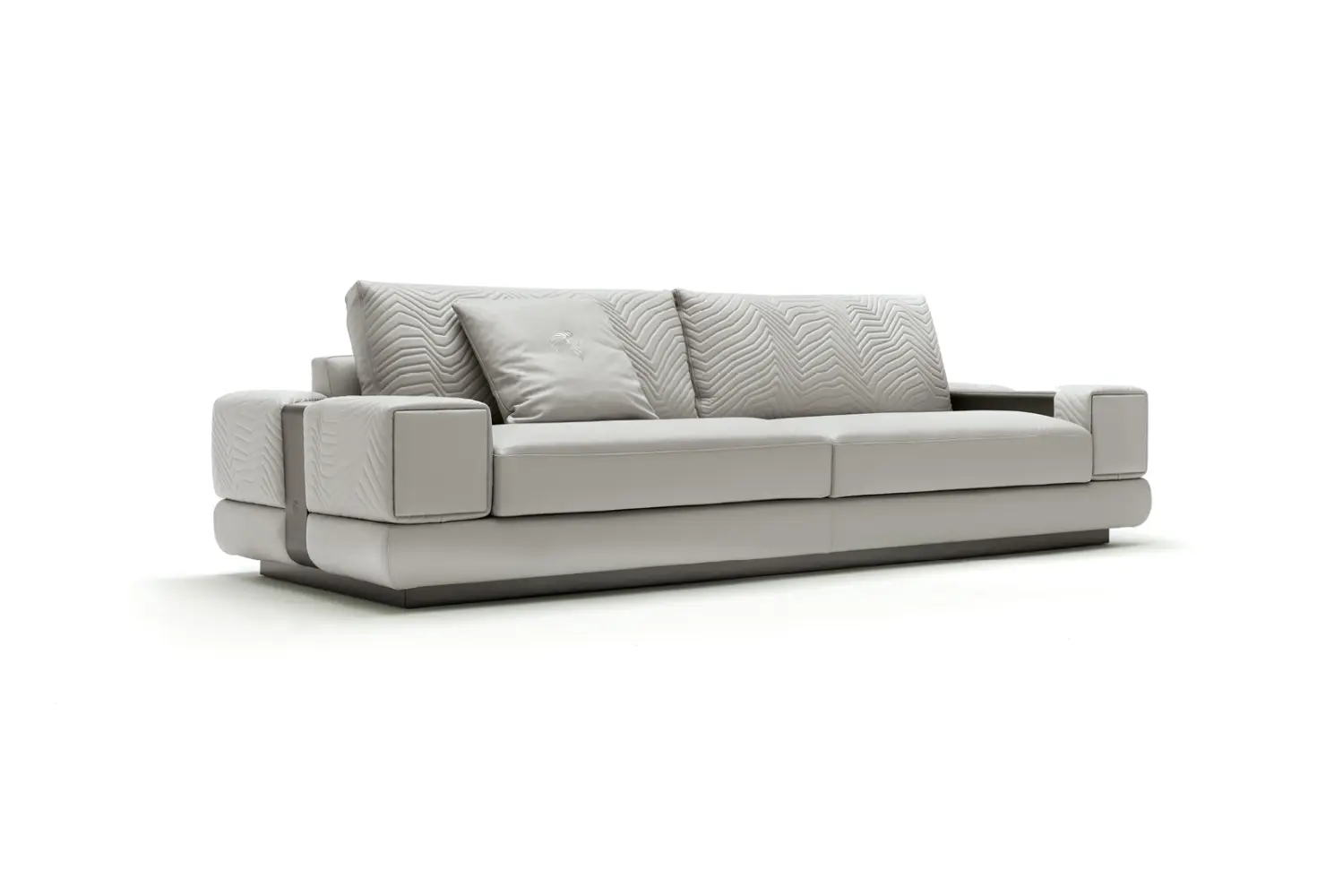 The quilted back and armrests add a touch of luxury, while the metal band in the armrests, paired with the satin grey nickel stainless steel base and bands, elevate its design to new heights of sophistication. Experience the epitome of luxury with this exquisite sofa.