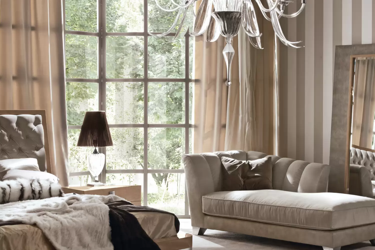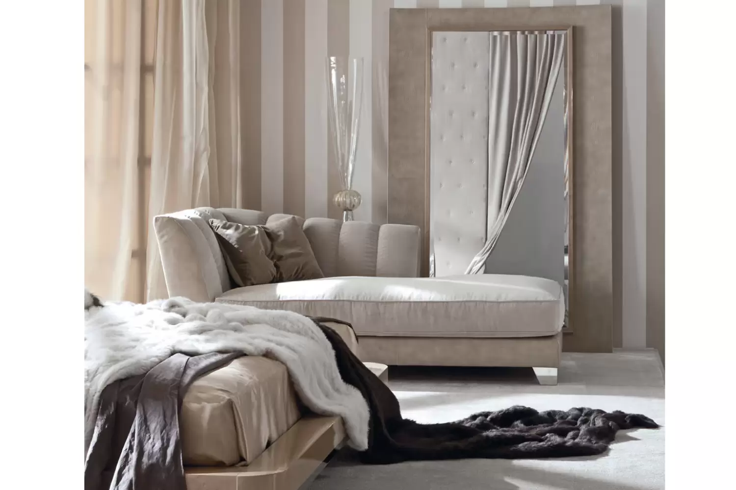 Sunrise Chaise Lounge, available in right or left side facing options. This exquisite piece combines iguana printed leather and velvet for a unique and sophisticated look.