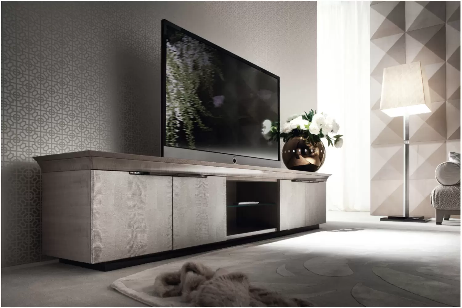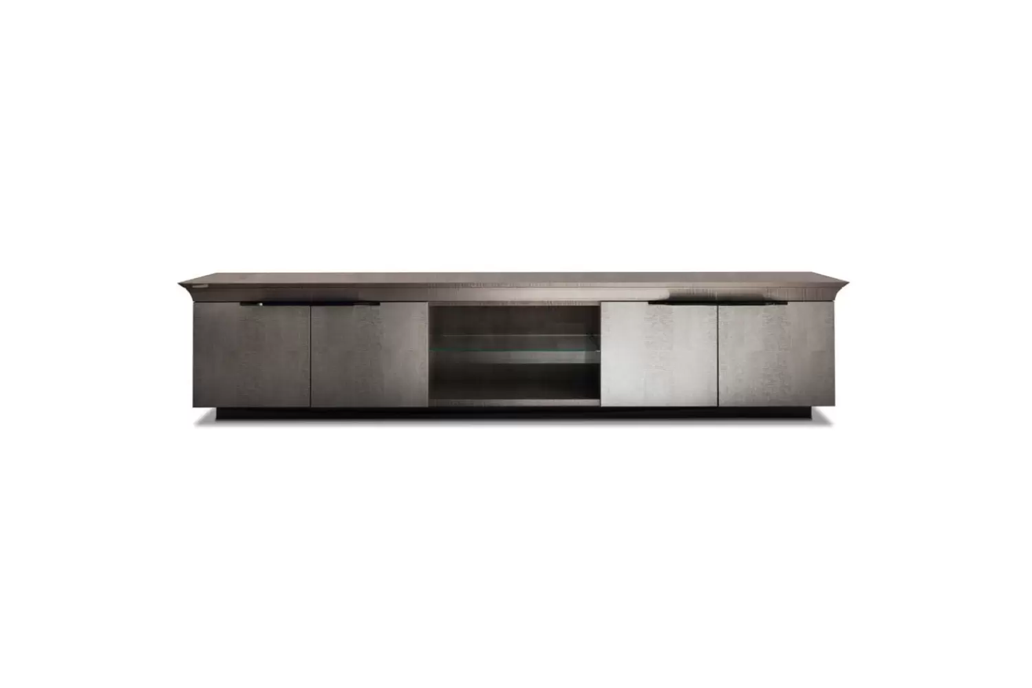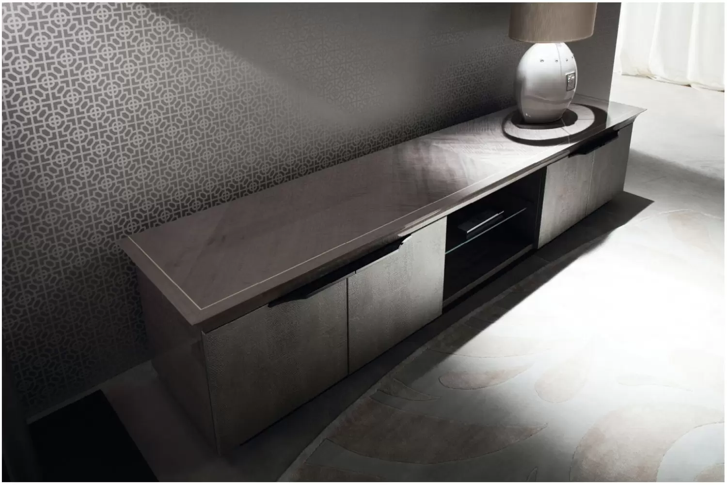 4 doors in silver lizard printed leather and 1 open space. 1 center glass shelf and 2 lateral glass shelves. Base and handles in stainless steel in storm dark grey finish.