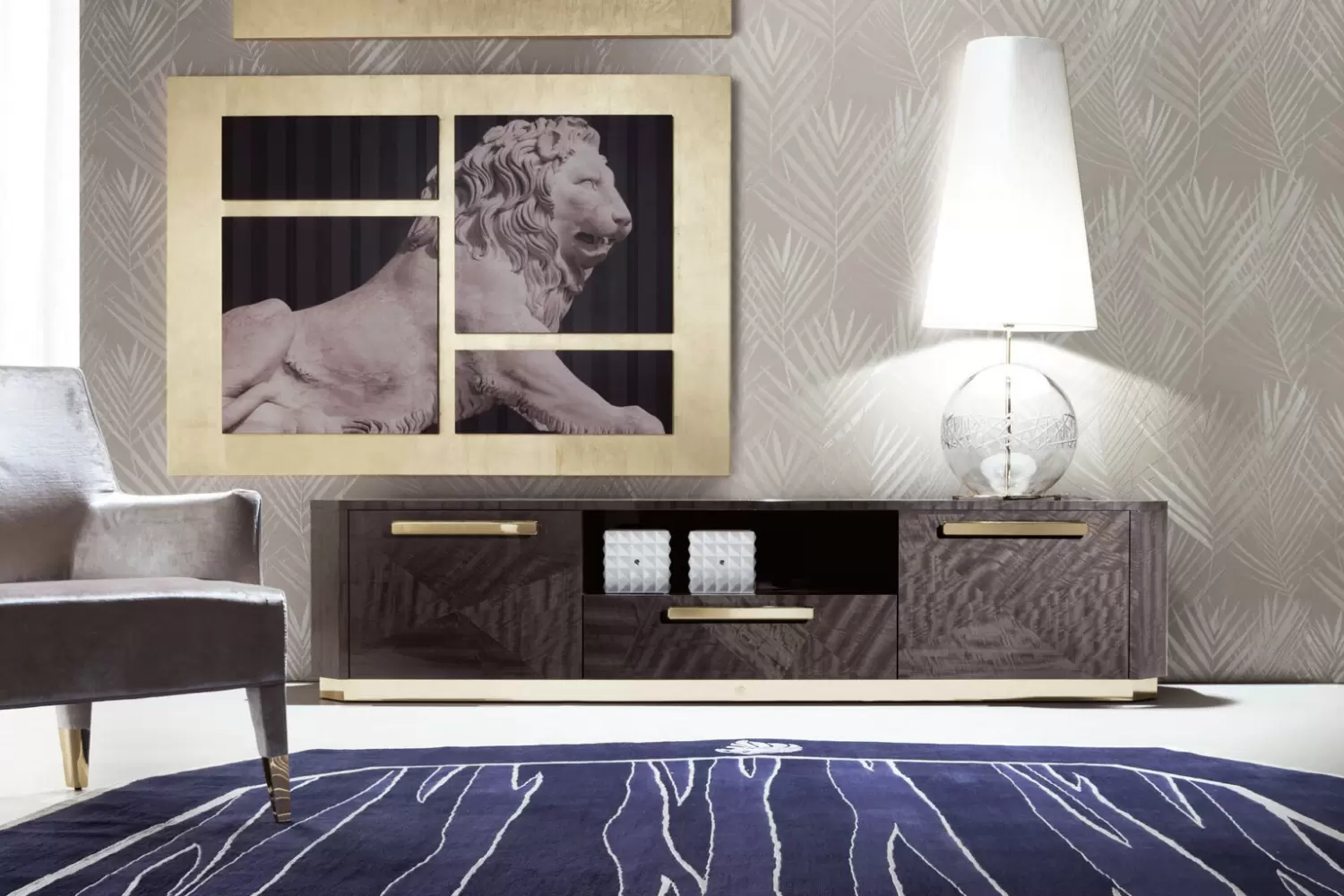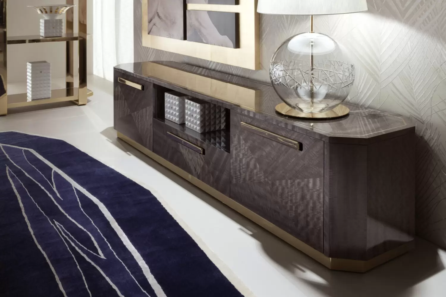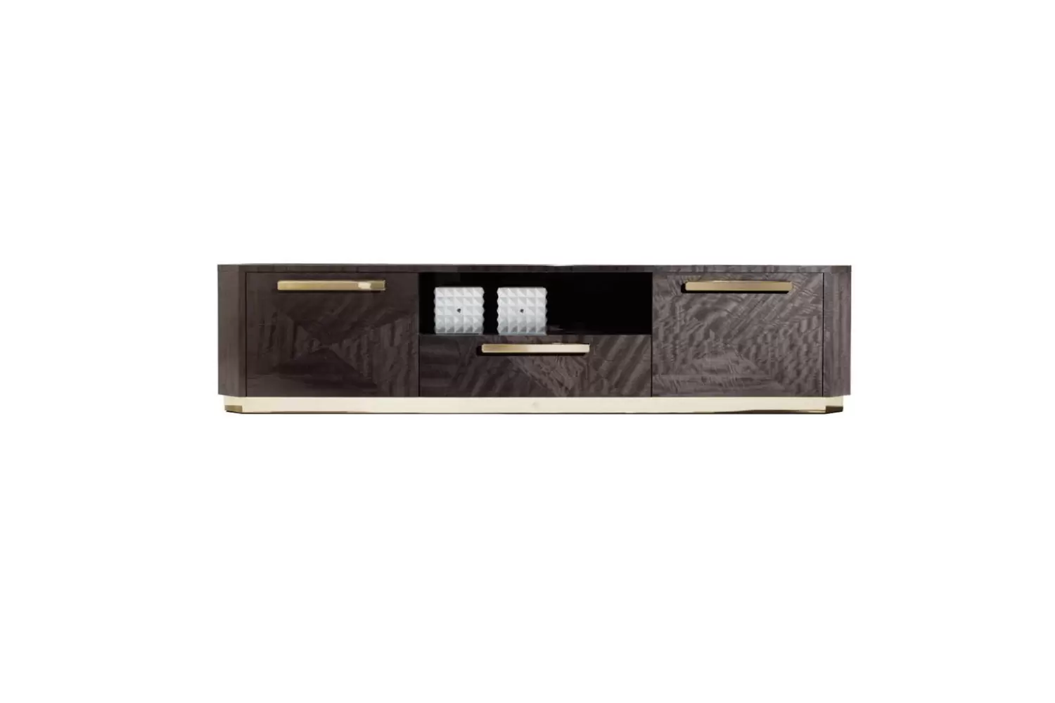 Base for T.V. unit in makorè mahogany veneer with high gloss polyester finish.