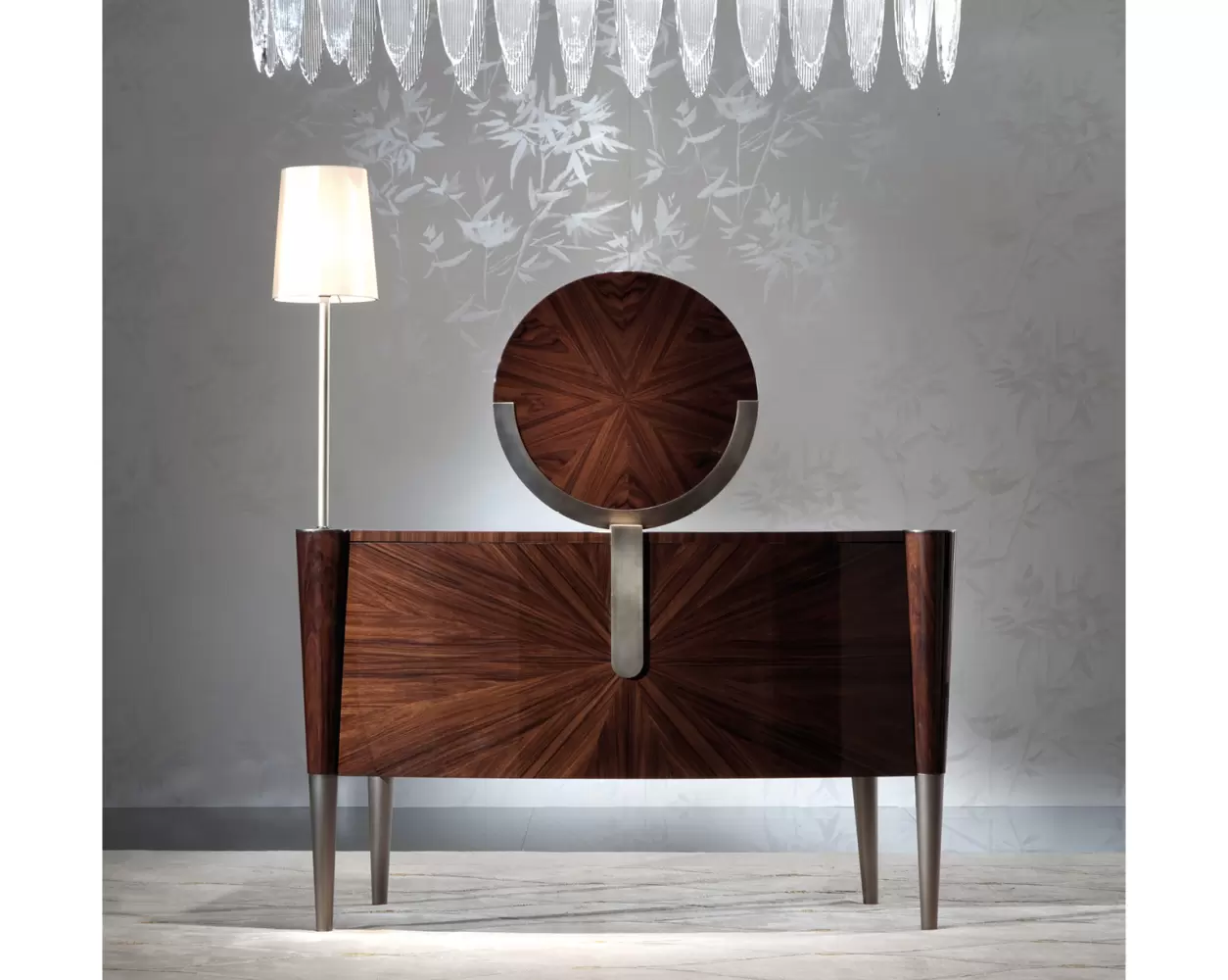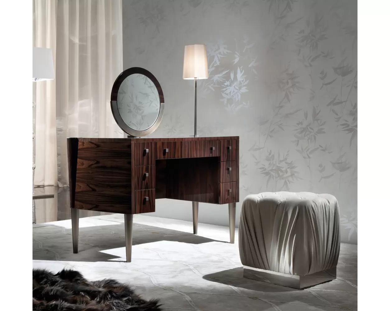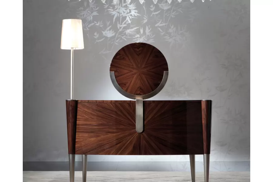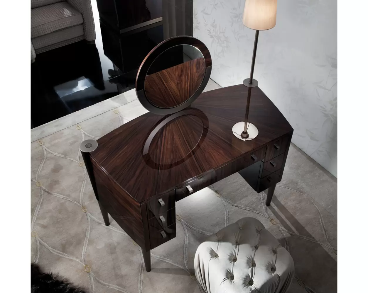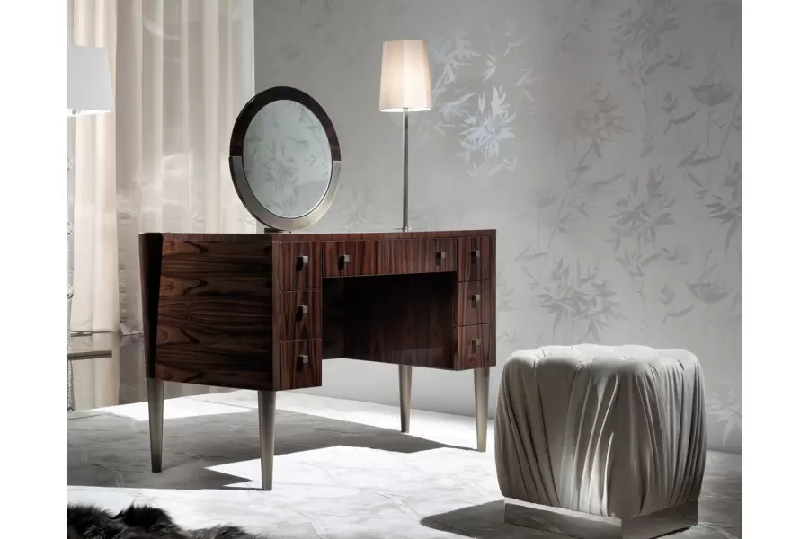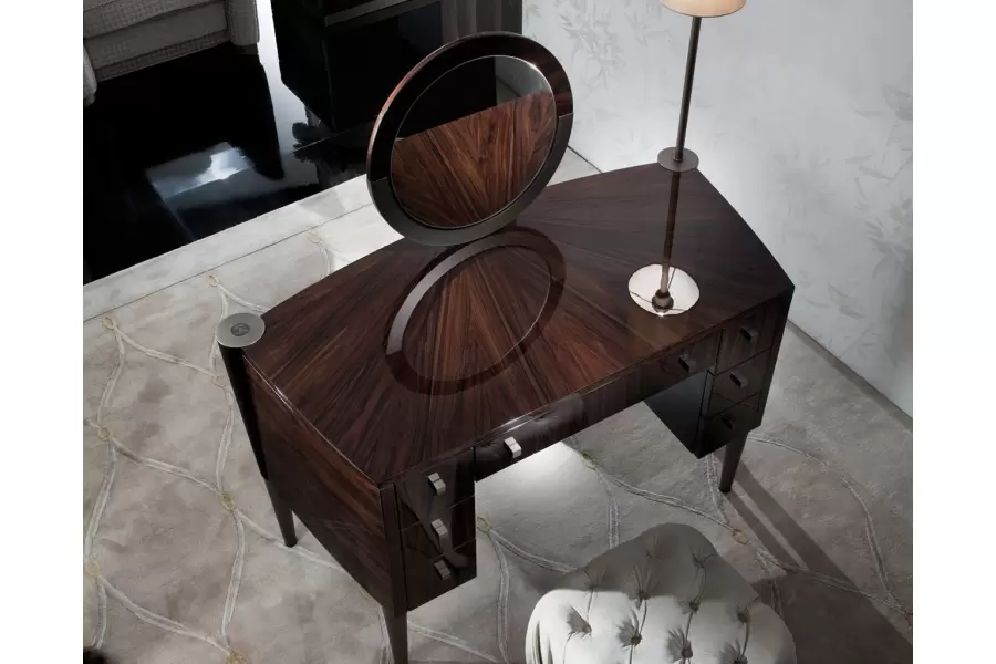 Vanity desk in Brazilian rosewood veneer with high gloss polyester finish.